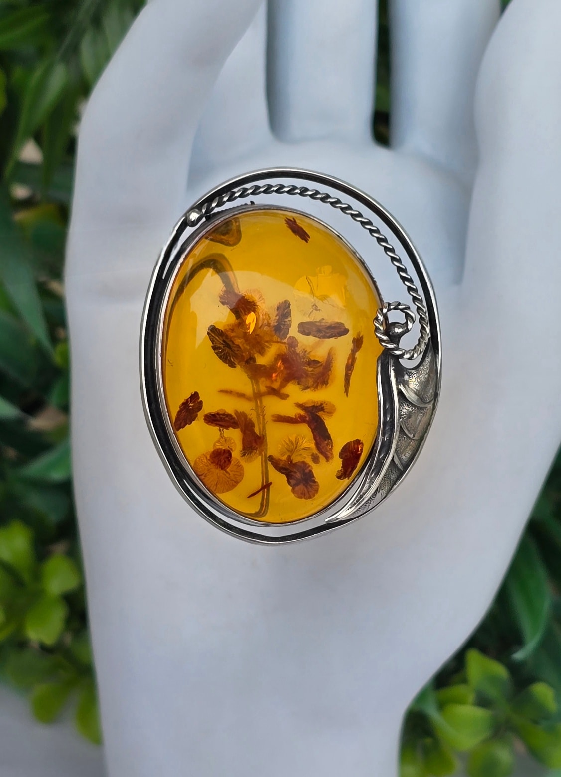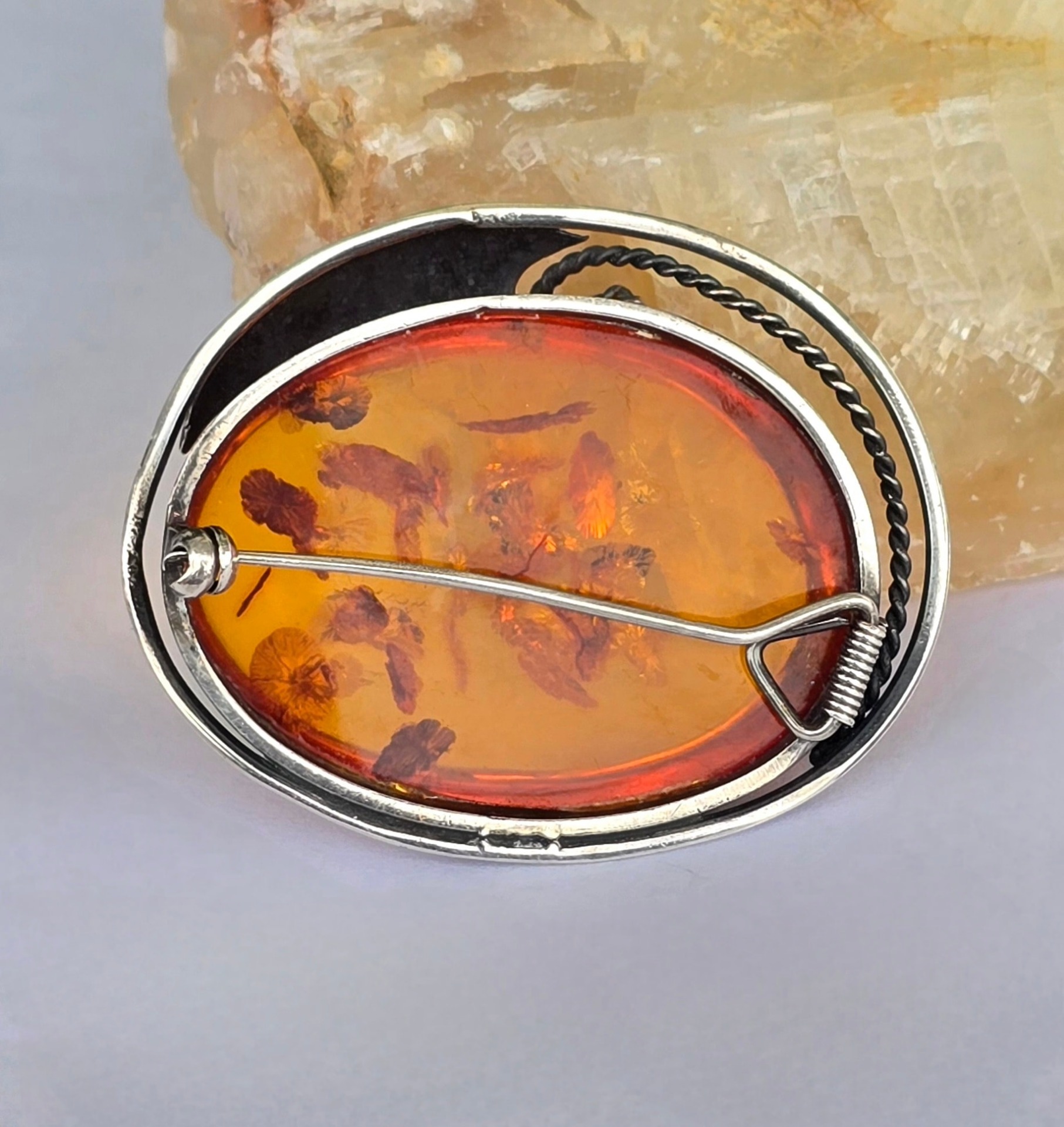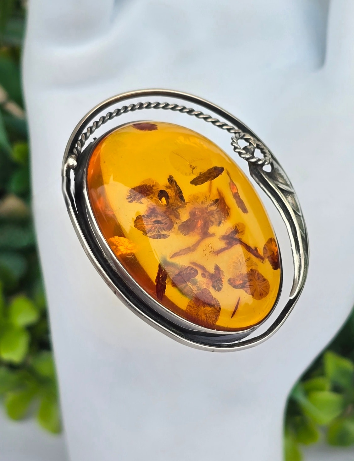 Broșă veche grandioasă, din argint, cu chihlimbar natural.
