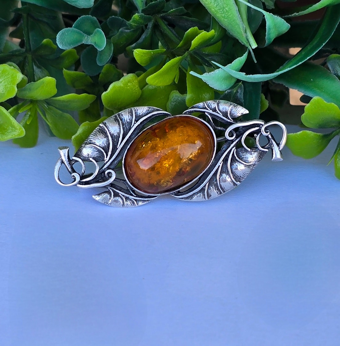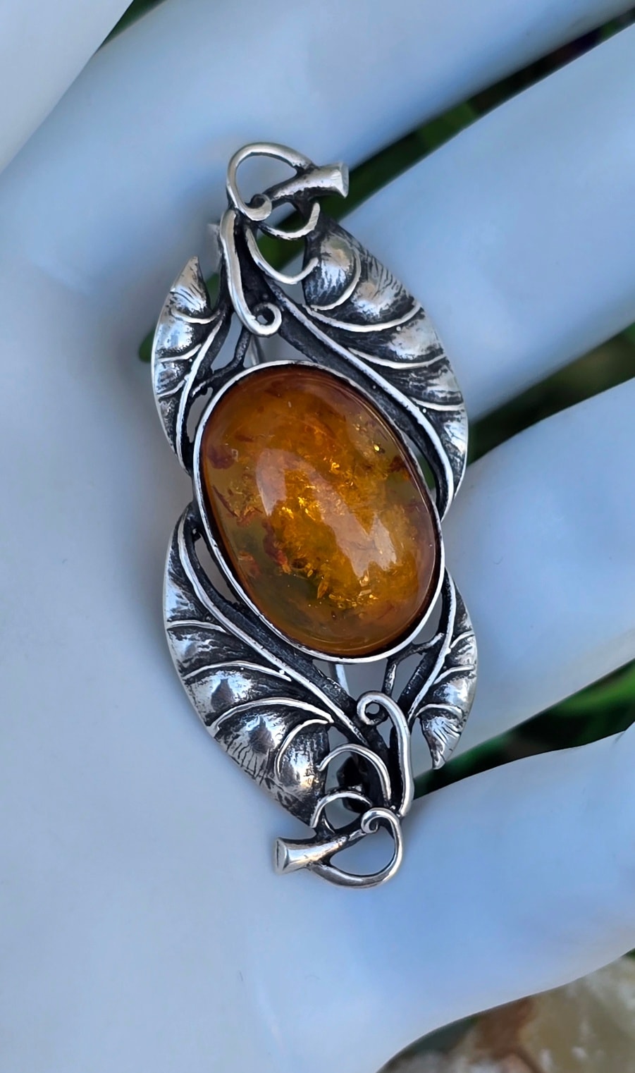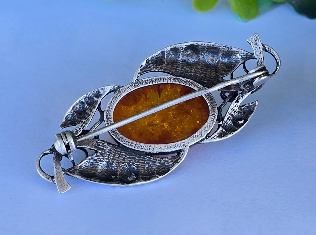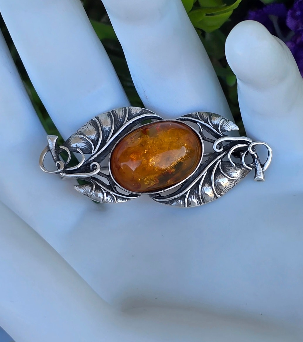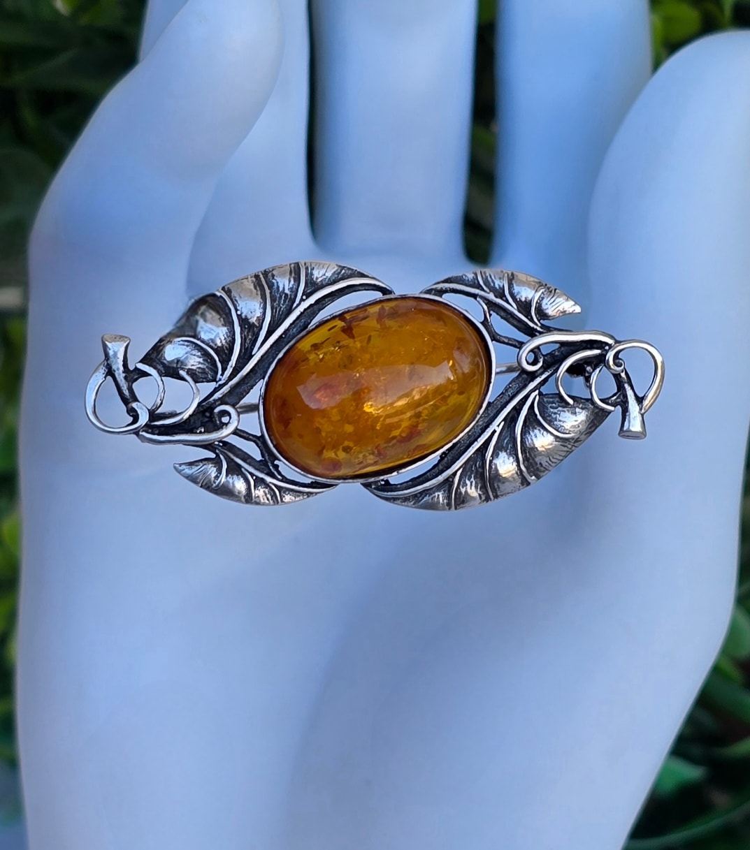 Broșă veche superbă, din argint, cu chihlimbar baltic natural, manufactură excepțională (anii 1960-1970, Polonia).