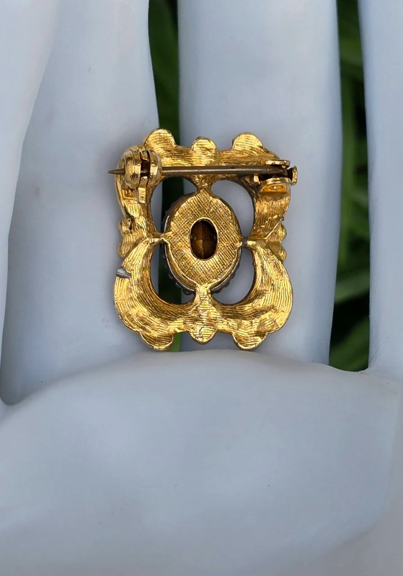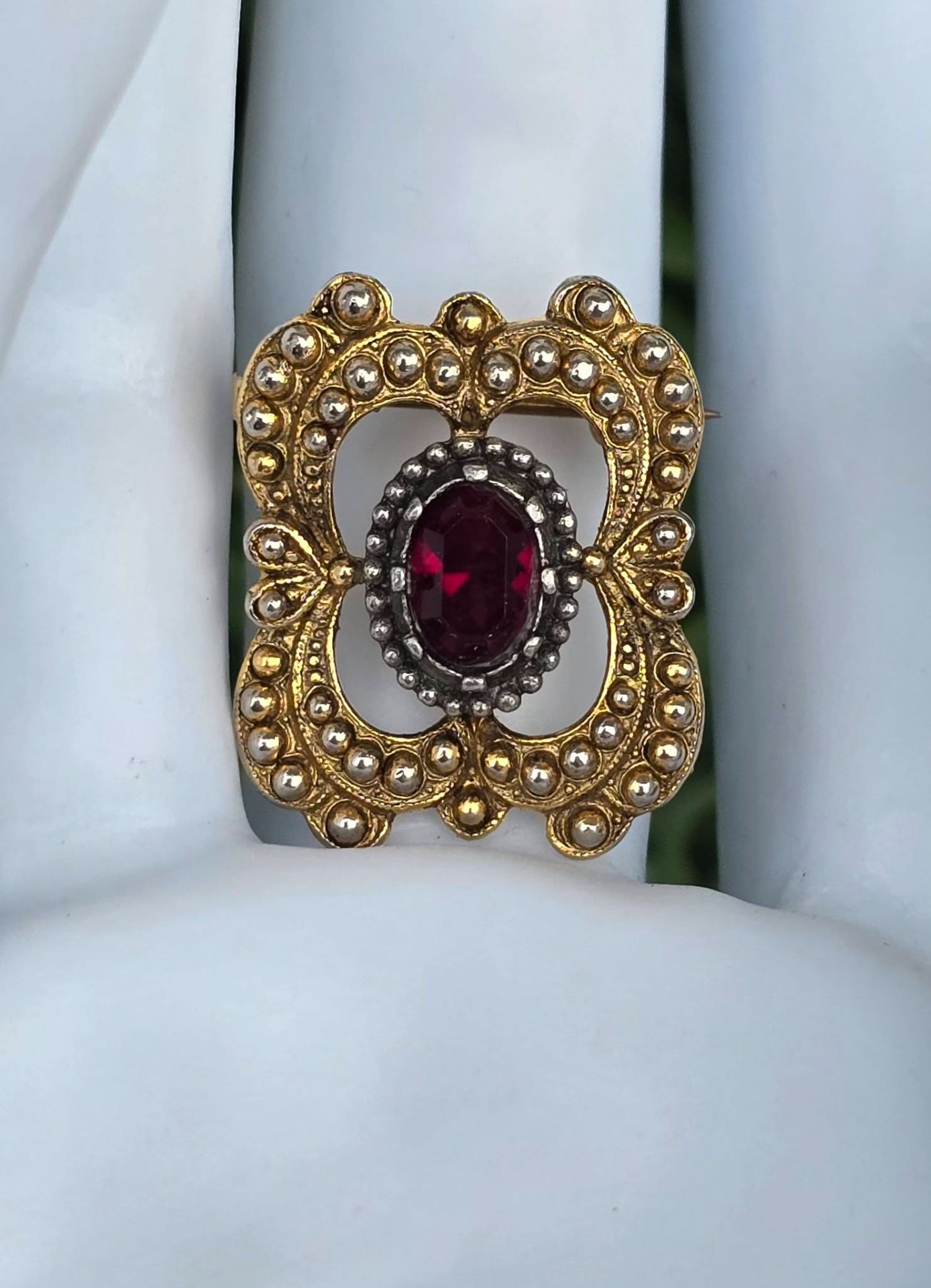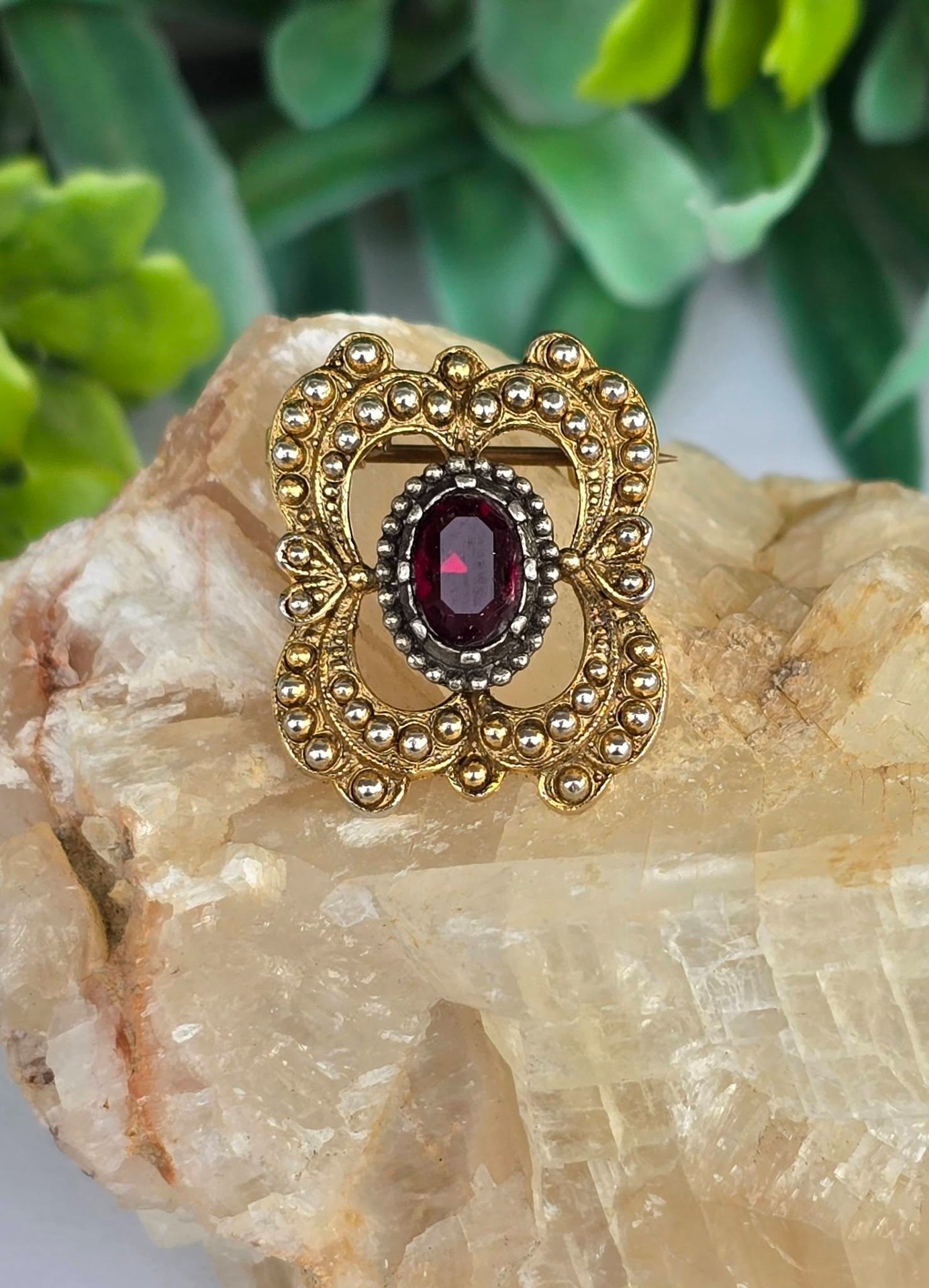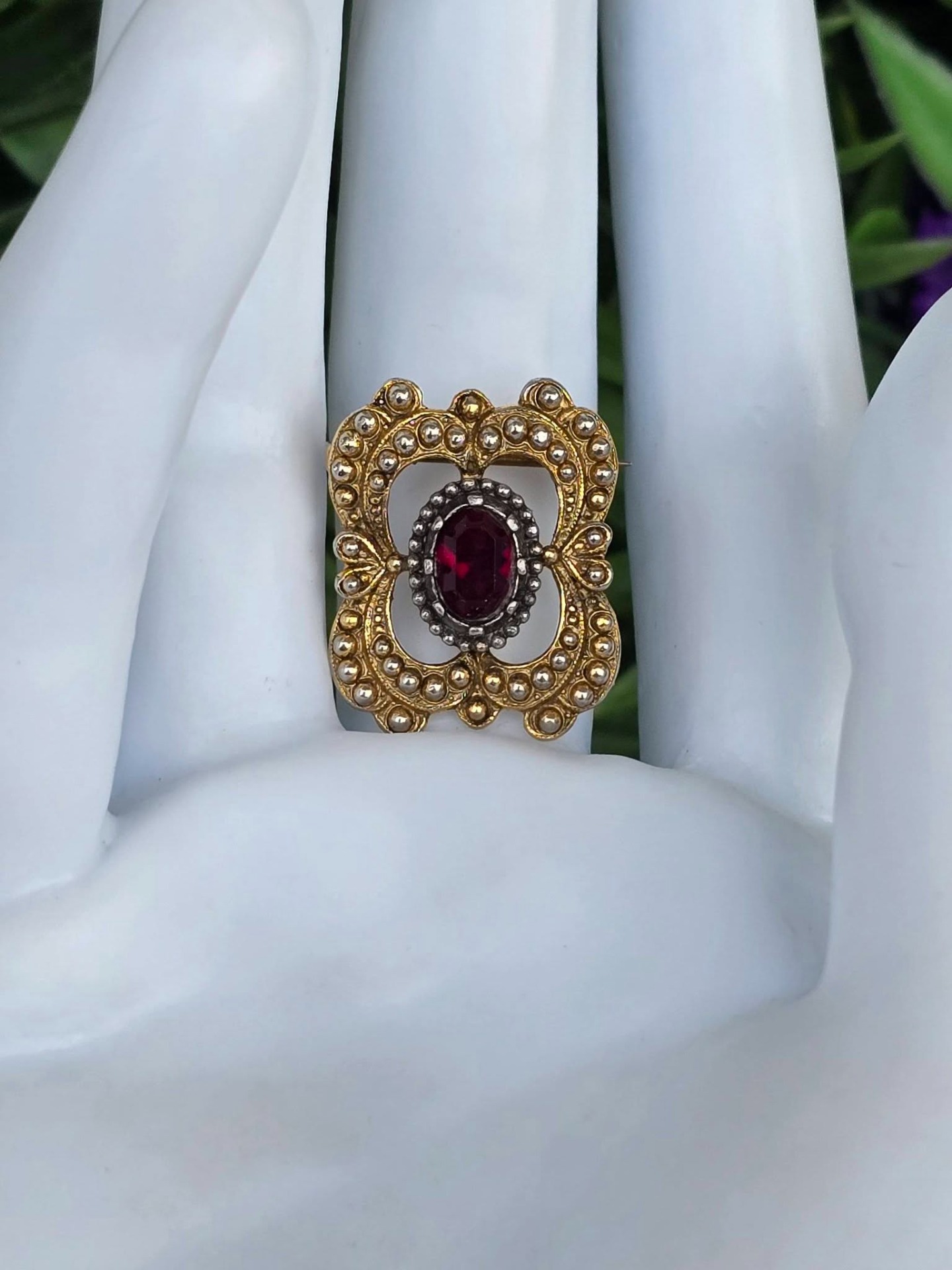 Broșă veche victoriană, din metal aurit, cu "glass paste" roșu.