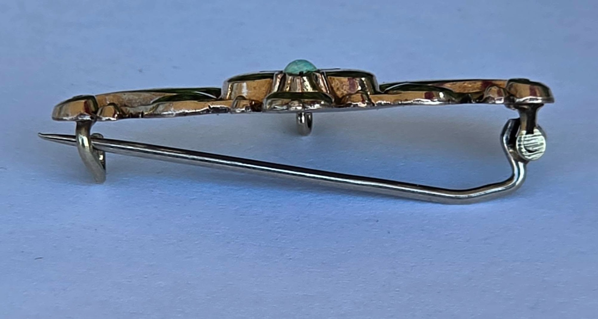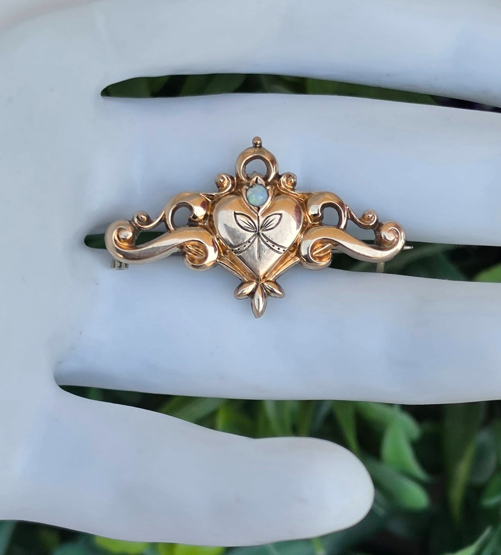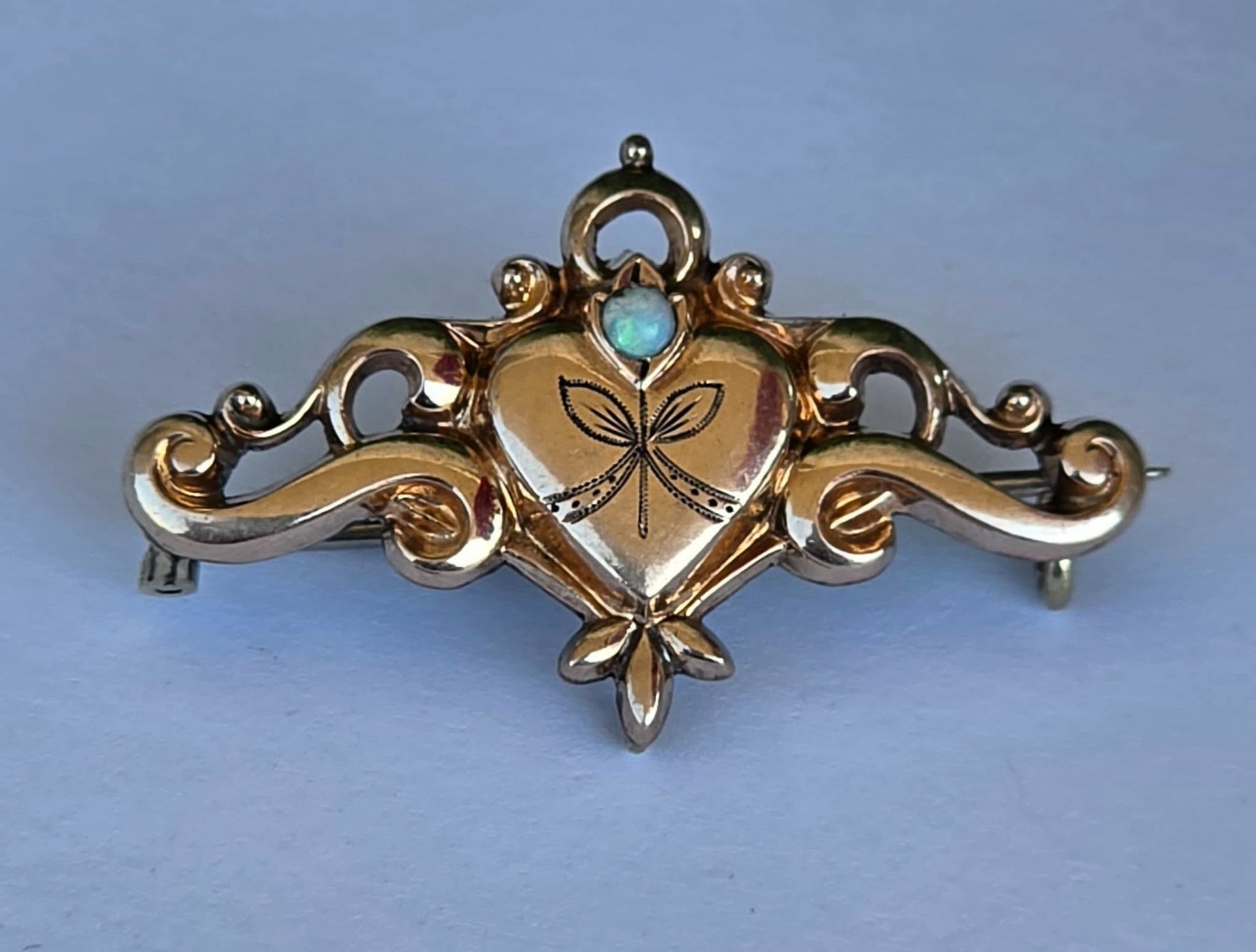 Broșă veche victoriană, rară, de colecție, din metal comun și "schaumgold" (foiță subțire din aur), cu opal natural, design specific perioadei de suprapunere a epocii Biedermeier cu Victorianul timpuriu, cu accent pe sentimentalism și motive naturale (anii 1840-1850, Germania).