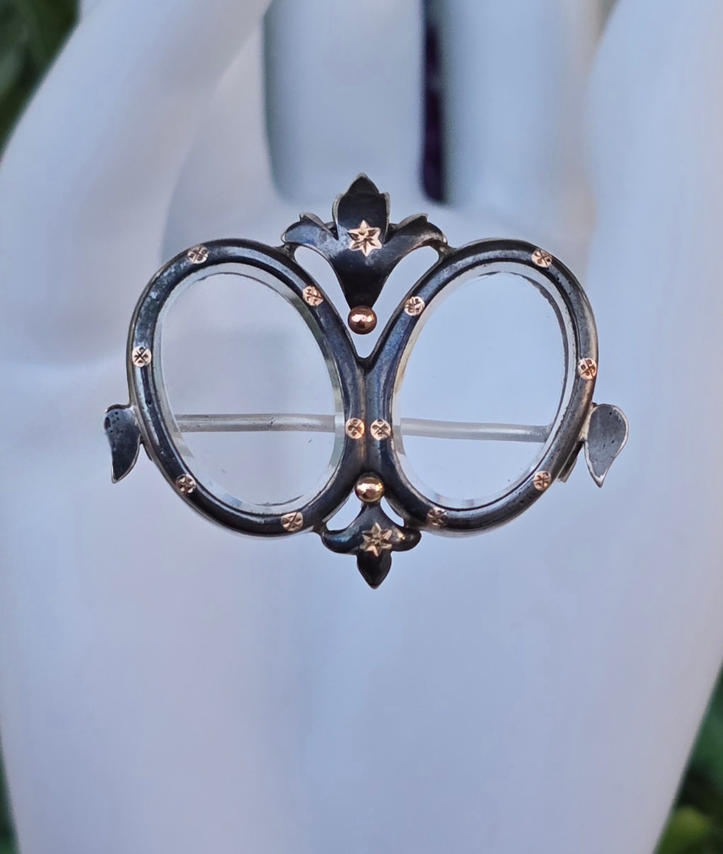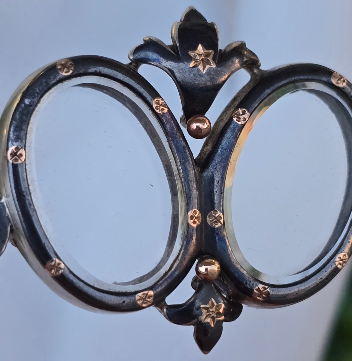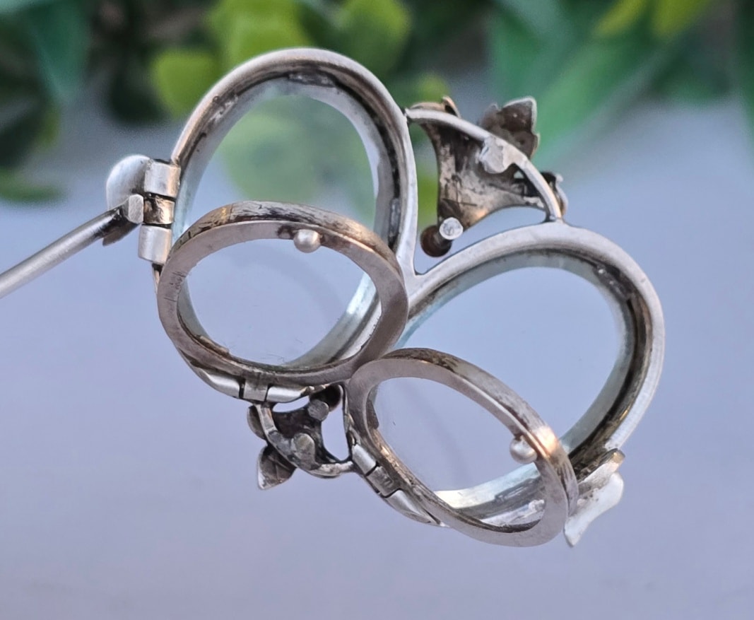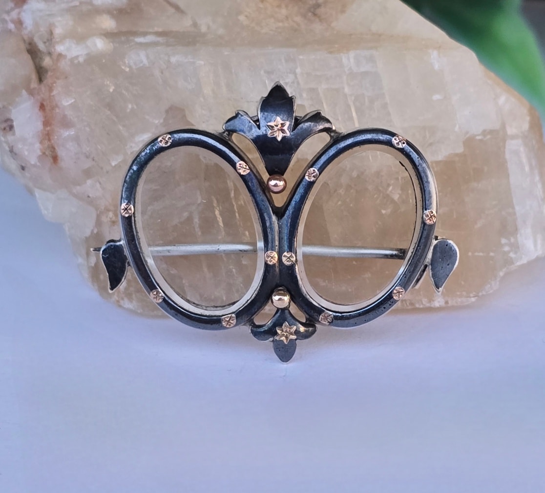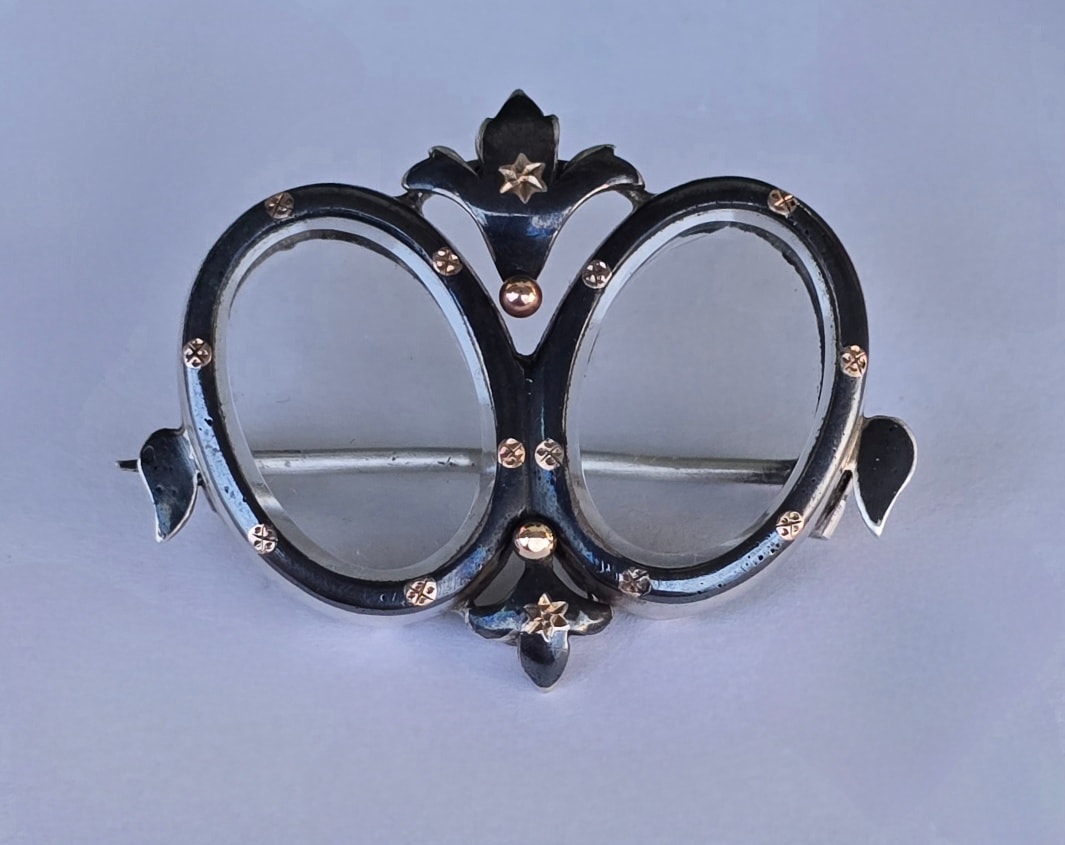 Broșă victoriană din argint, cu email "niello" și inserții din aur, piesă de bijuterie istorică rară, de tip "mourning jewelry" (bijuterie de doliu), cu "locket" dublu, două compartimente vitrate pentru fotografii, manufactură cu motive heraldice "fleur-de-lis", în stare excelentă pentru vechimea sa, fără ciobituri sau defecte (anii 1880-1900).