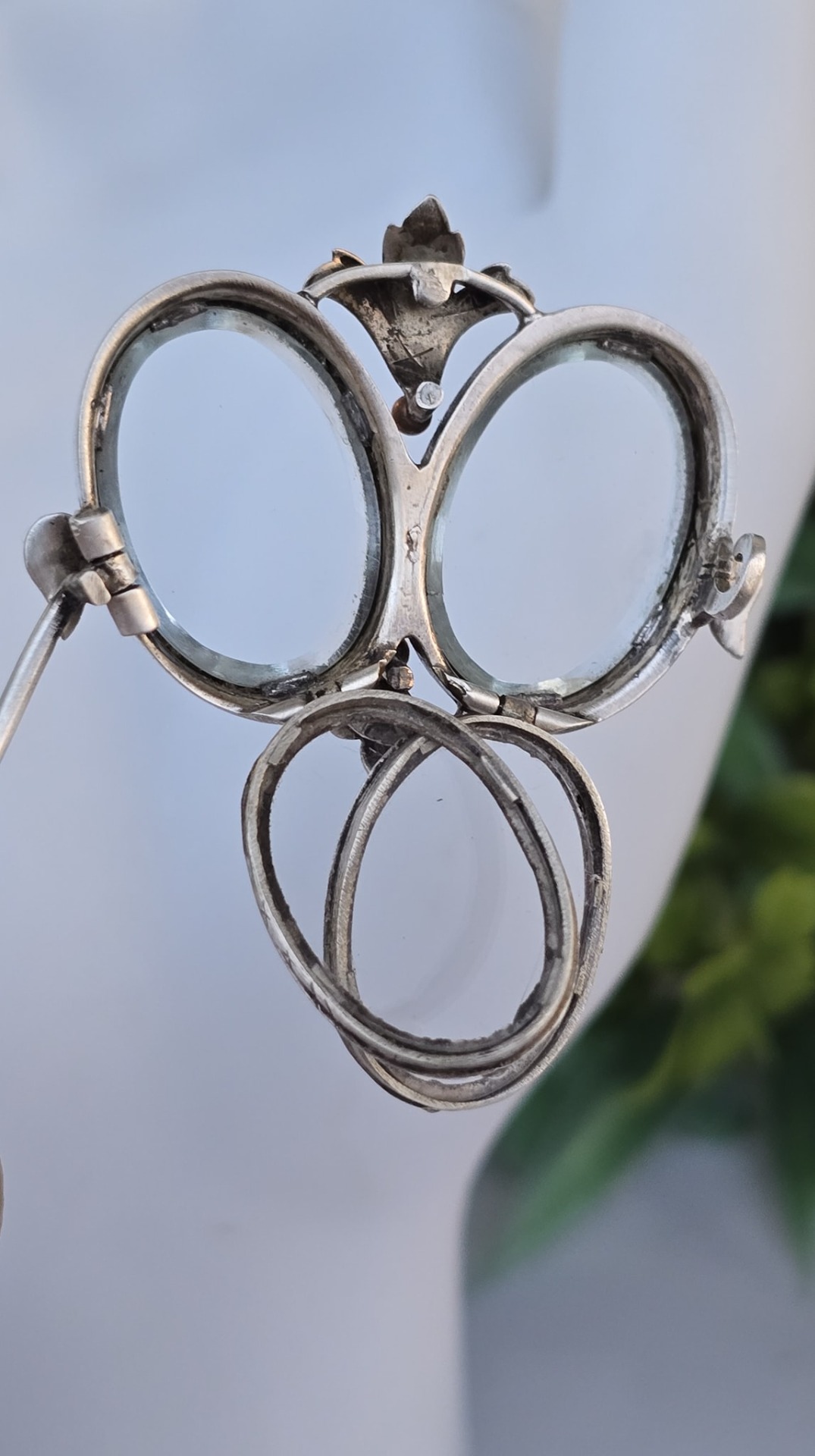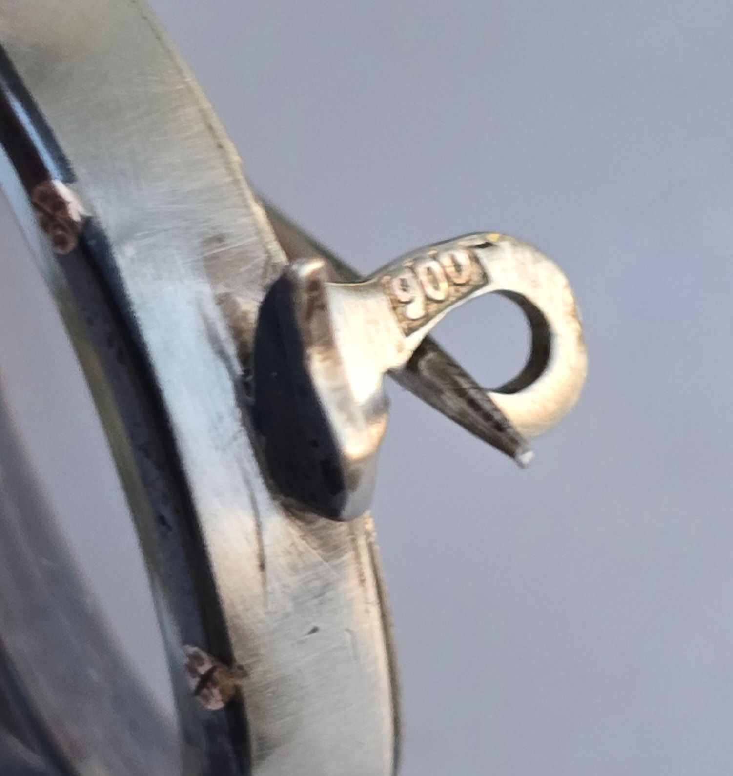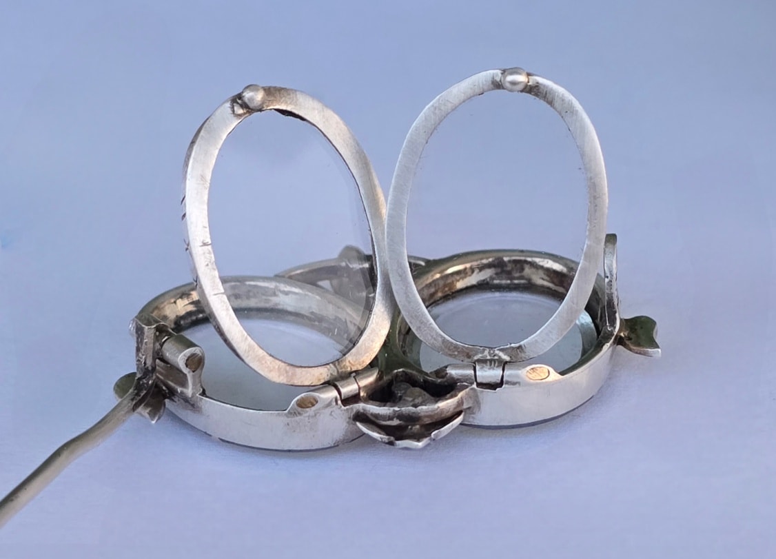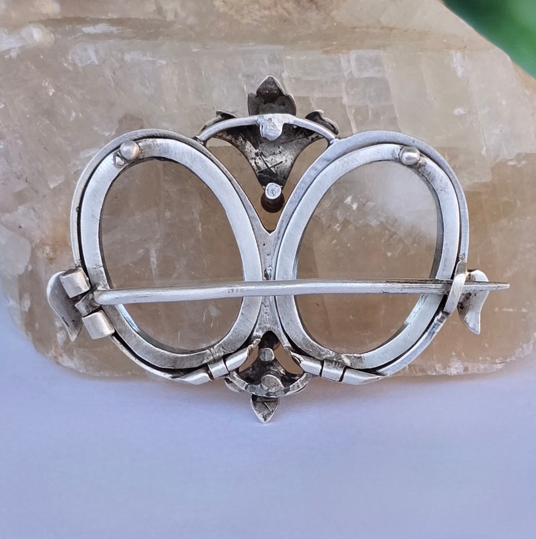 Broșă victoriană din argint, cu email "niello" și inserții din aur, piesă de bijuterie istorică rară, de tip "mourning jewelry" (bijuterie de doliu), cu "locket" dublu, două compartimente vitrate pentru fotografii, manufactură cu motive heraldice "fleur-de-lis", în stare excelentă pentru vechimea sa, fără ciobituri sau defecte (anii 1880-1900).