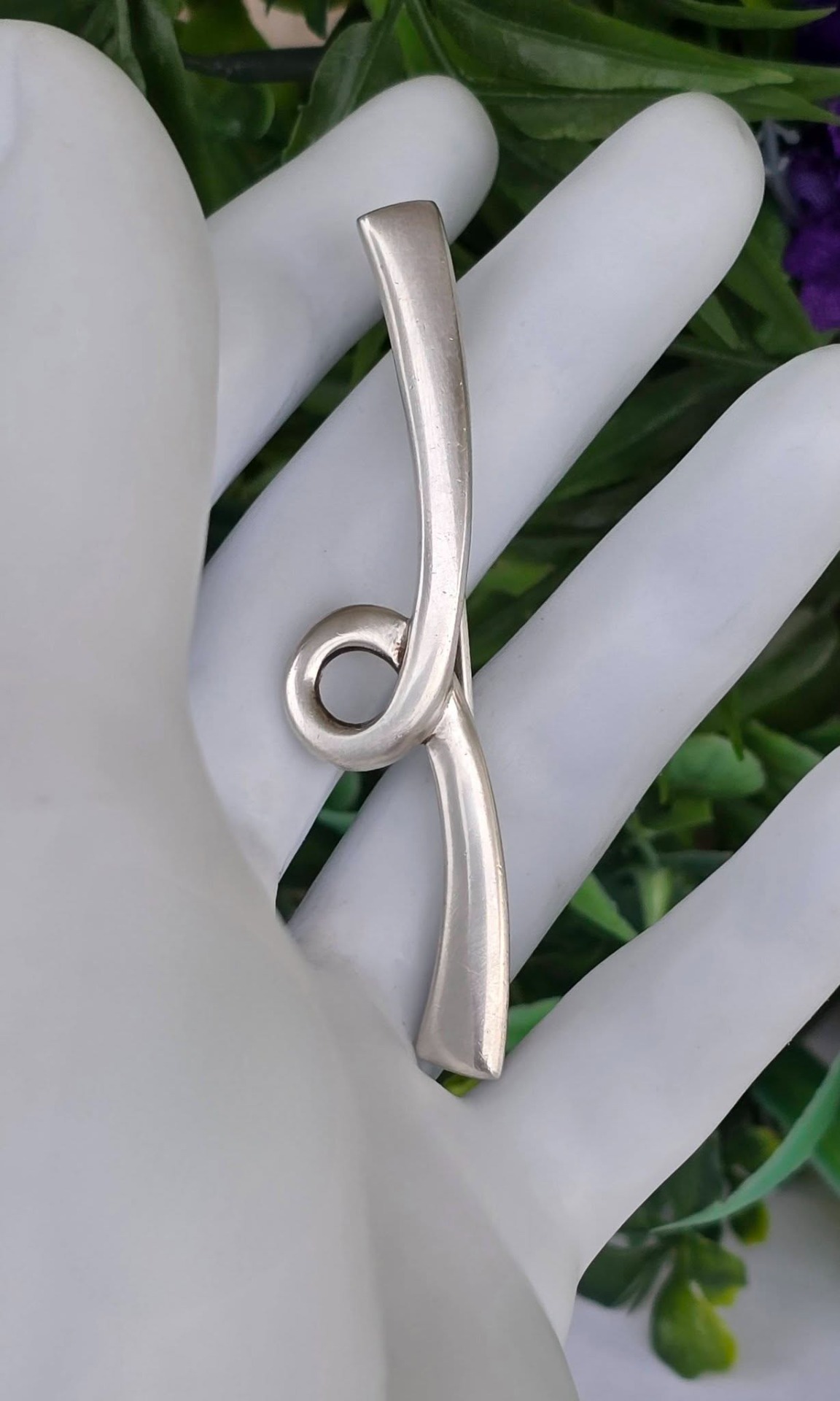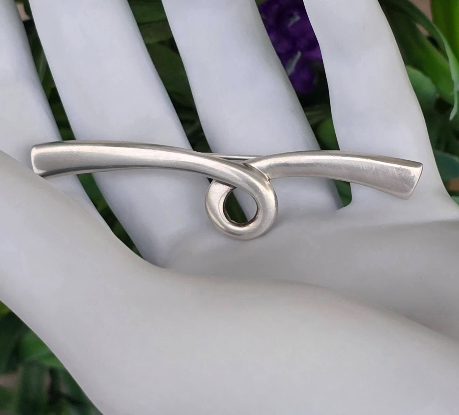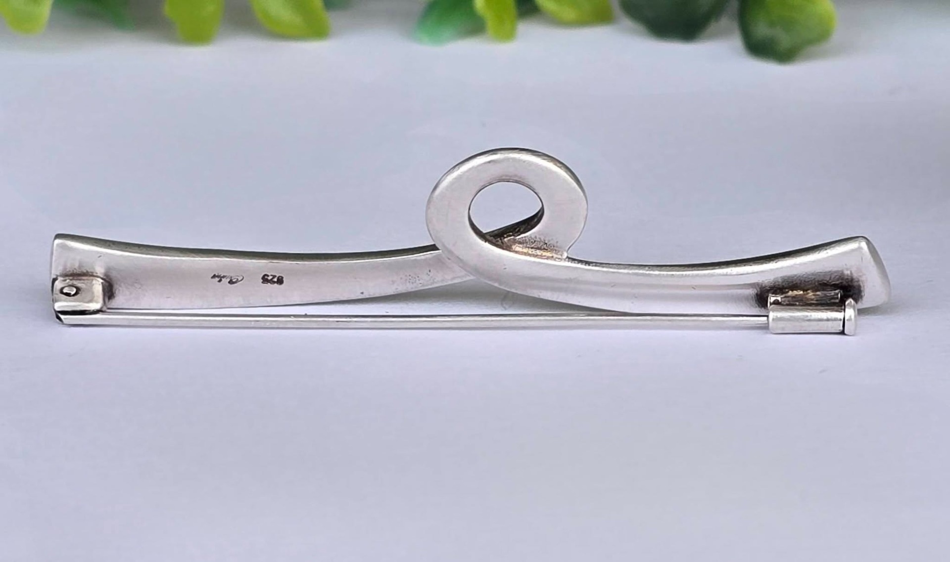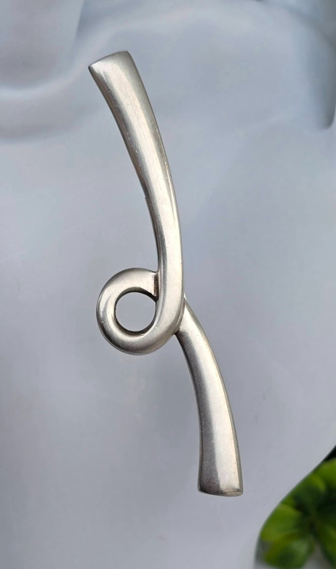 Broșă vintage din argint, cu design minimalist, sculptural și abstract, cu formă curbată care se înnoadă într-o buclă centrală, manufactură Quinn Scheune, renumită casă de bijuterii germană.