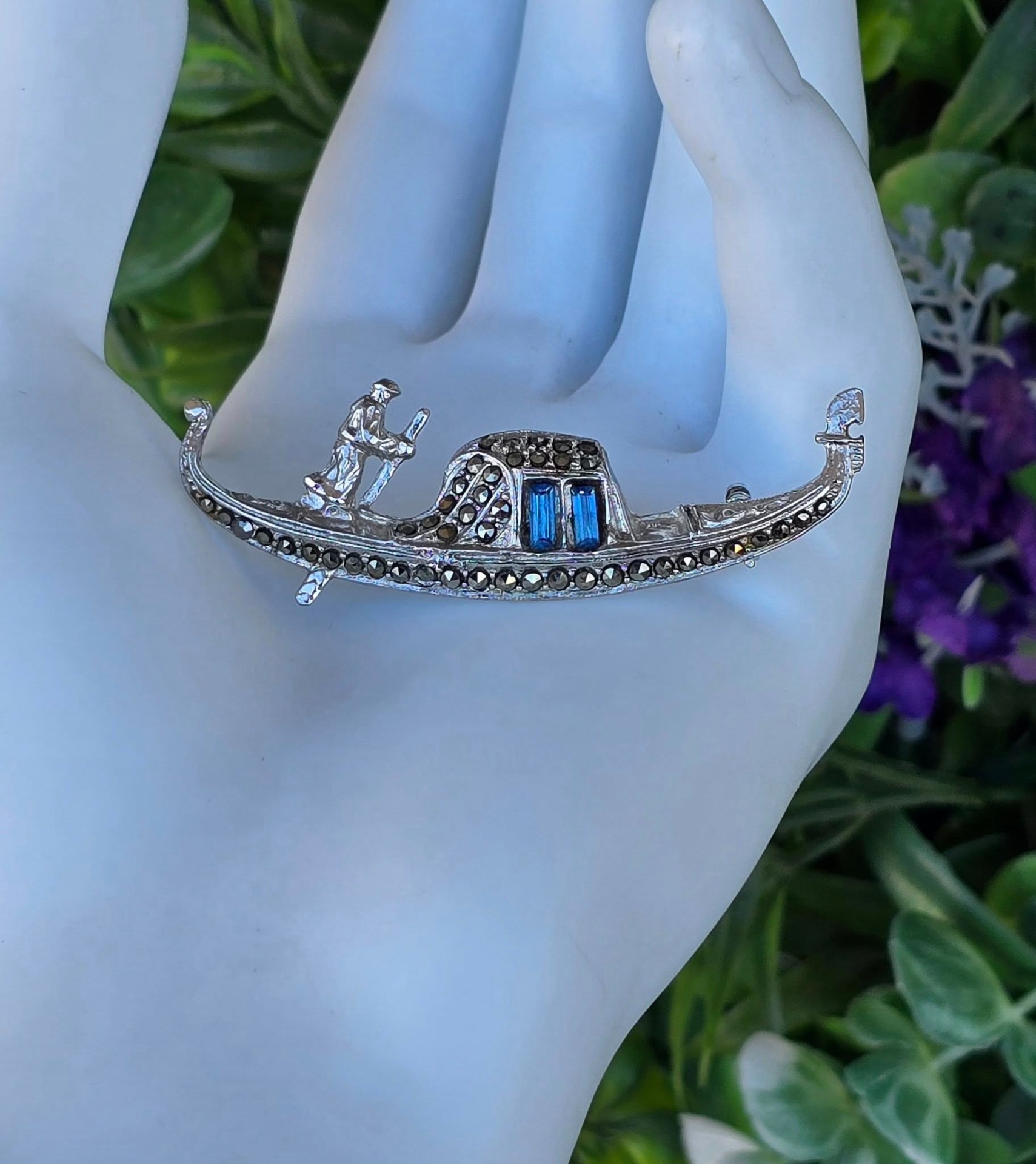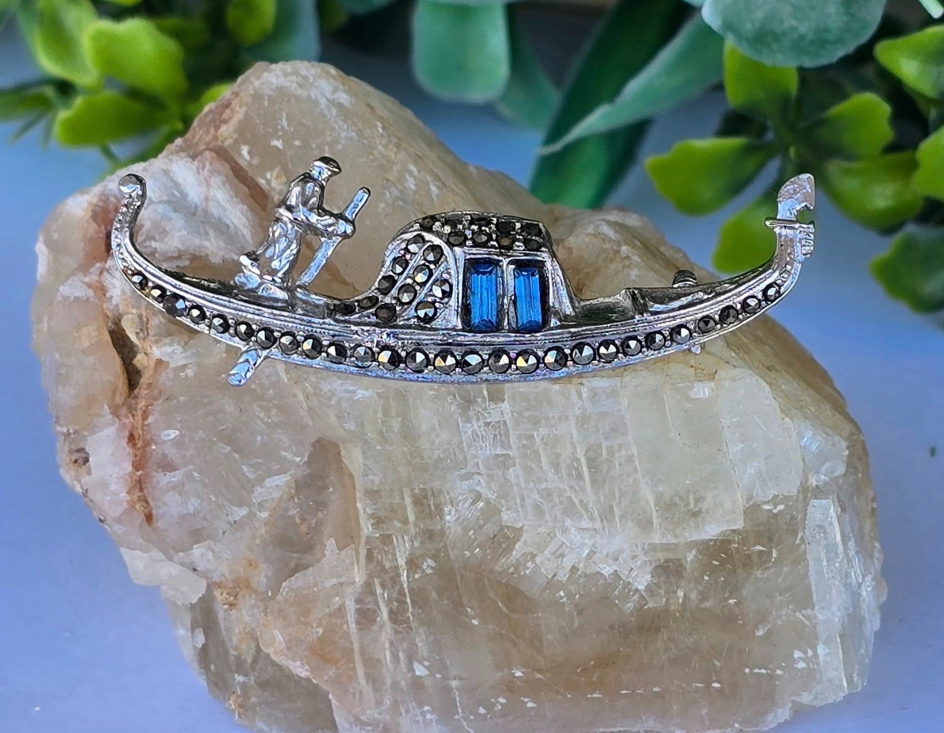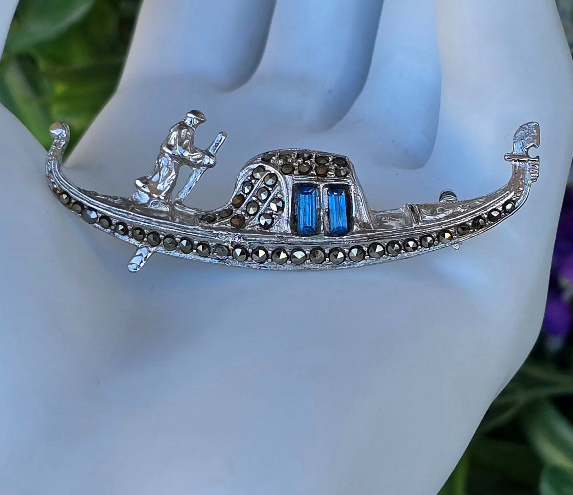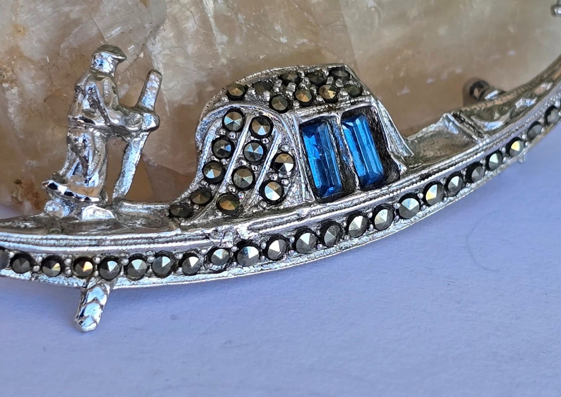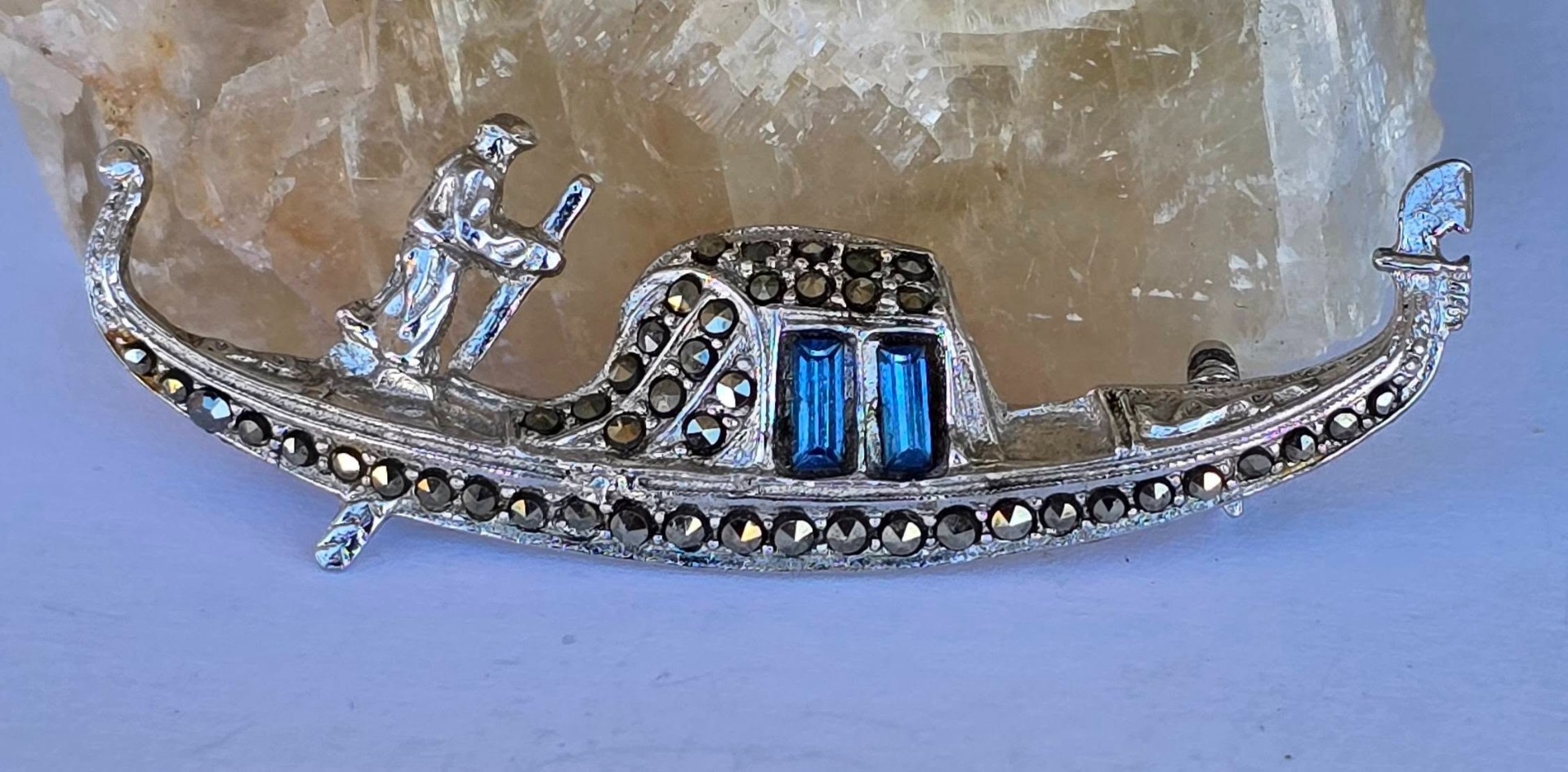 Broșă vintage, gondolă din argint rodiat, cu pietre cubic zirconia albastre și marcasite (anii 1970, Venezia, Italia).