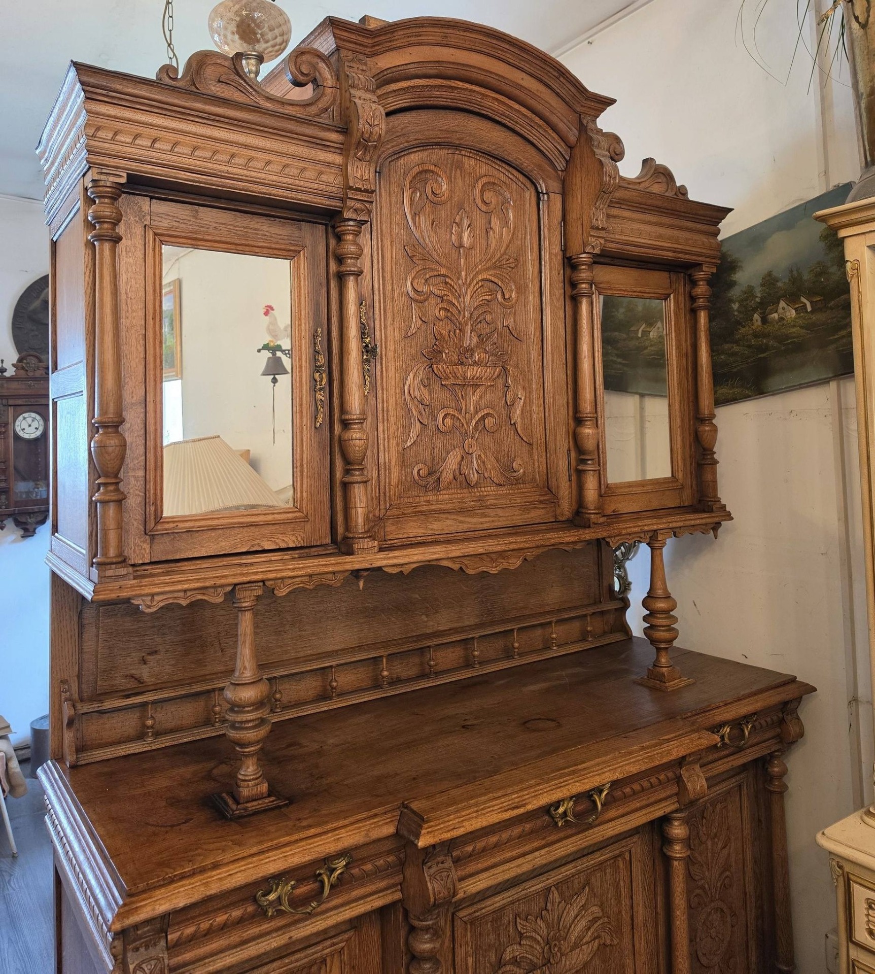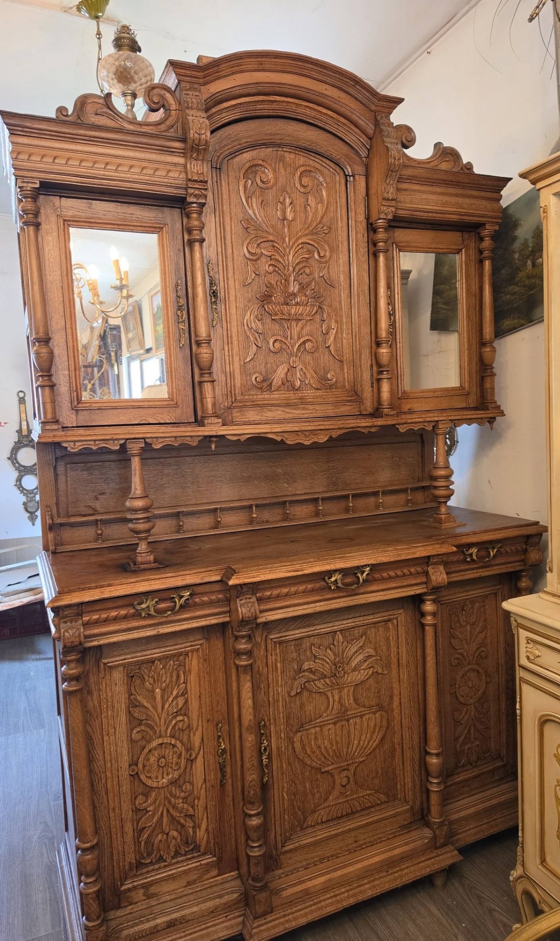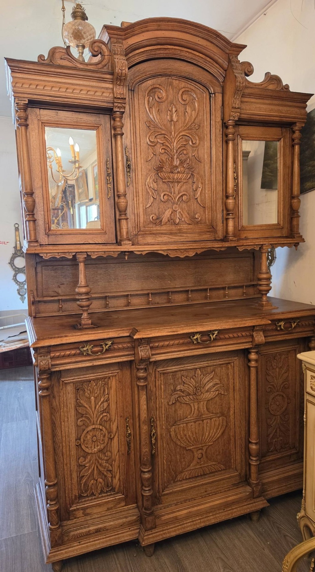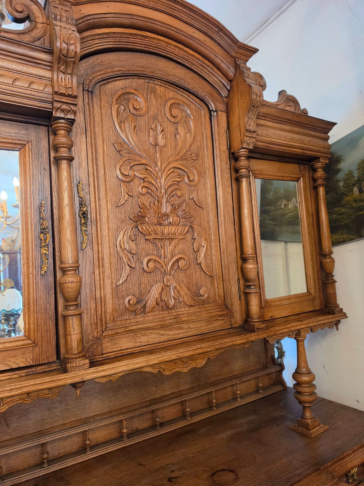 Se vinde bufet antic din lemn masiv, realizat cu atenție la detalii și finisaje deosebite. Piesa impresionează prin sculpturile elegante, coloanele decorative și partea superioară cu oglinzi laterale și fronton bogat ornamentat.