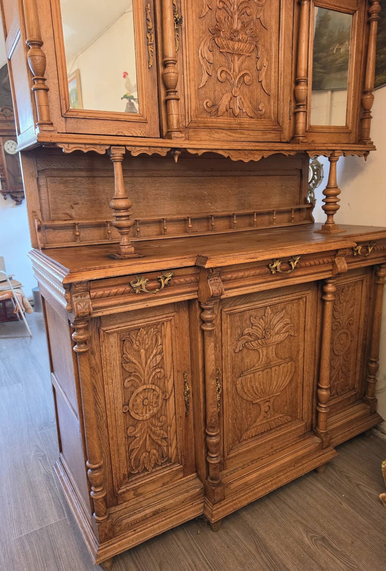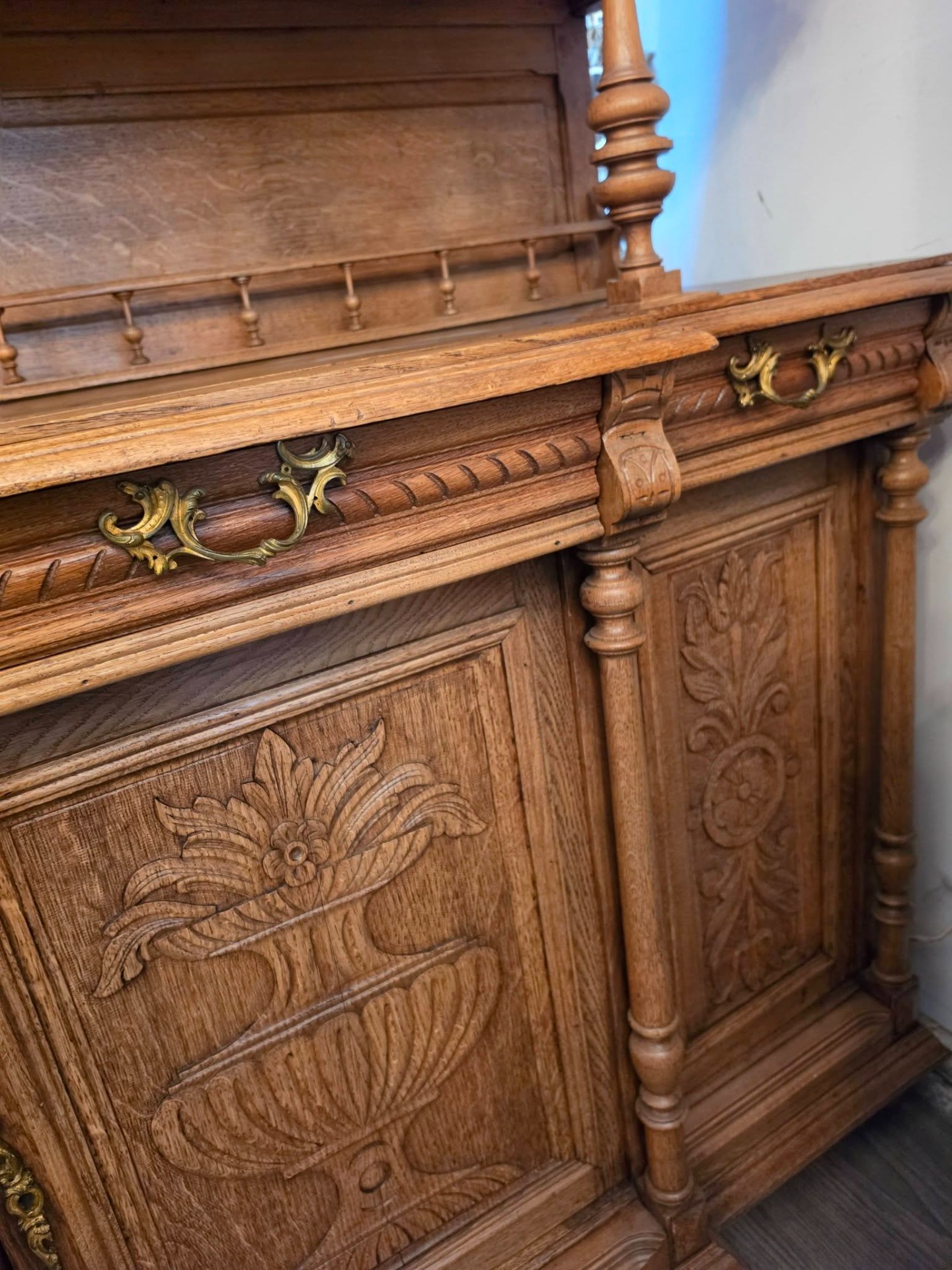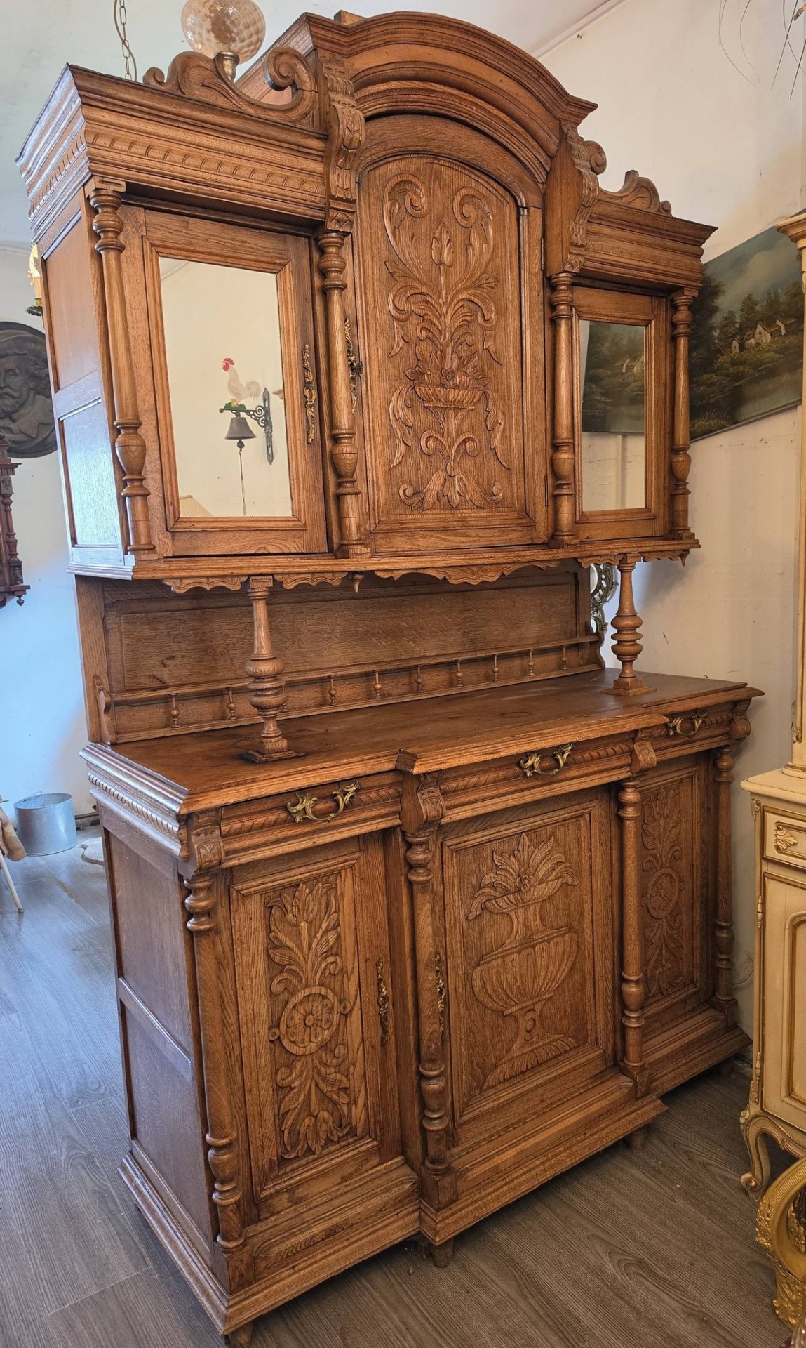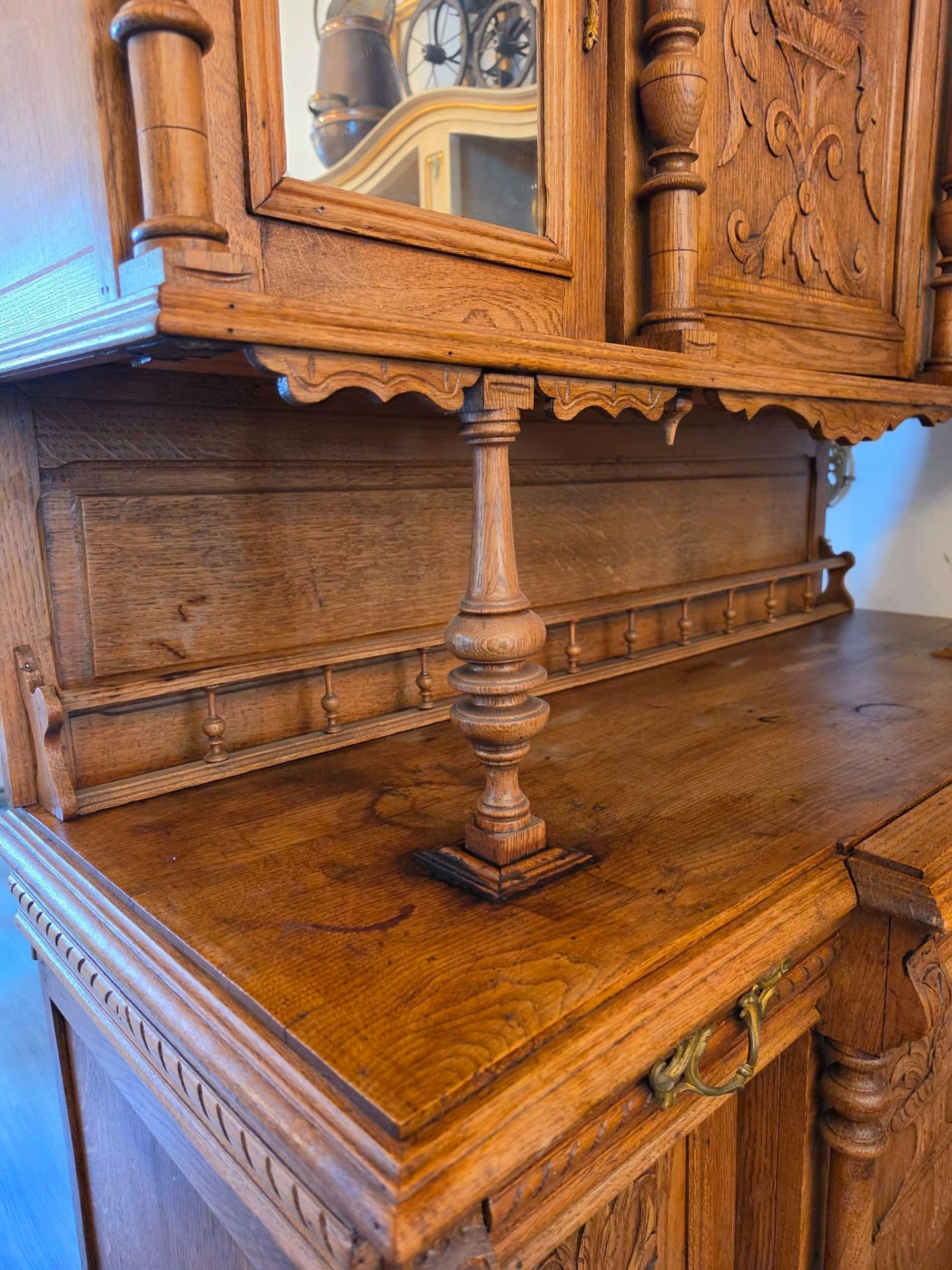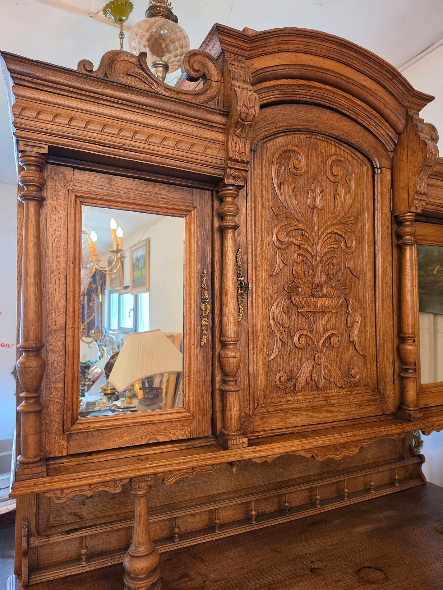 Se vinde bufet antic din lemn masiv, realizat cu atenție la detalii și finisaje deosebite. Piesa impresionează prin sculpturile elegante, coloanele decorative și partea superioară cu oglinzi laterale și fronton bogat ornamentat.
