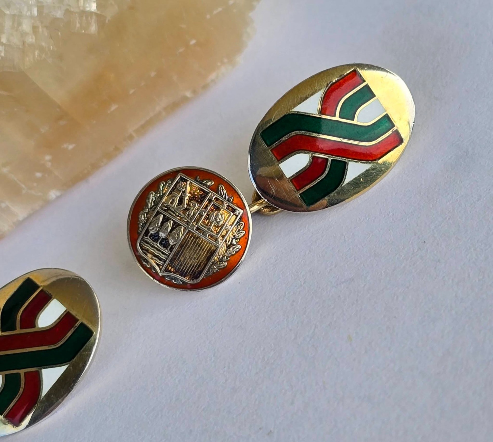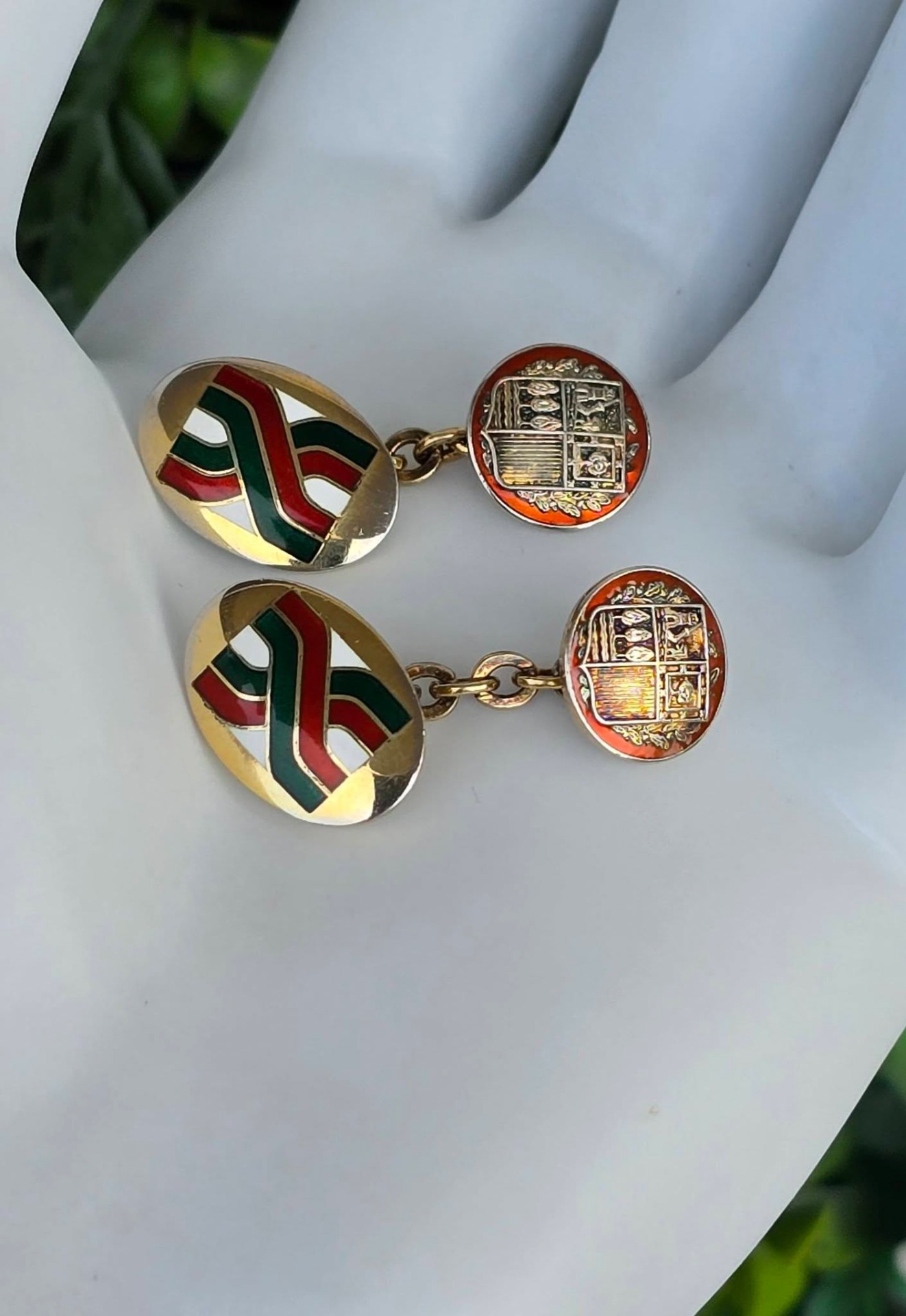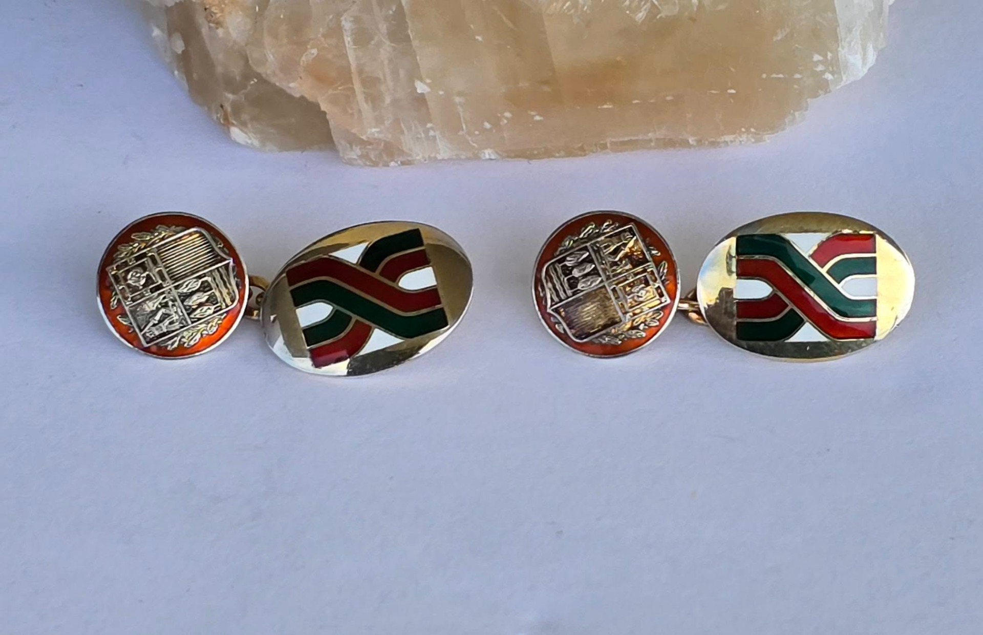 Butoni de manșetă vintage, foarte rari, de colecție, din argint aurit, compuși din două plăcuțe ovale emailate și două discuri rotunde cu stemă heraldică în