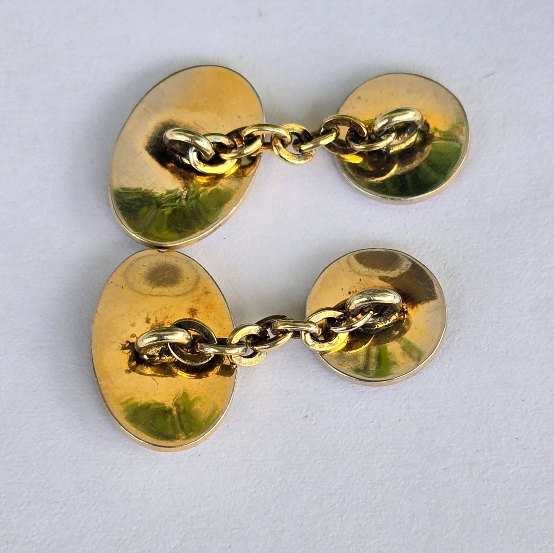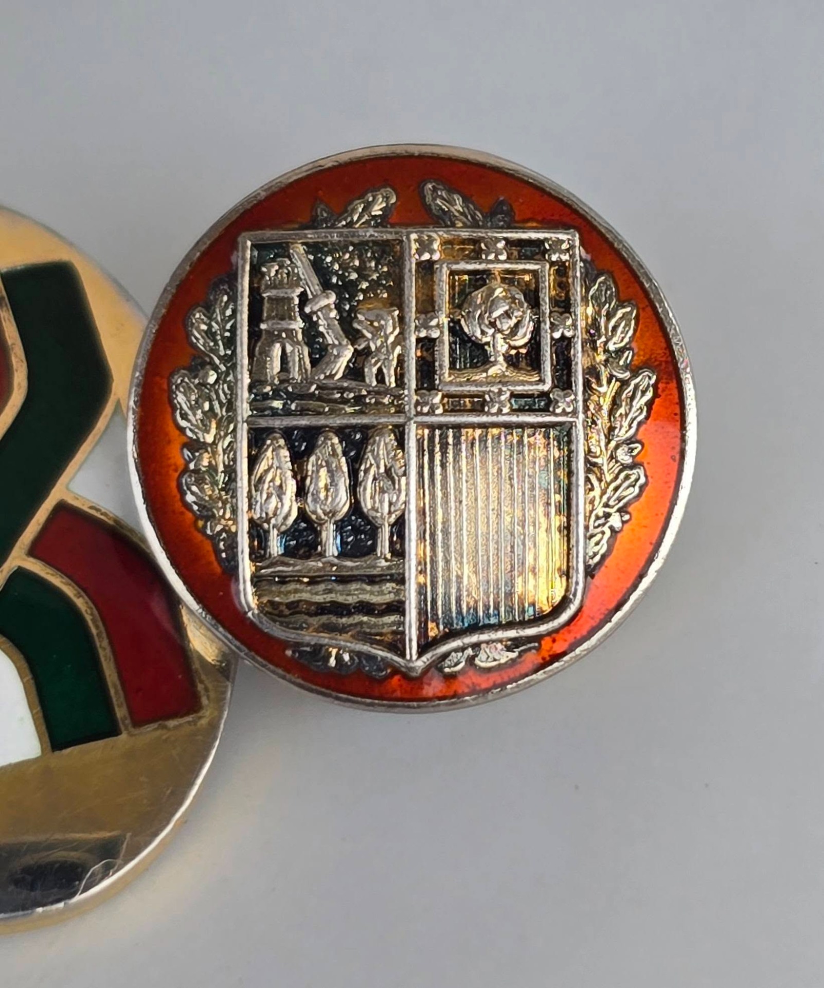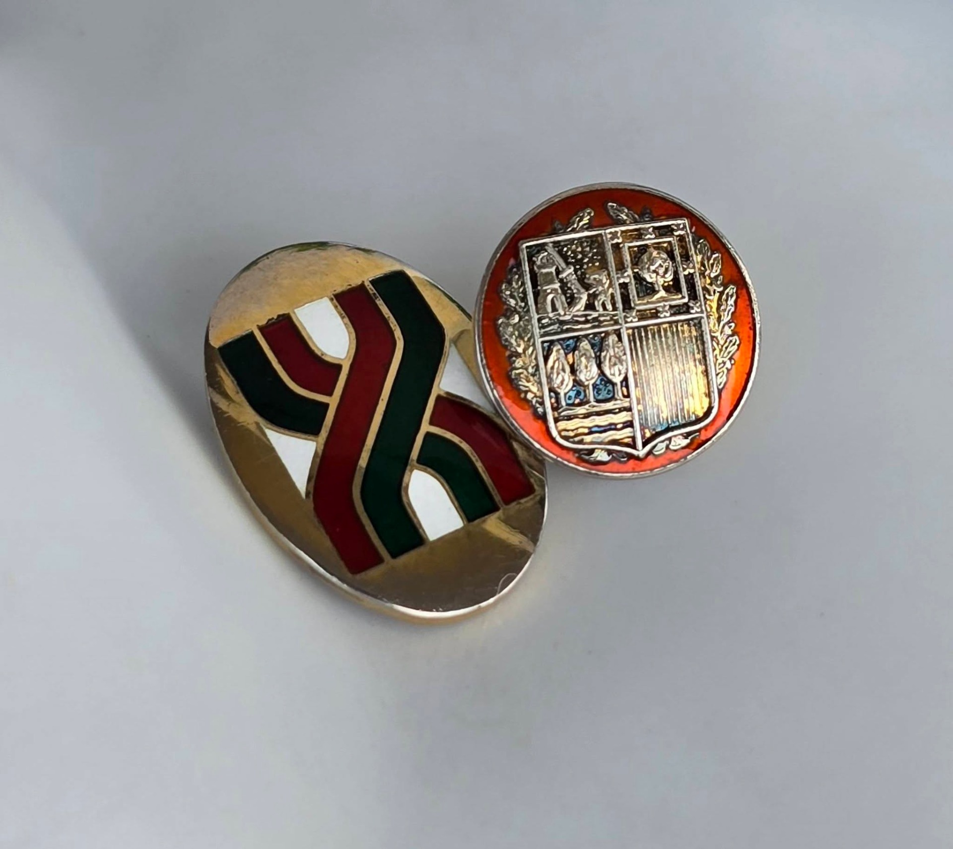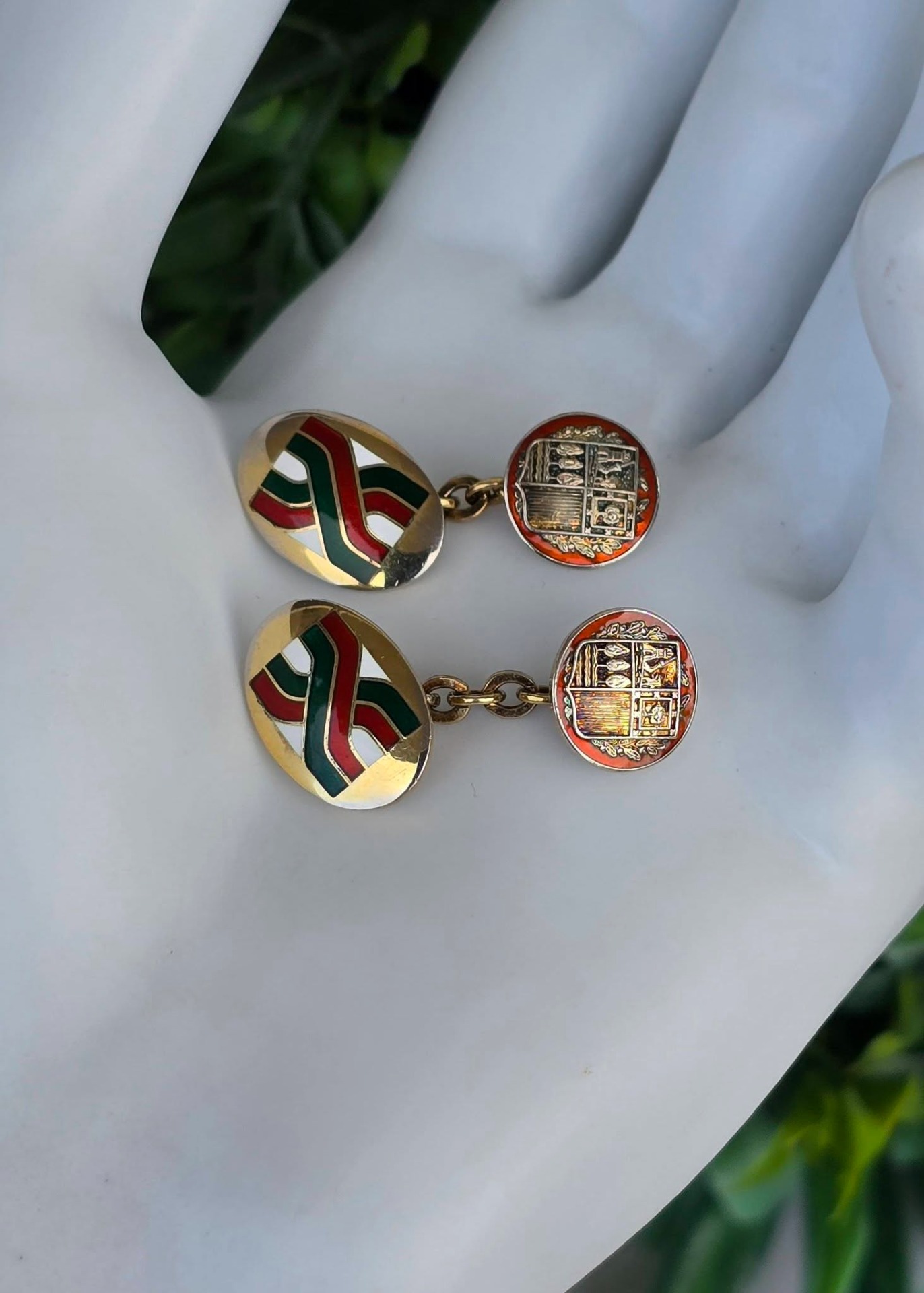 Butoni de manșetă vintage, foarte rari, de colecție, din argint aurit, compuși din două plăcuțe ovale emailate și două discuri rotunde cu stemă heraldică în