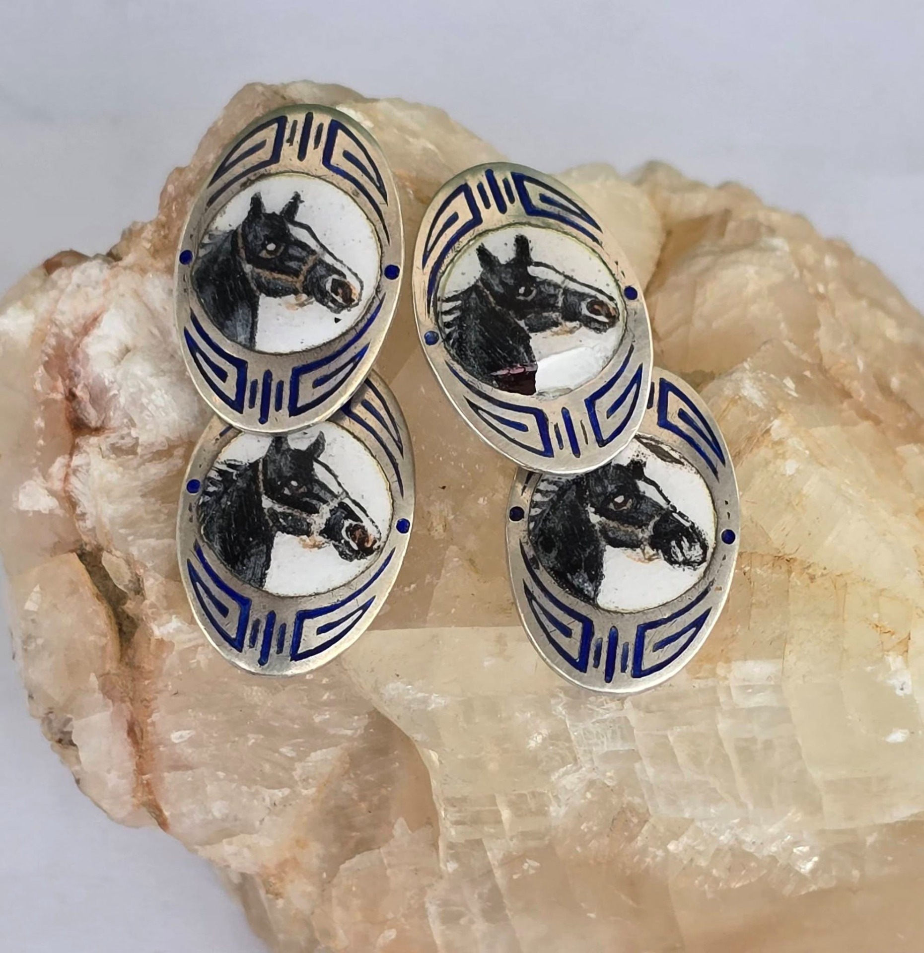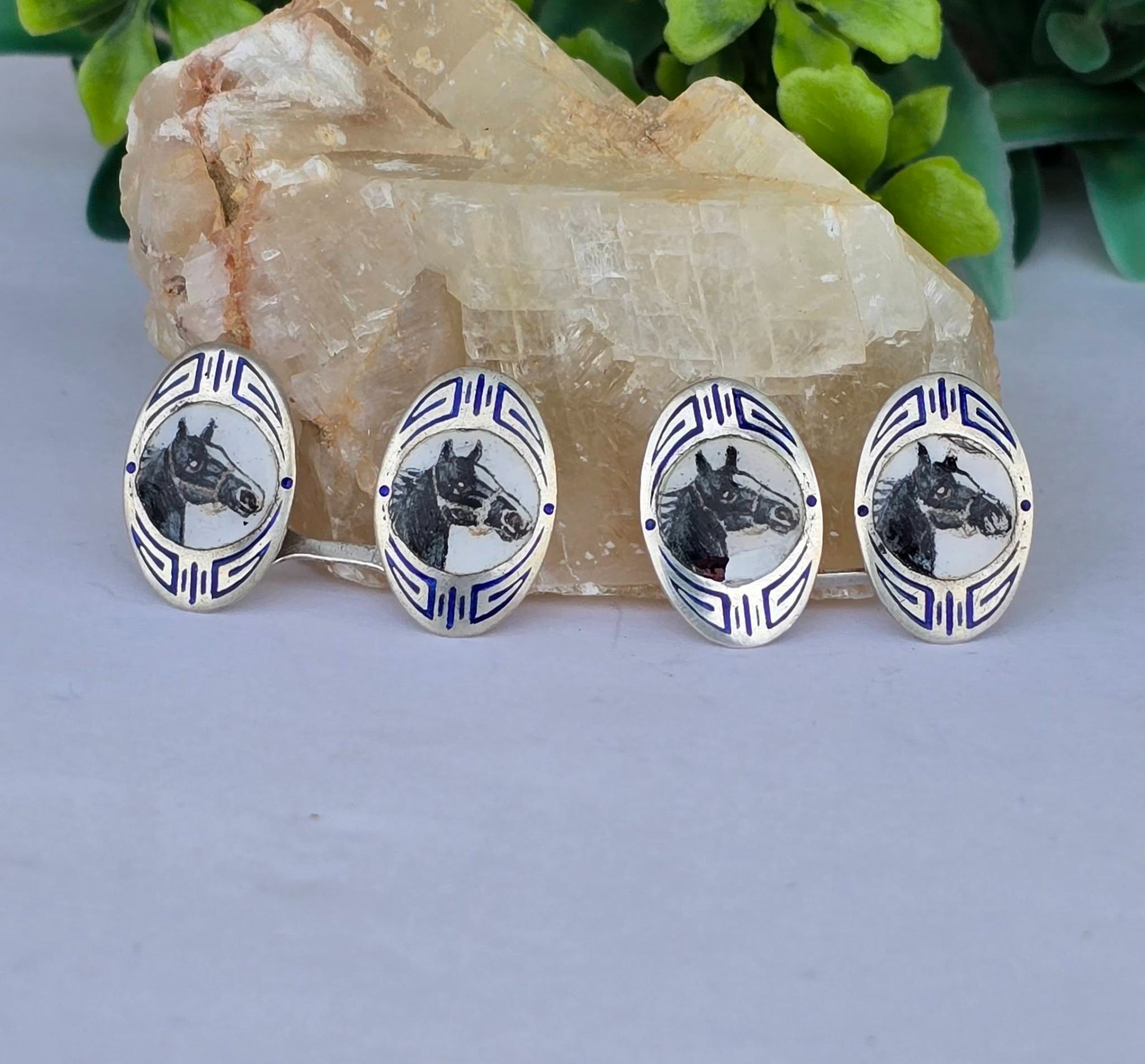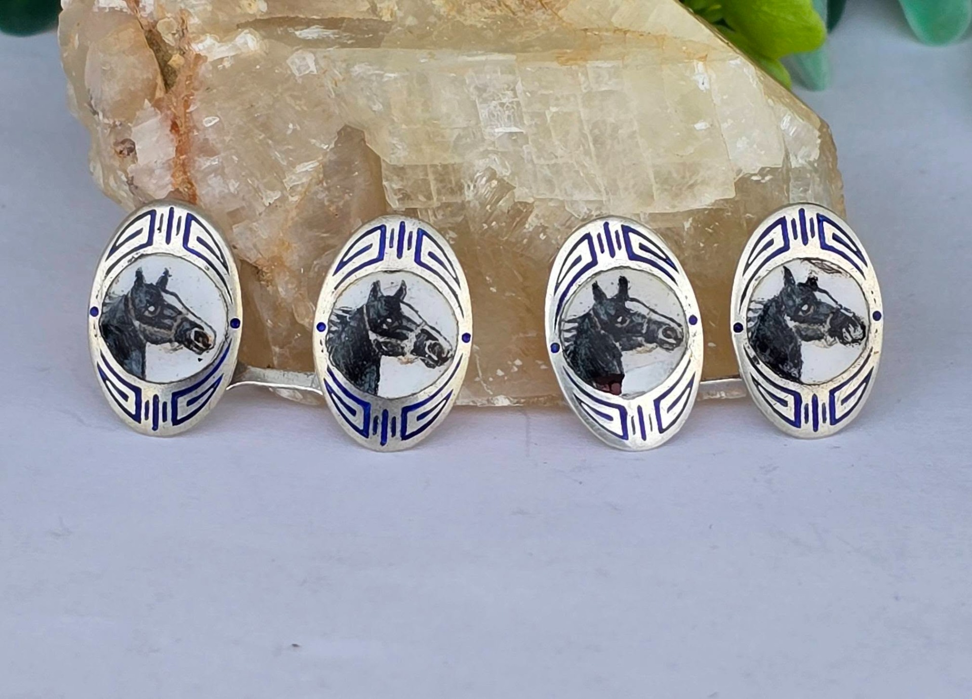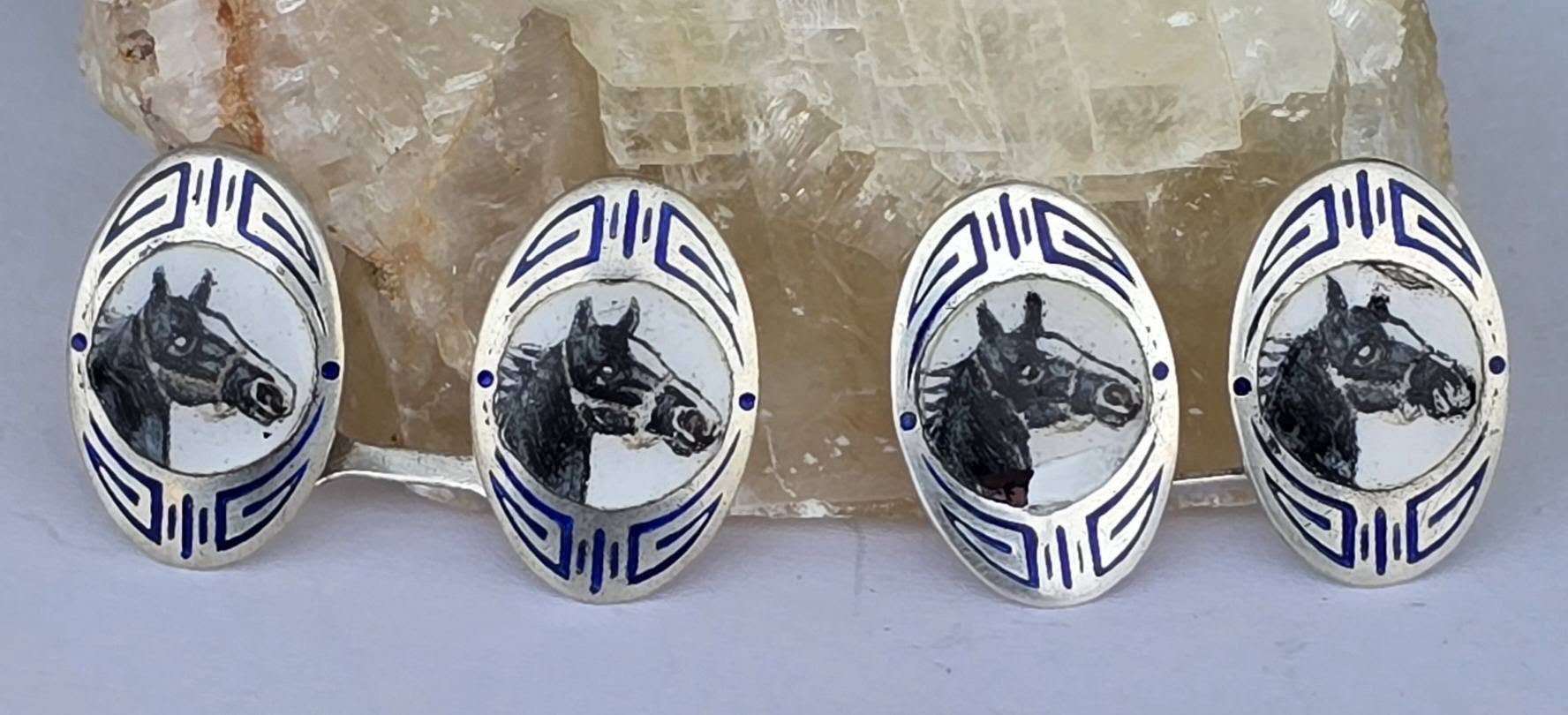 Butoni vechi din argint, cu email pictat manual, rari, de colecție (anii 1920-1930, Italia).