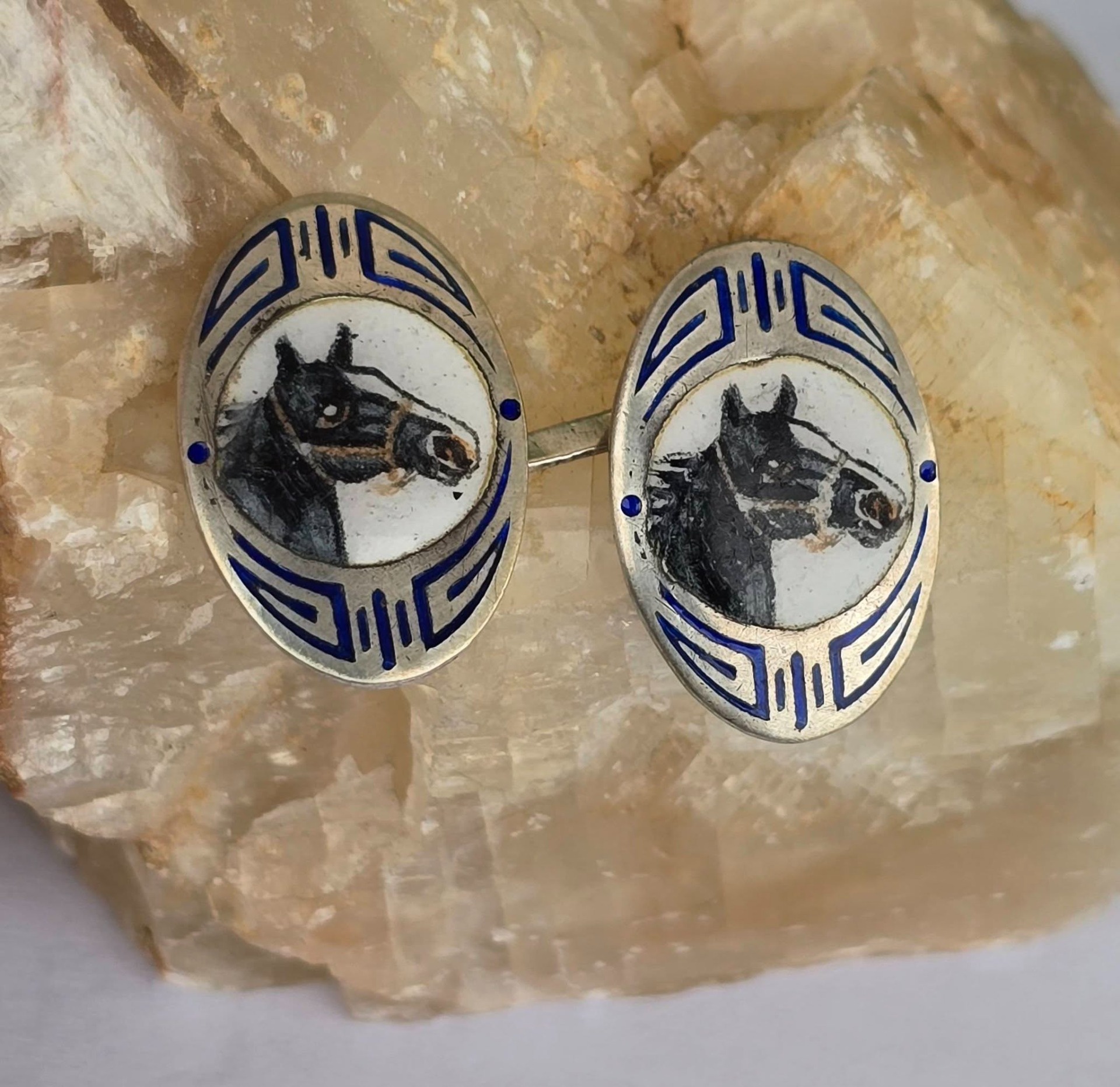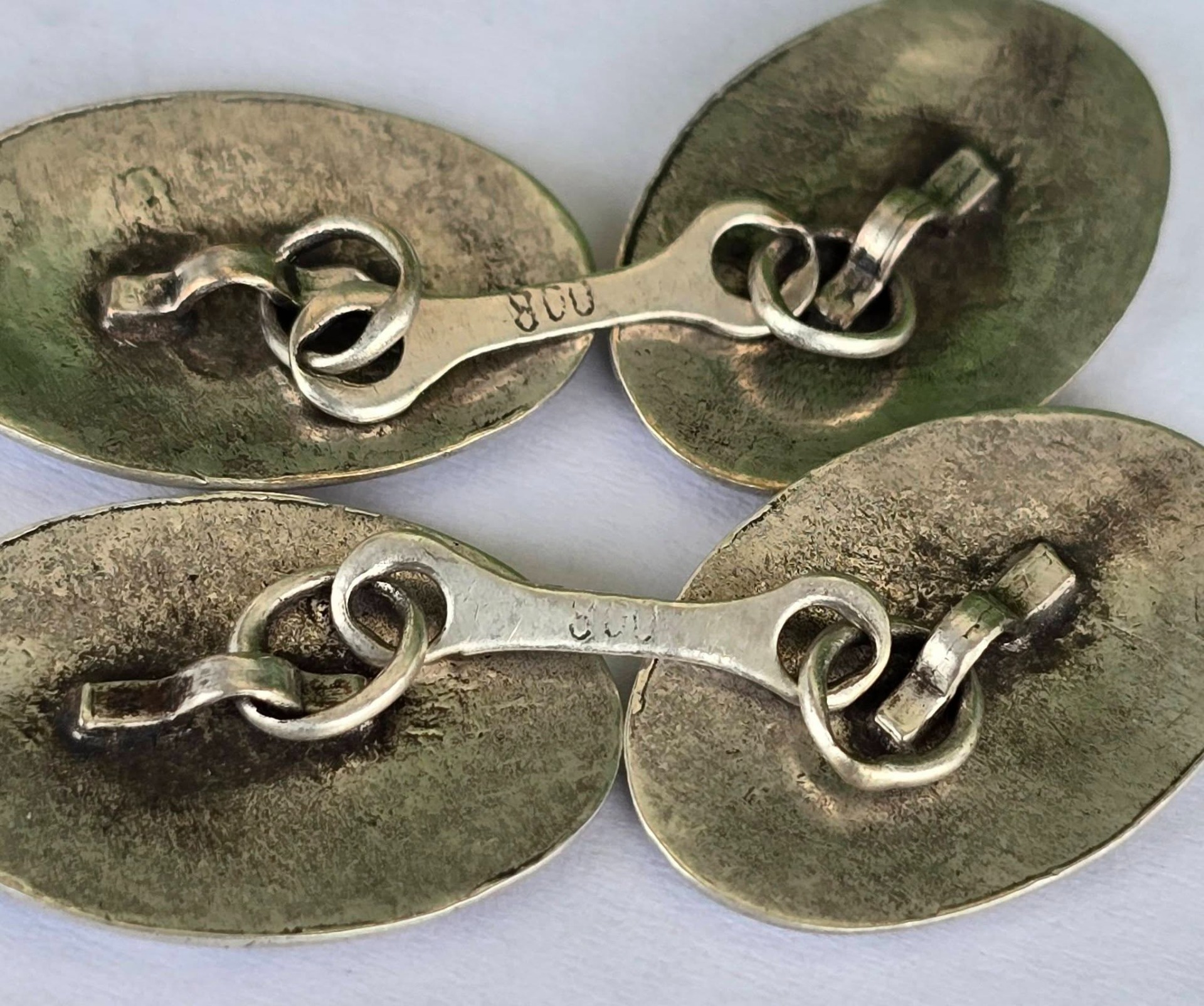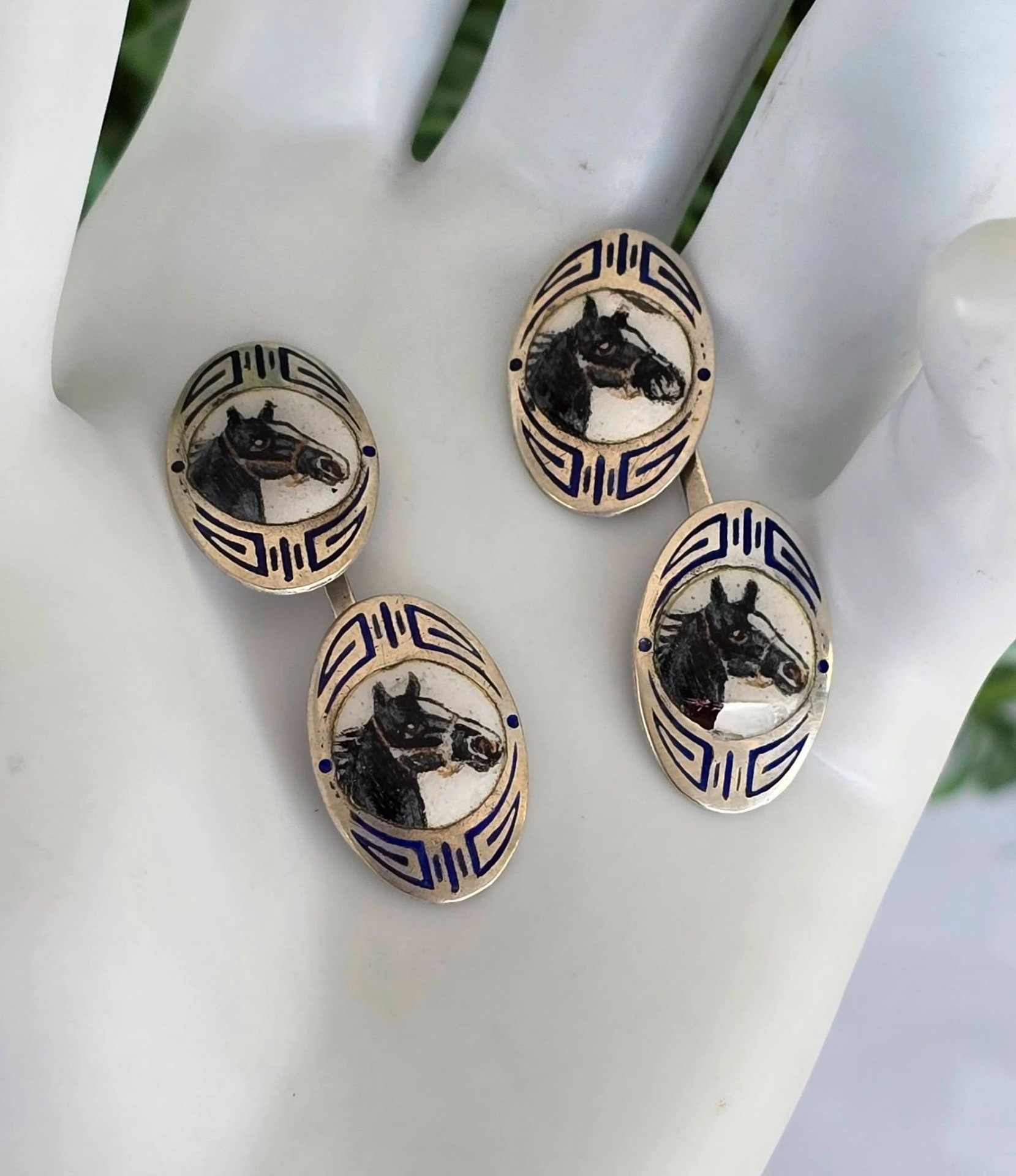 Butoni vechi din argint, cu email pictat manual, rari, de colecție (anii 1920-1930, Italia).
