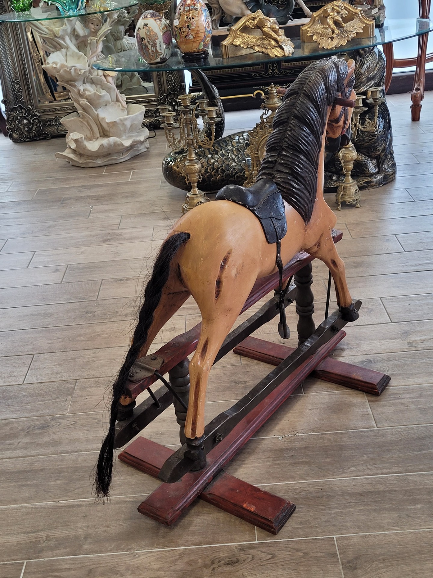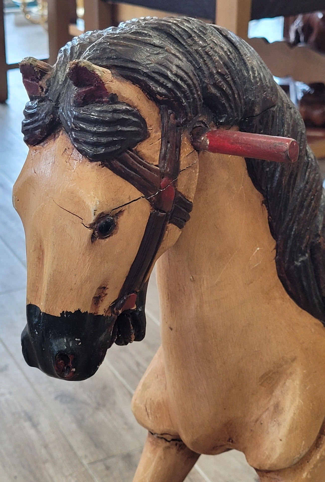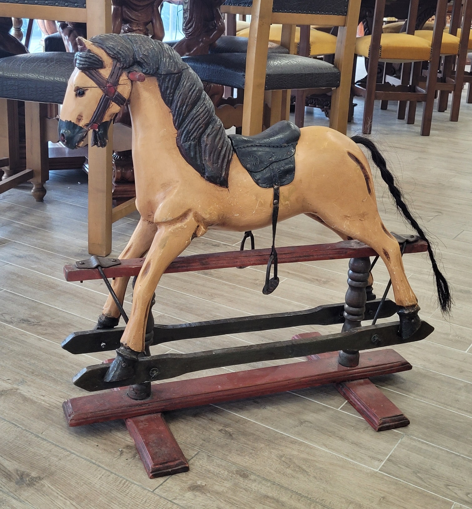 Cal balansoar vintage, din lemn sculptat manual, piesă de colecție.