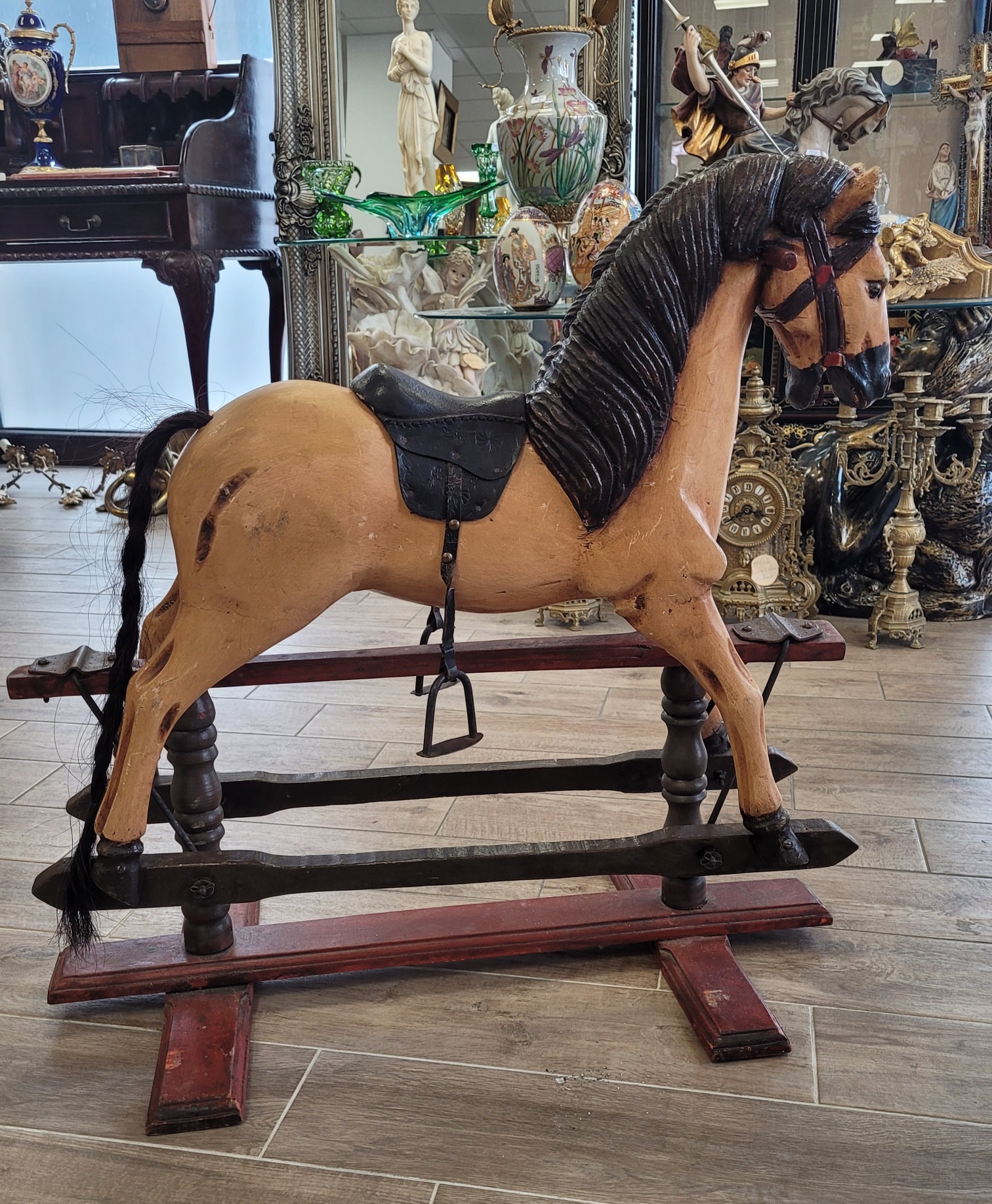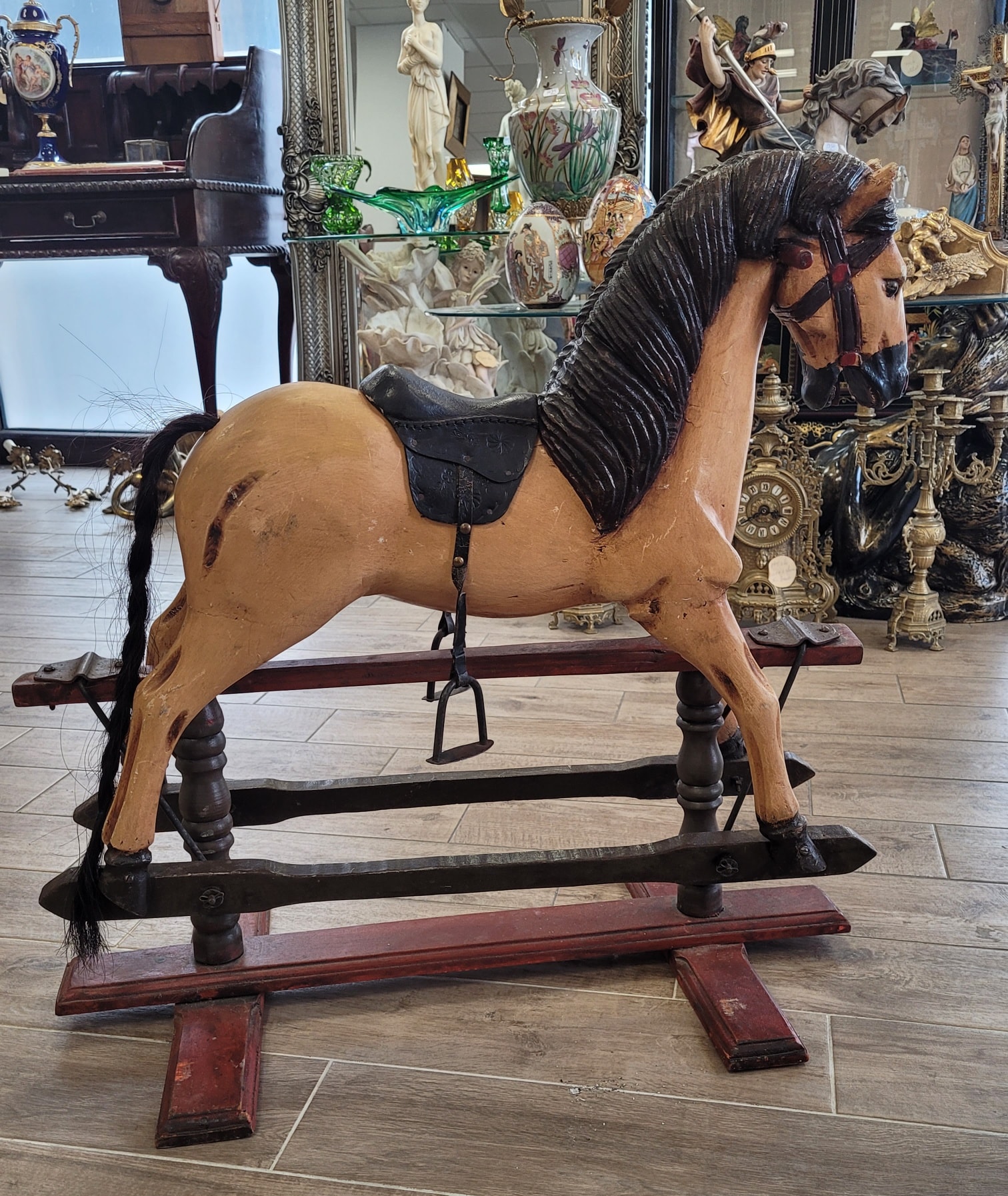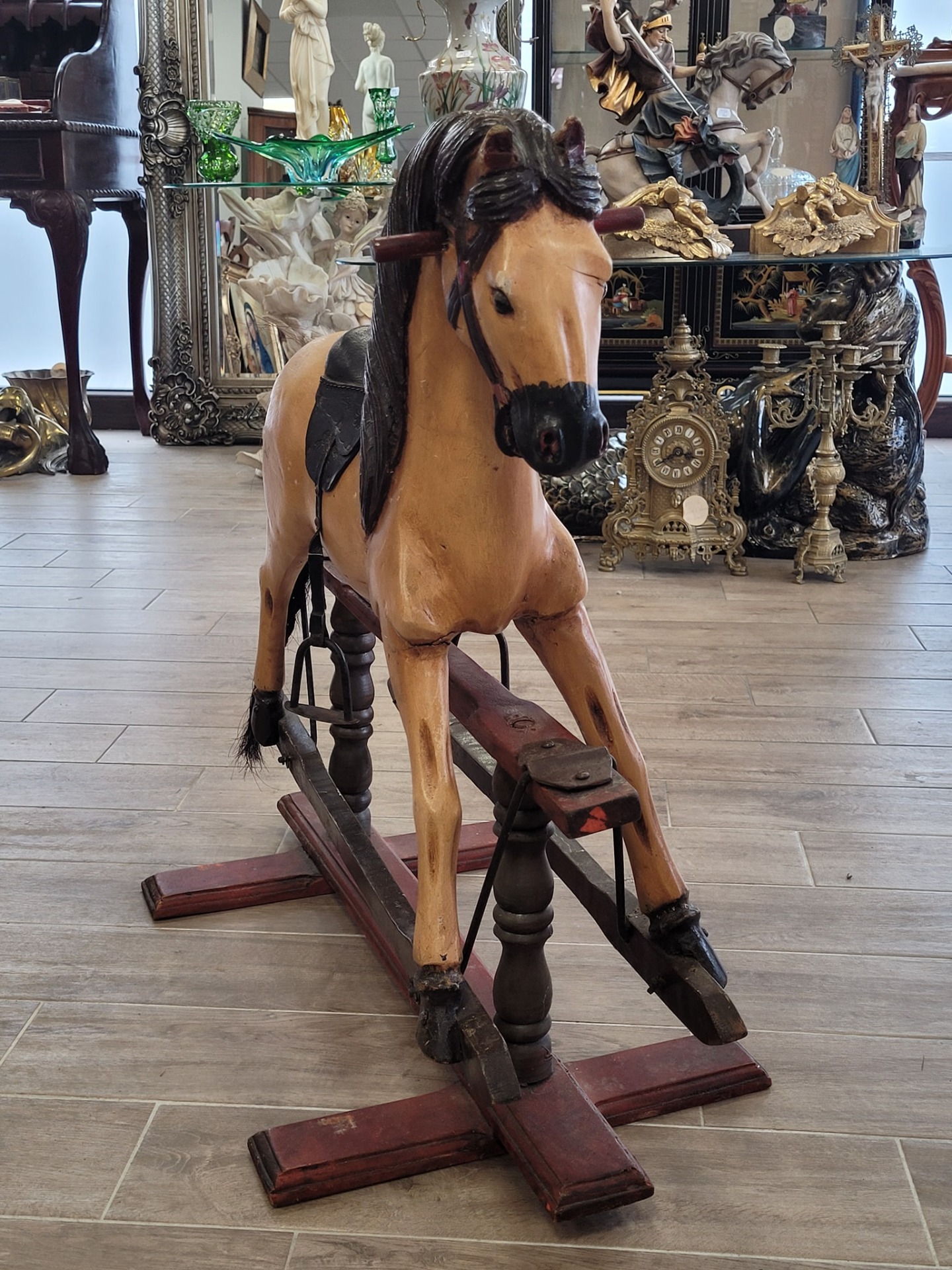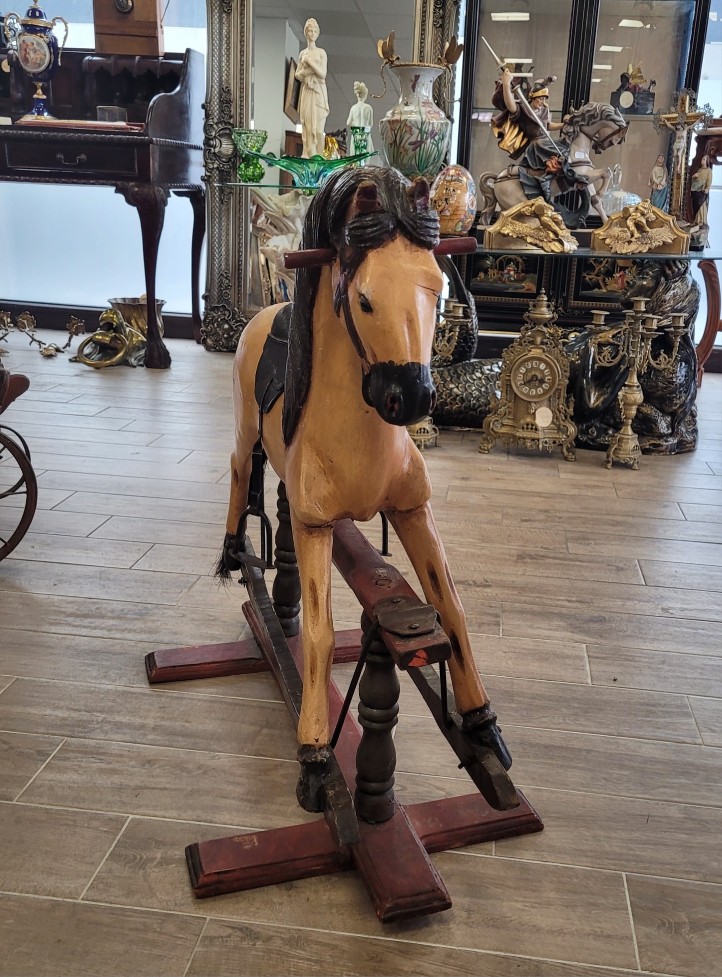 Cal balansoar vintage, din lemn sculptat manual, piesă de colecție.