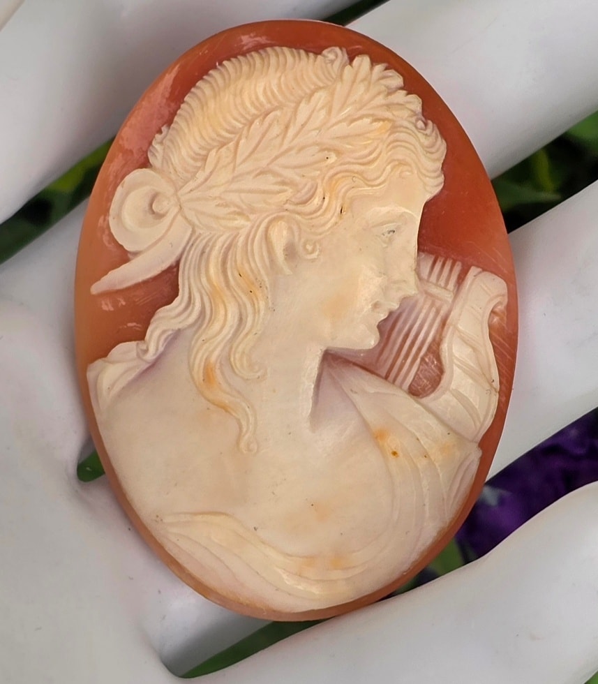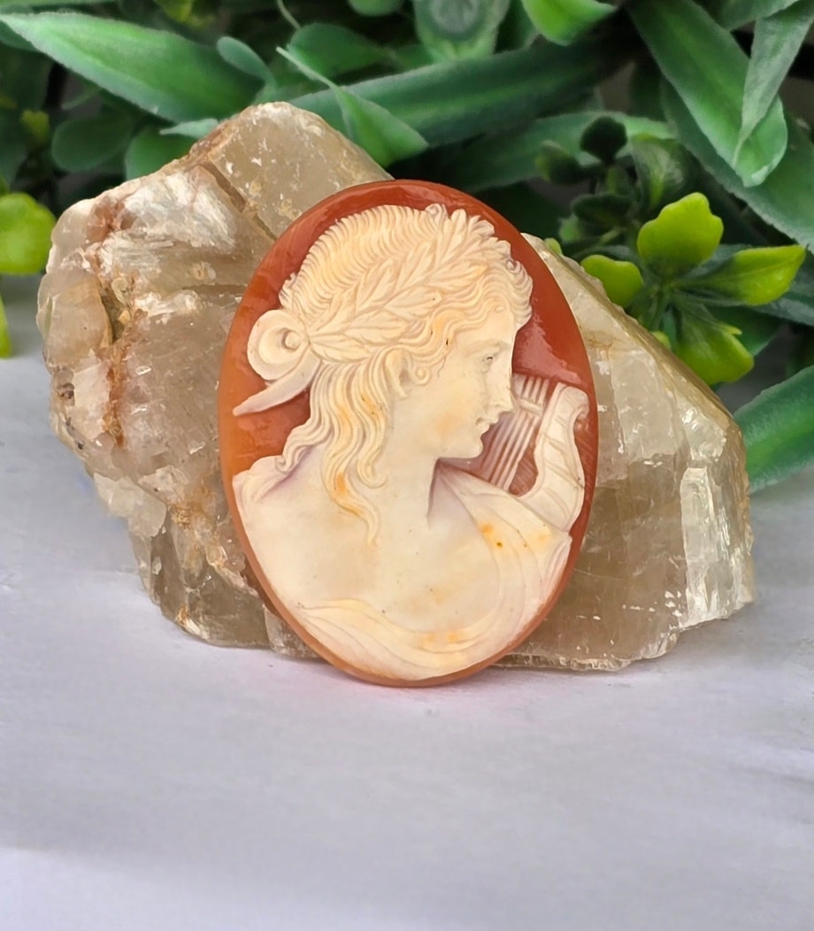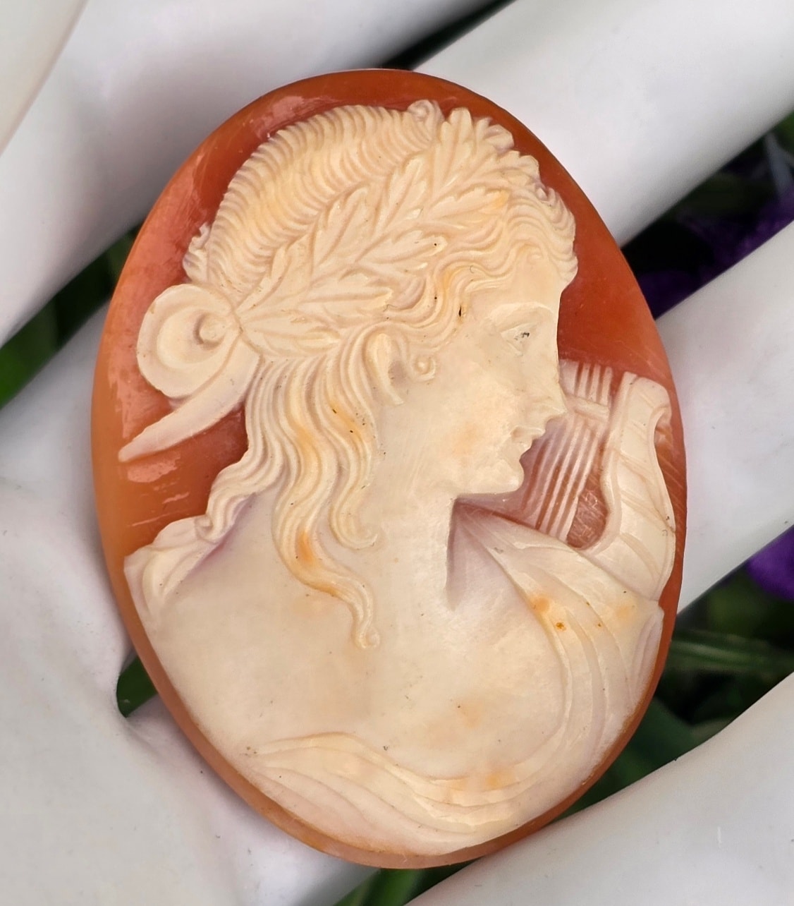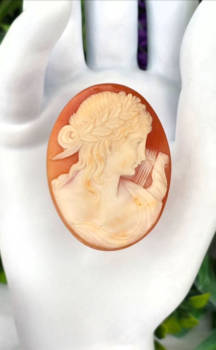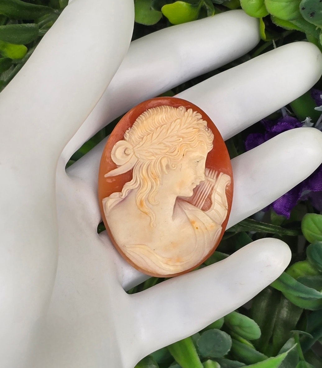 Camee vintage spectaculoasă, sculptată manual în scoică "Carnelian" naturală, în stil Neoclasic, cu scenă mitologică care înfățișează o muză a artelor lângă o