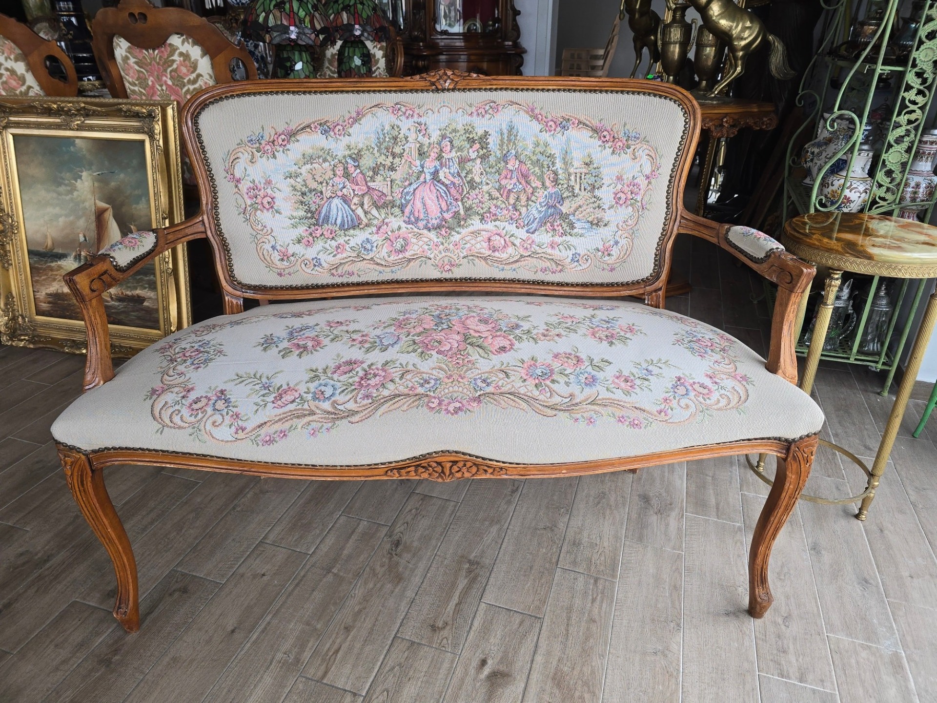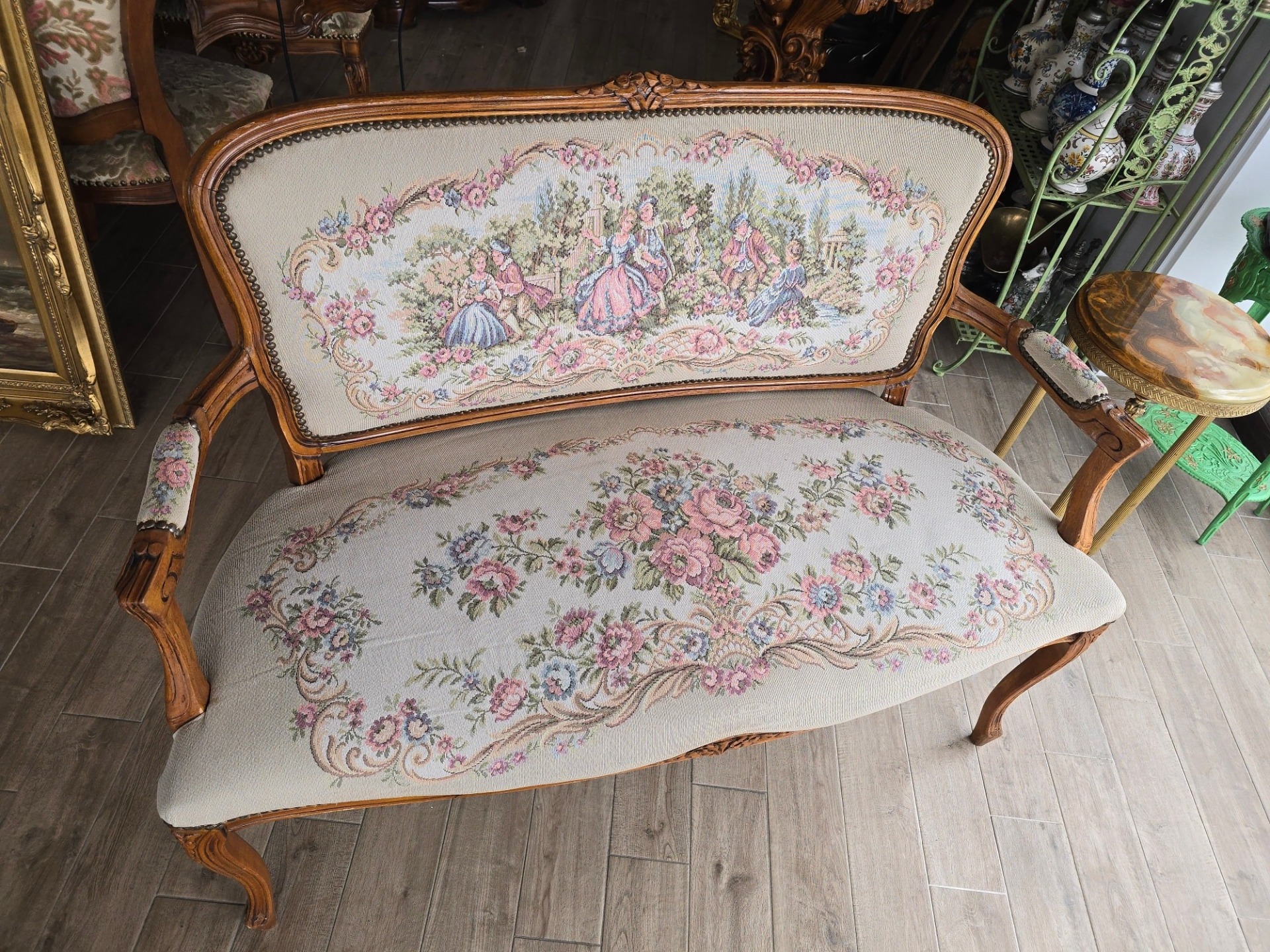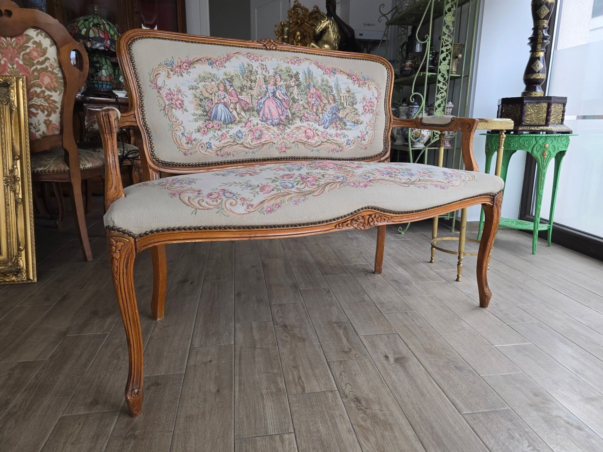 Canapea vintage din lemn cu tapiserie cu scene galante.