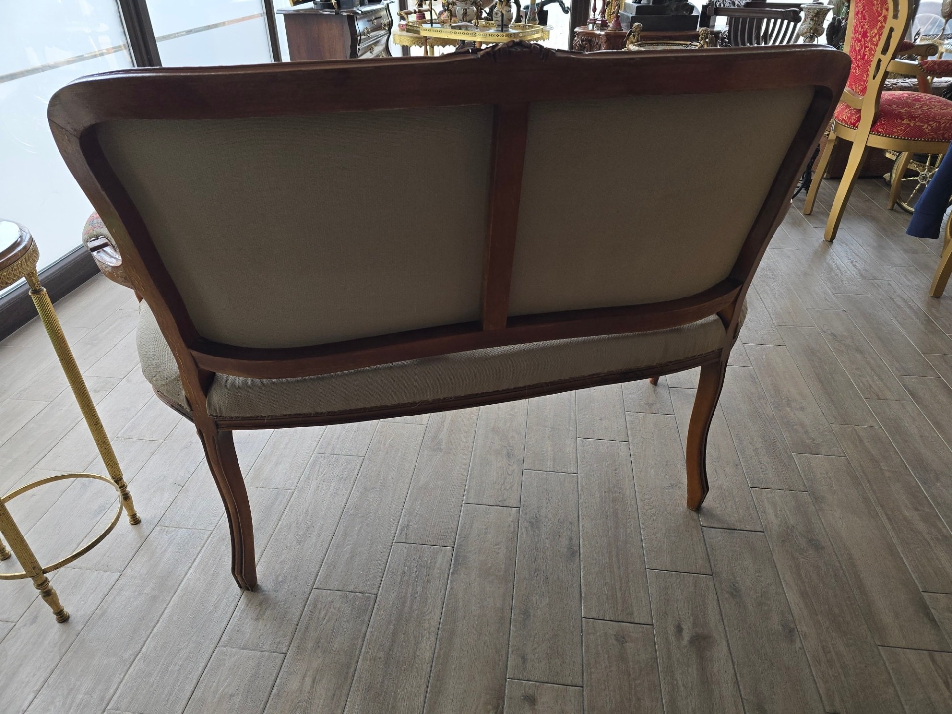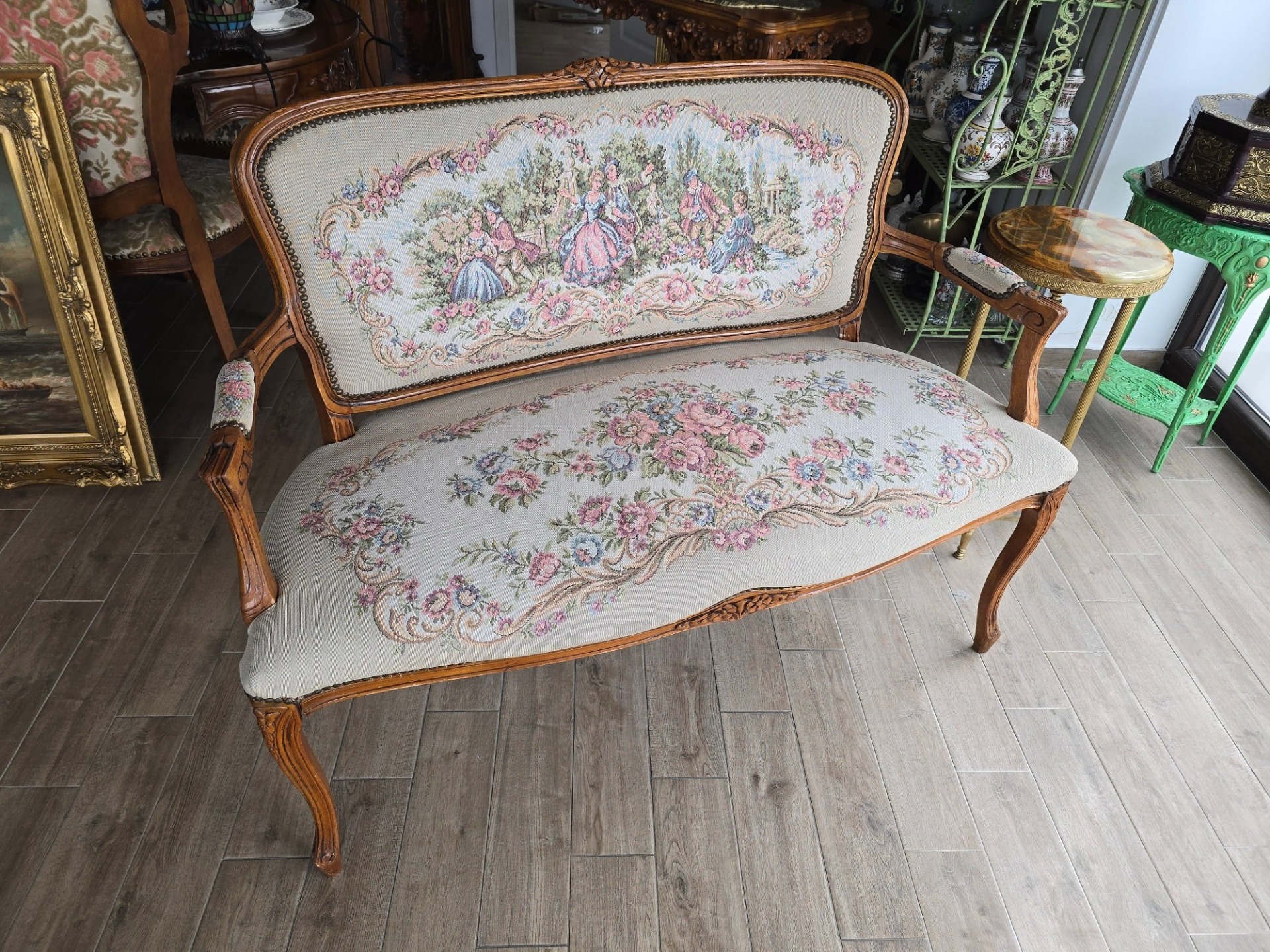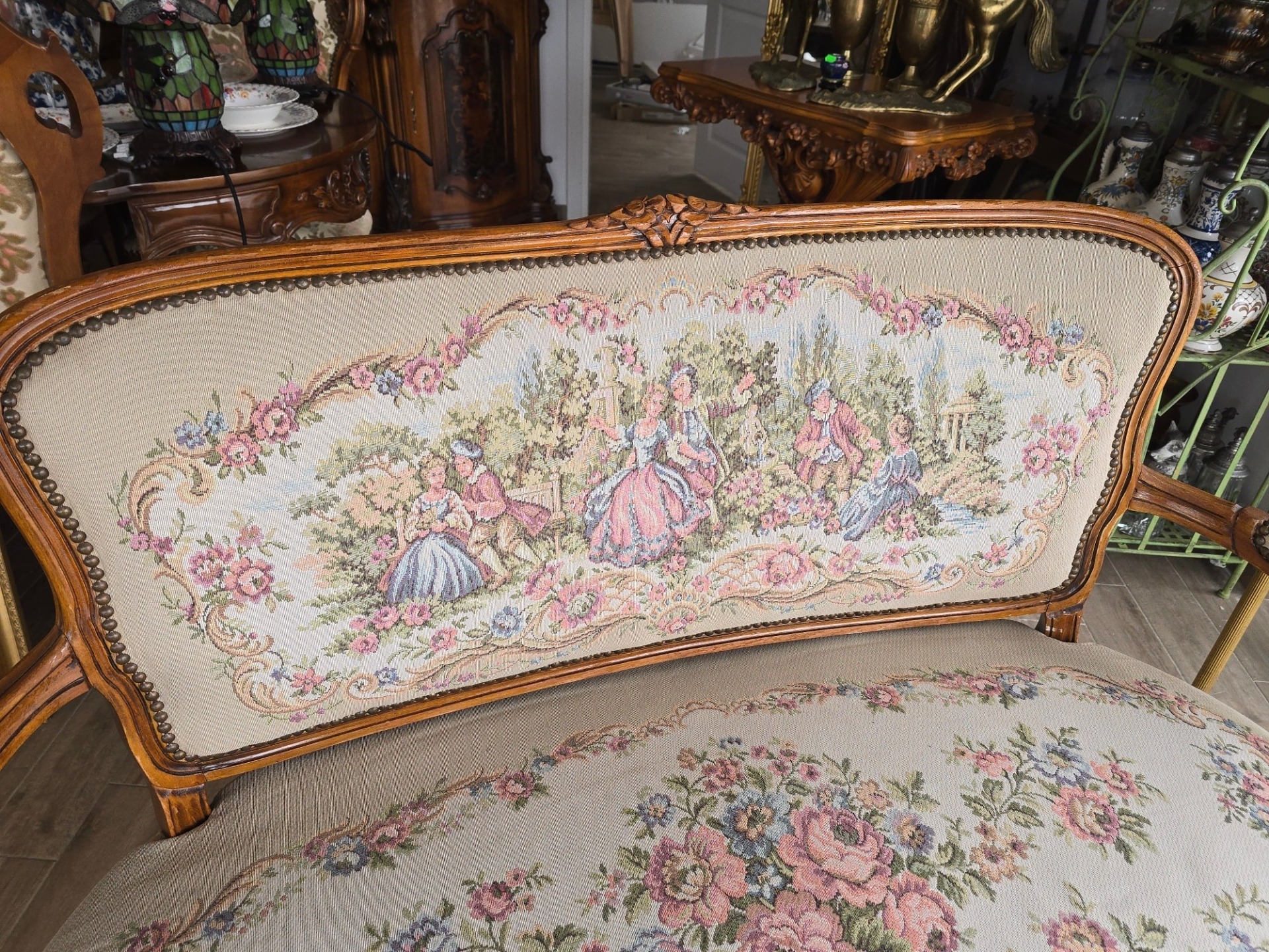 Canapea vintage din lemn cu tapiserie cu scene galante.