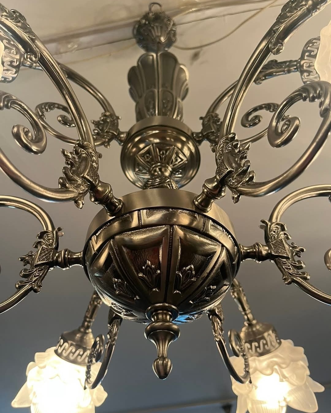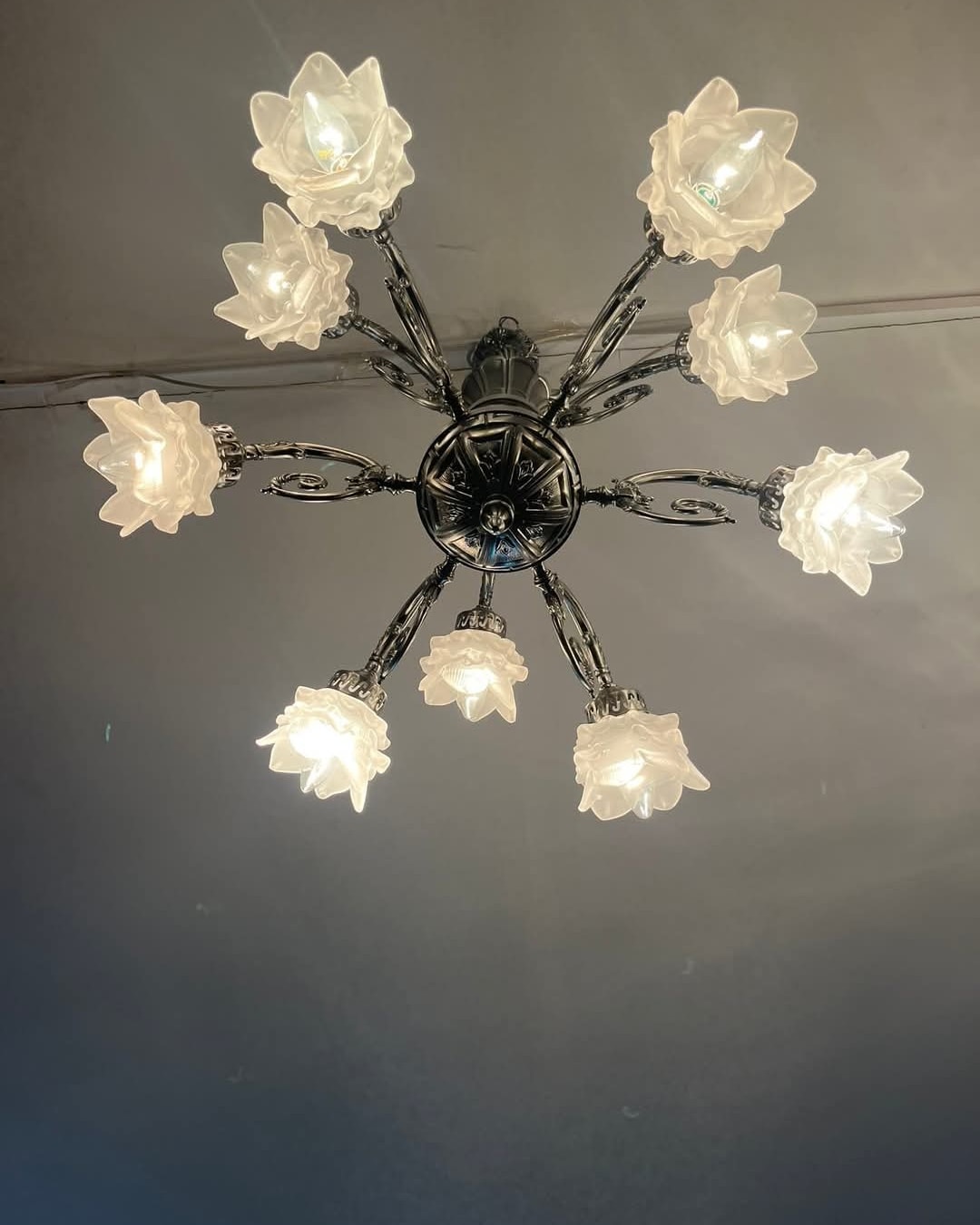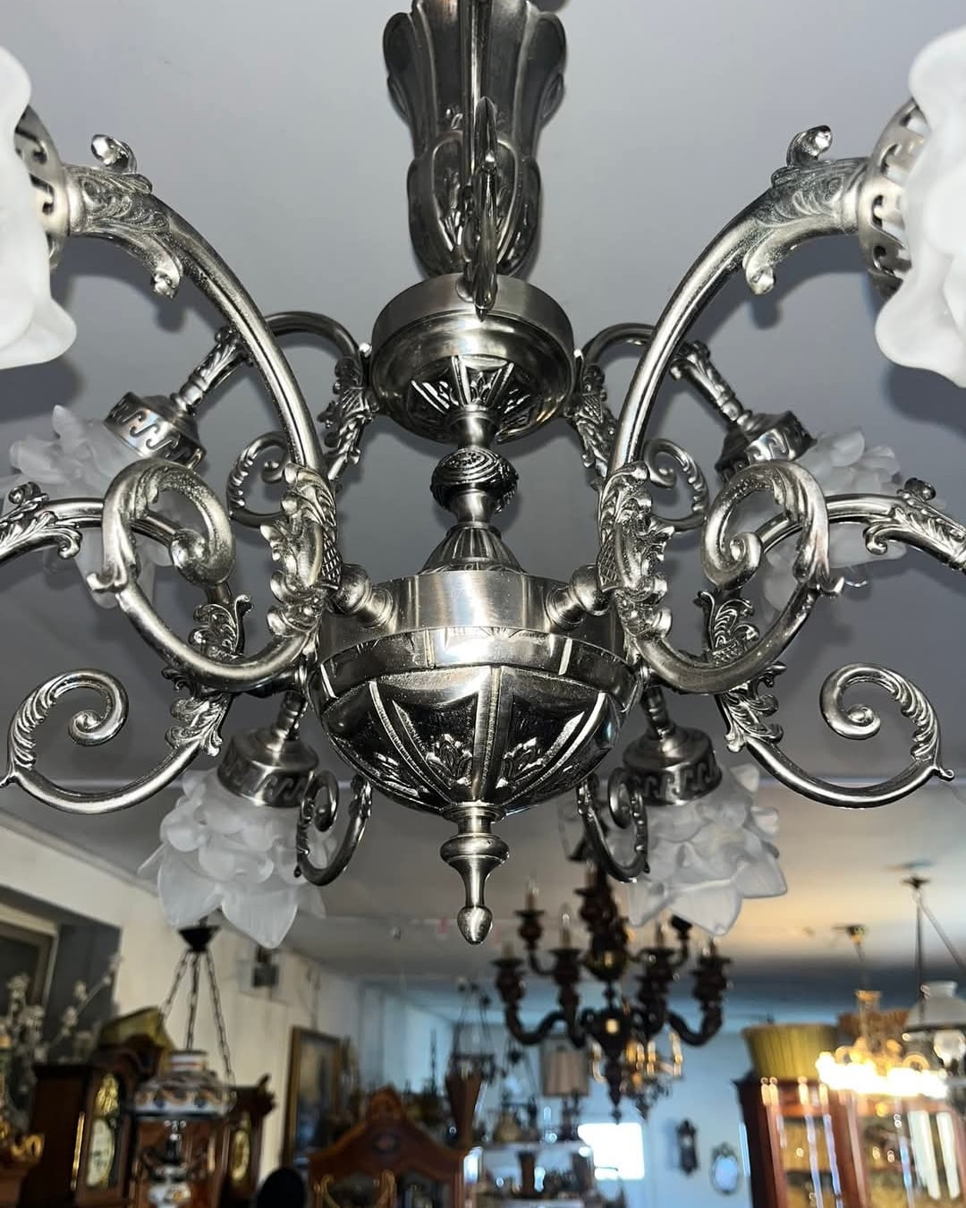 Candelabru argintiu pe doua nivele cu 9 brate,posibil alama placata cu nichel satinat.