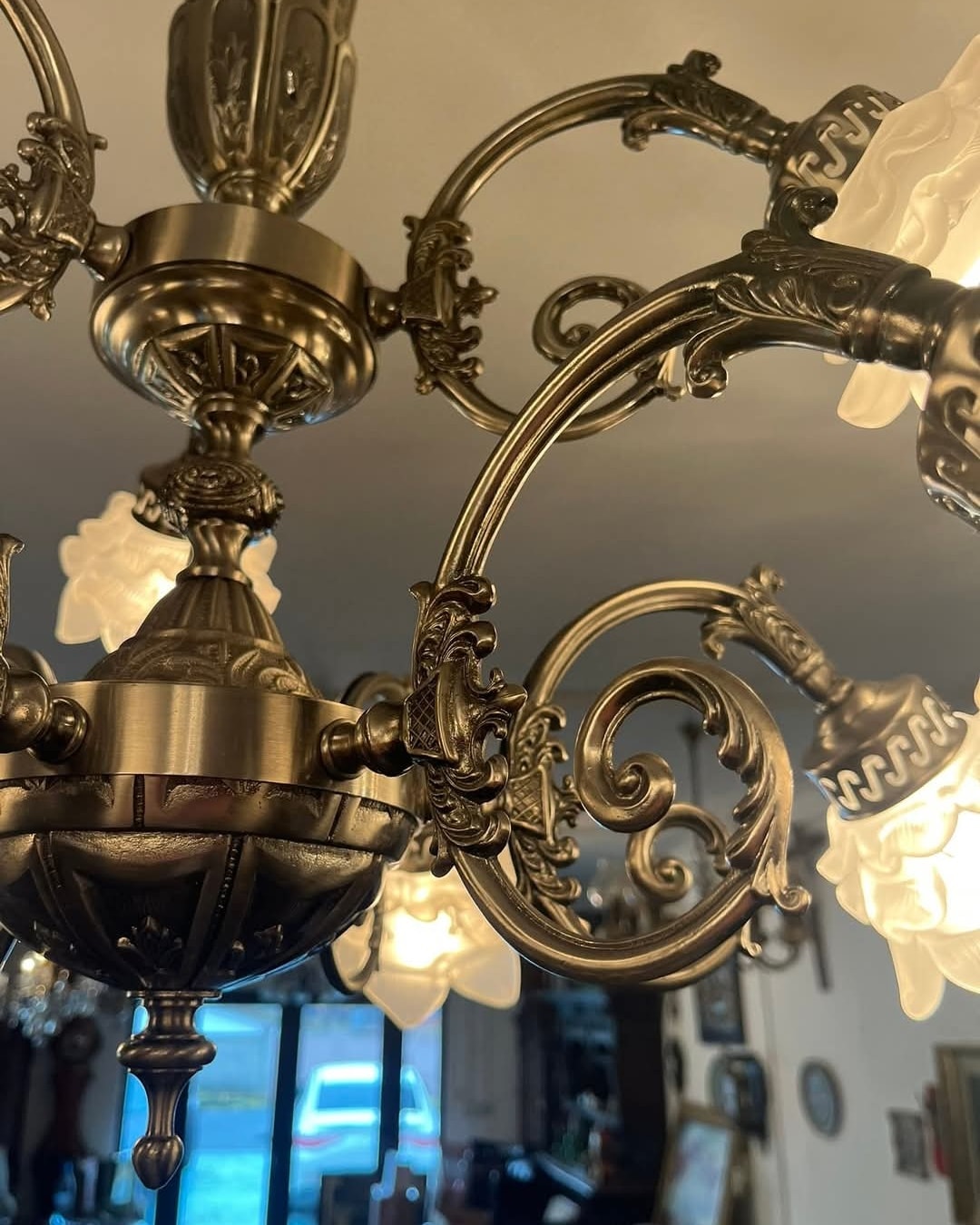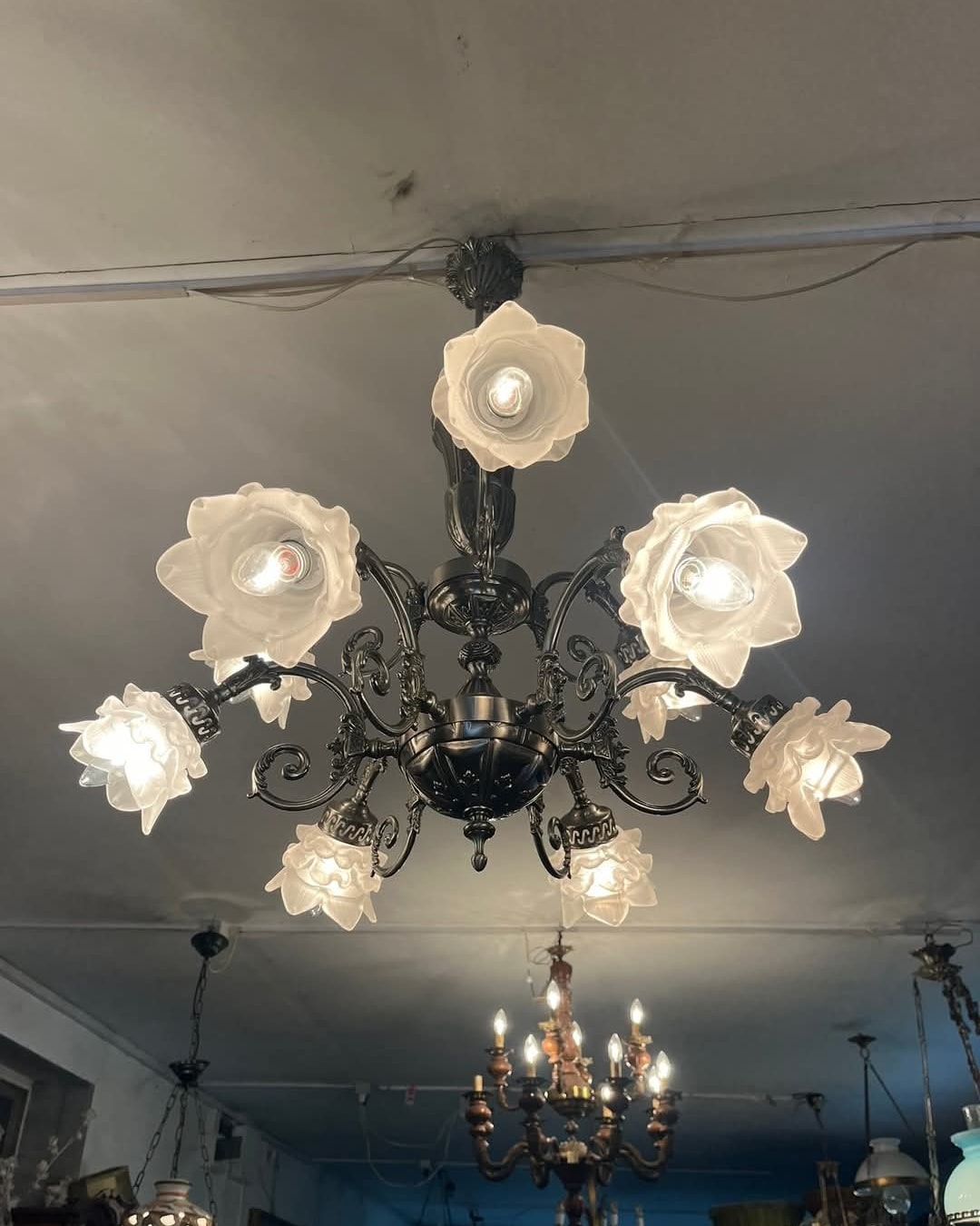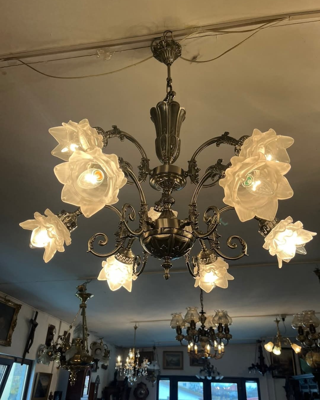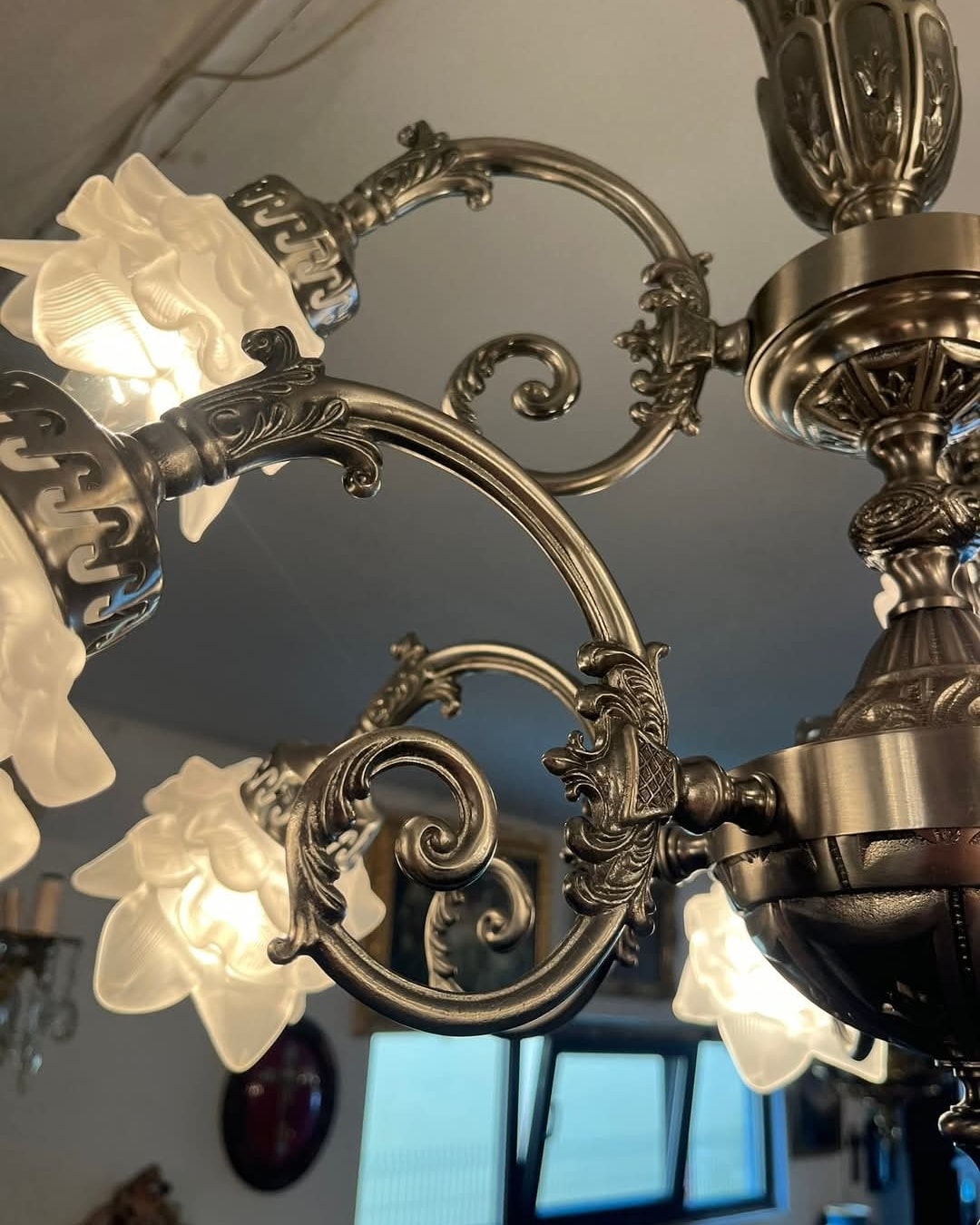 Candelabru argintiu pe doua nivele cu 9 brate,posibil alama placata cu nichel satinat.