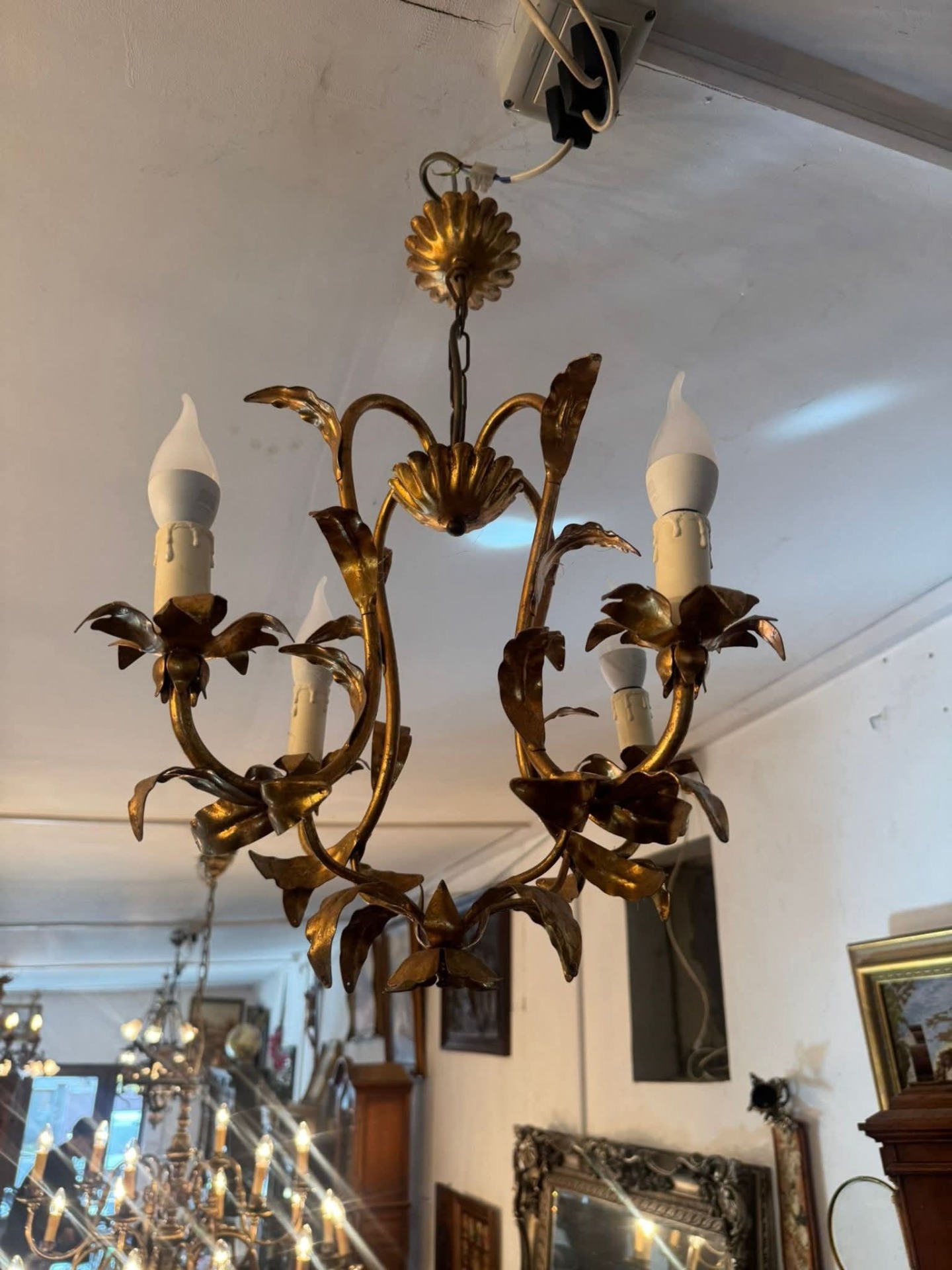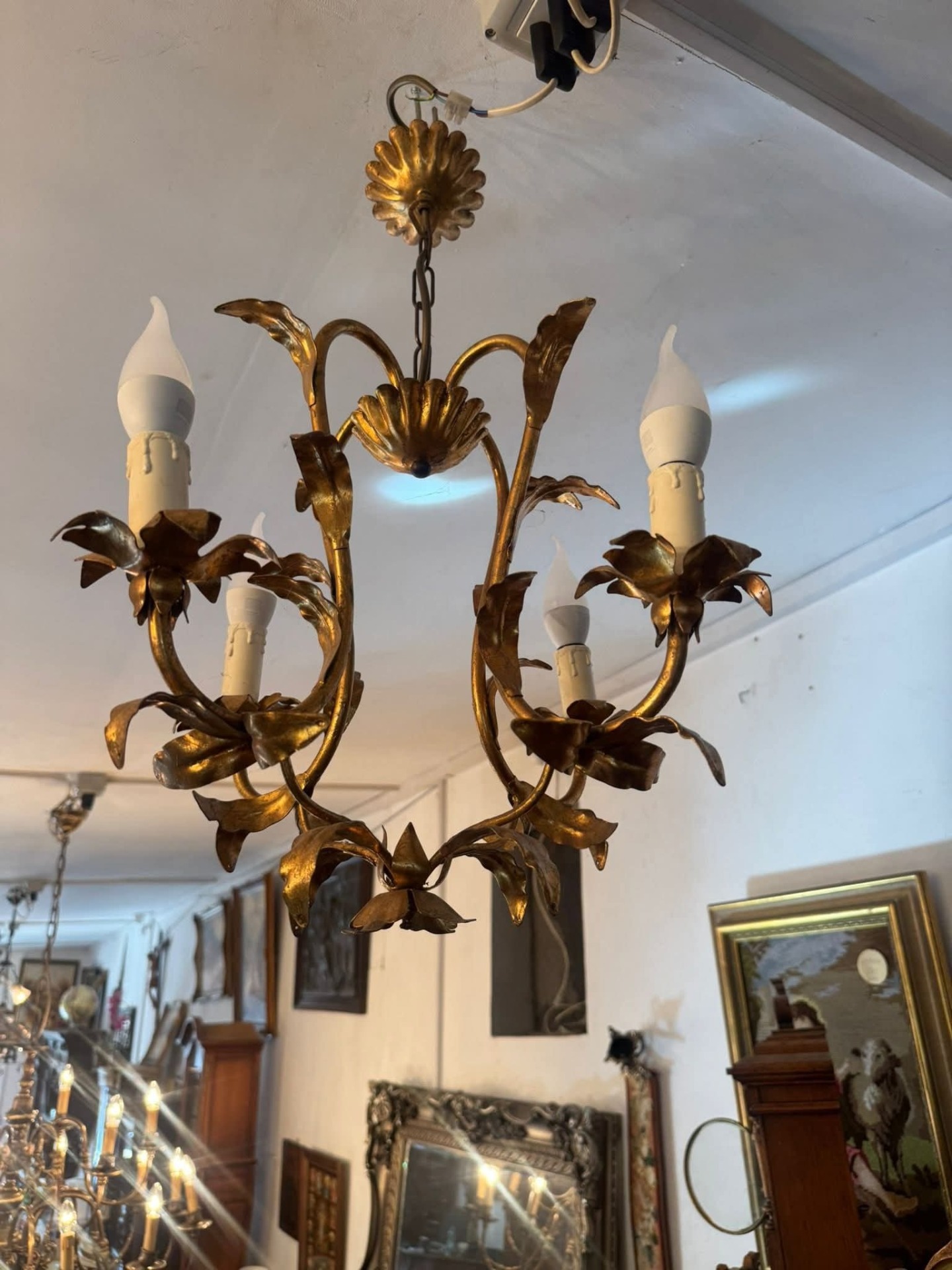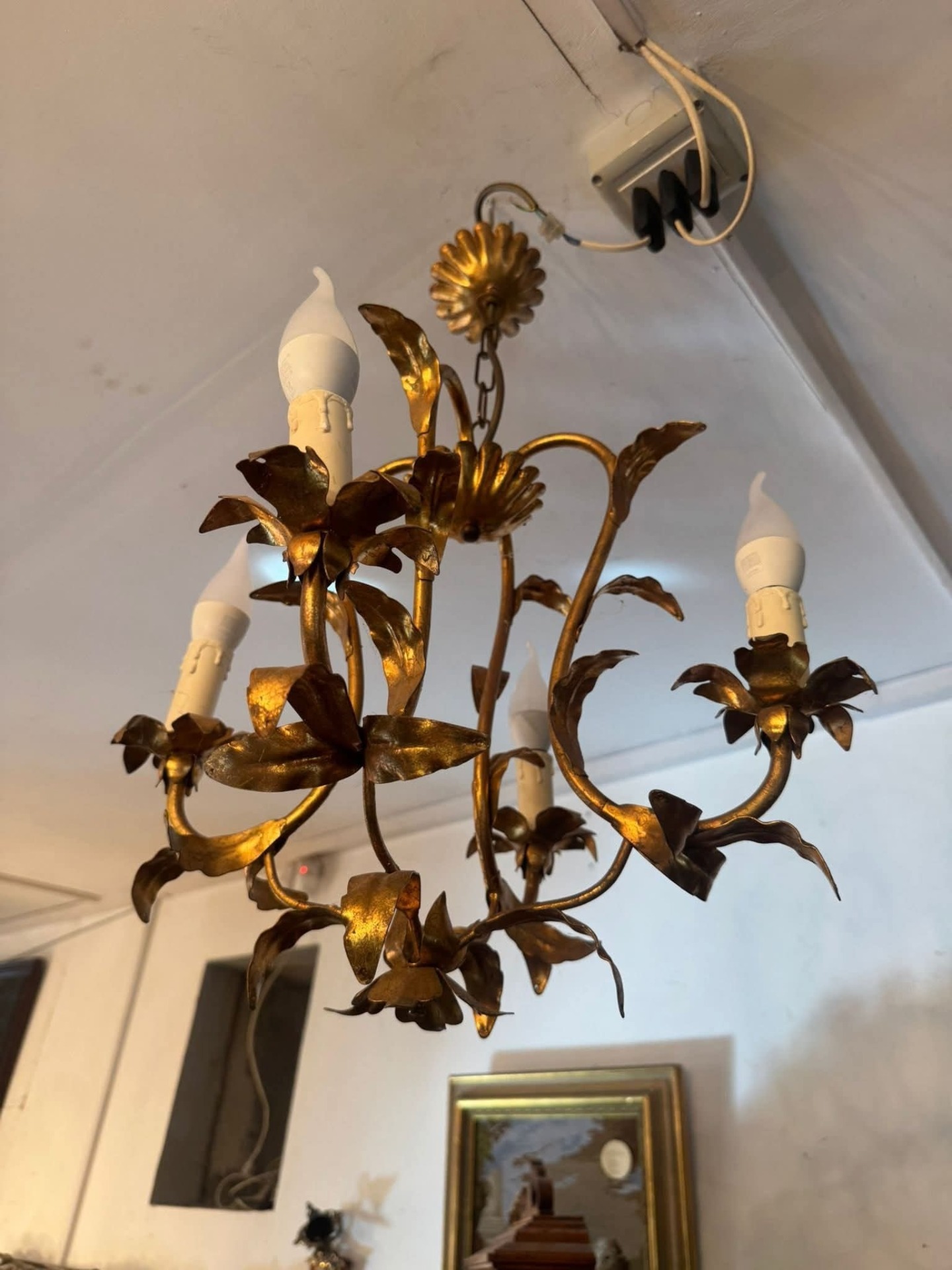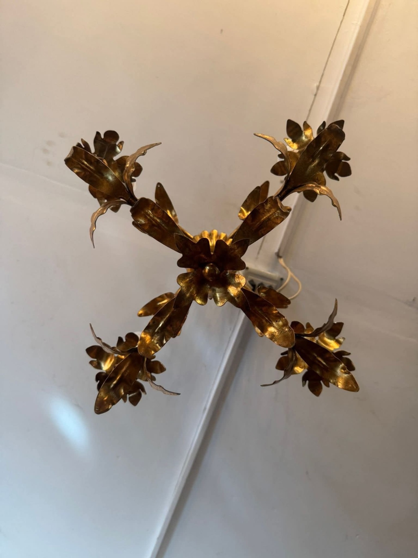 Candelabru vintage cu 4 brațe, realizat din metal, cu finisaj auriu antichizat. Model delicat, inspirat din forme florale, cu frunze și flori metalice lucrate