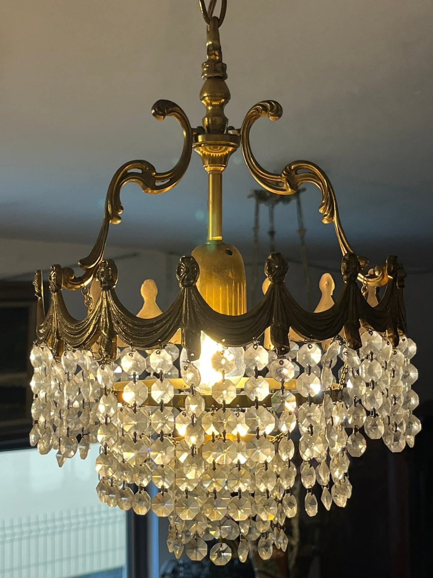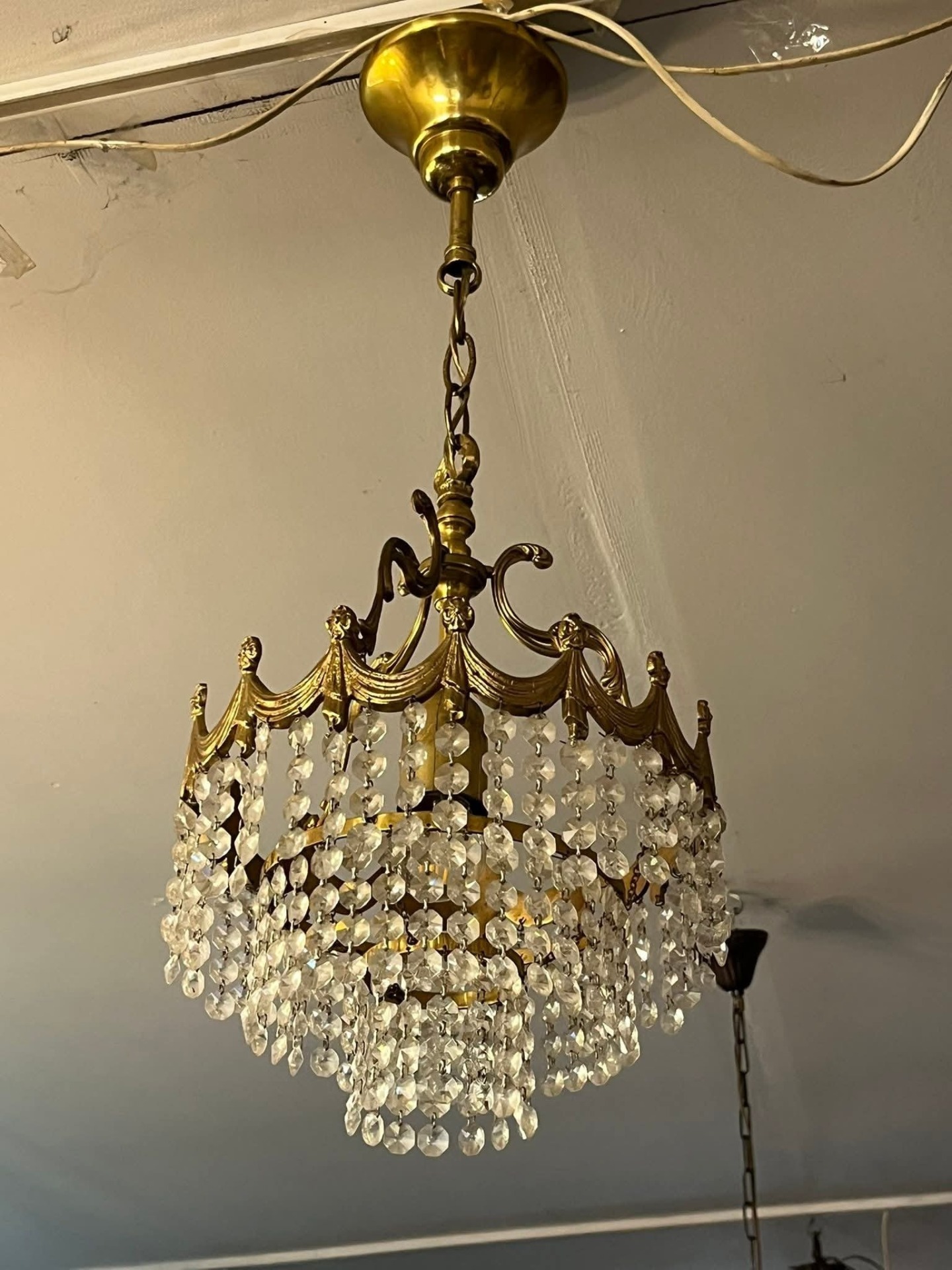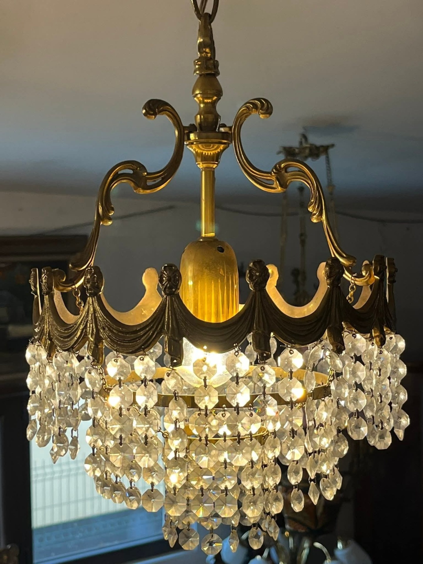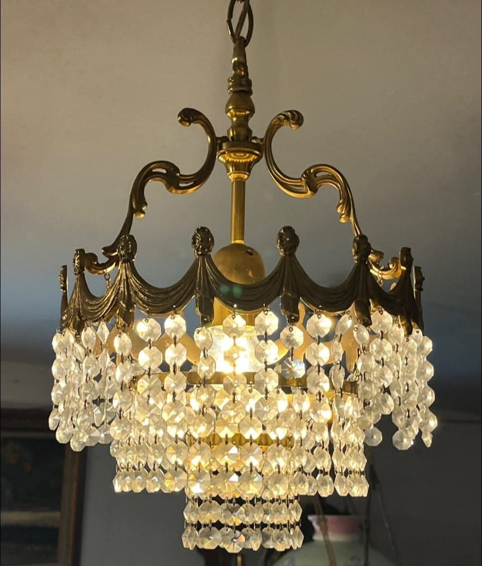 Candelabru vintage din alamă masivă, model elegant, cu detalii decorative și șiruri de cristale fațetate care oferă un efect spectaculos de lumină. Piesa este