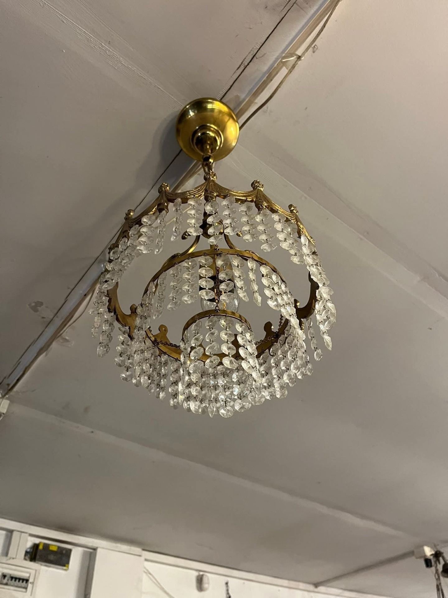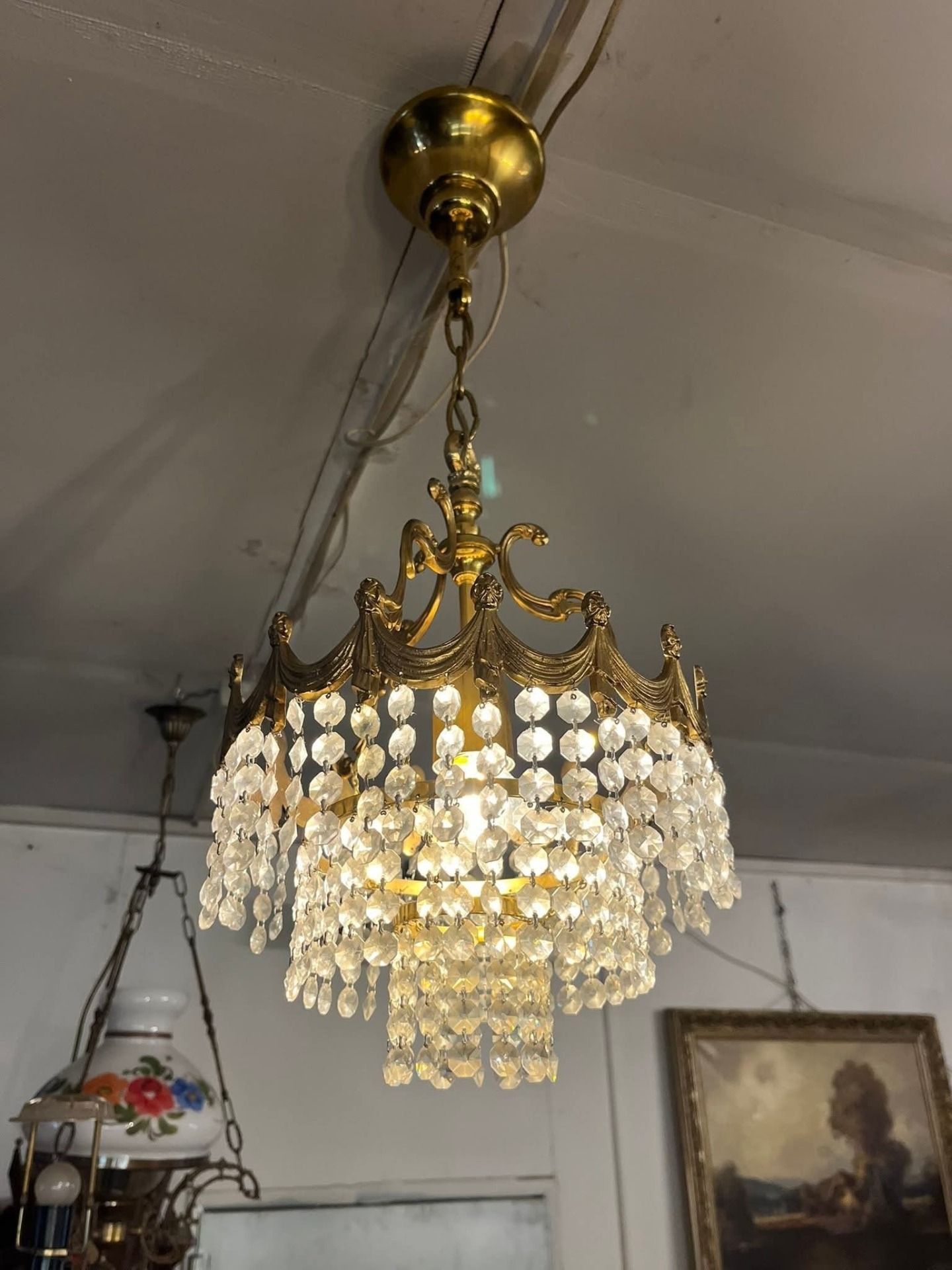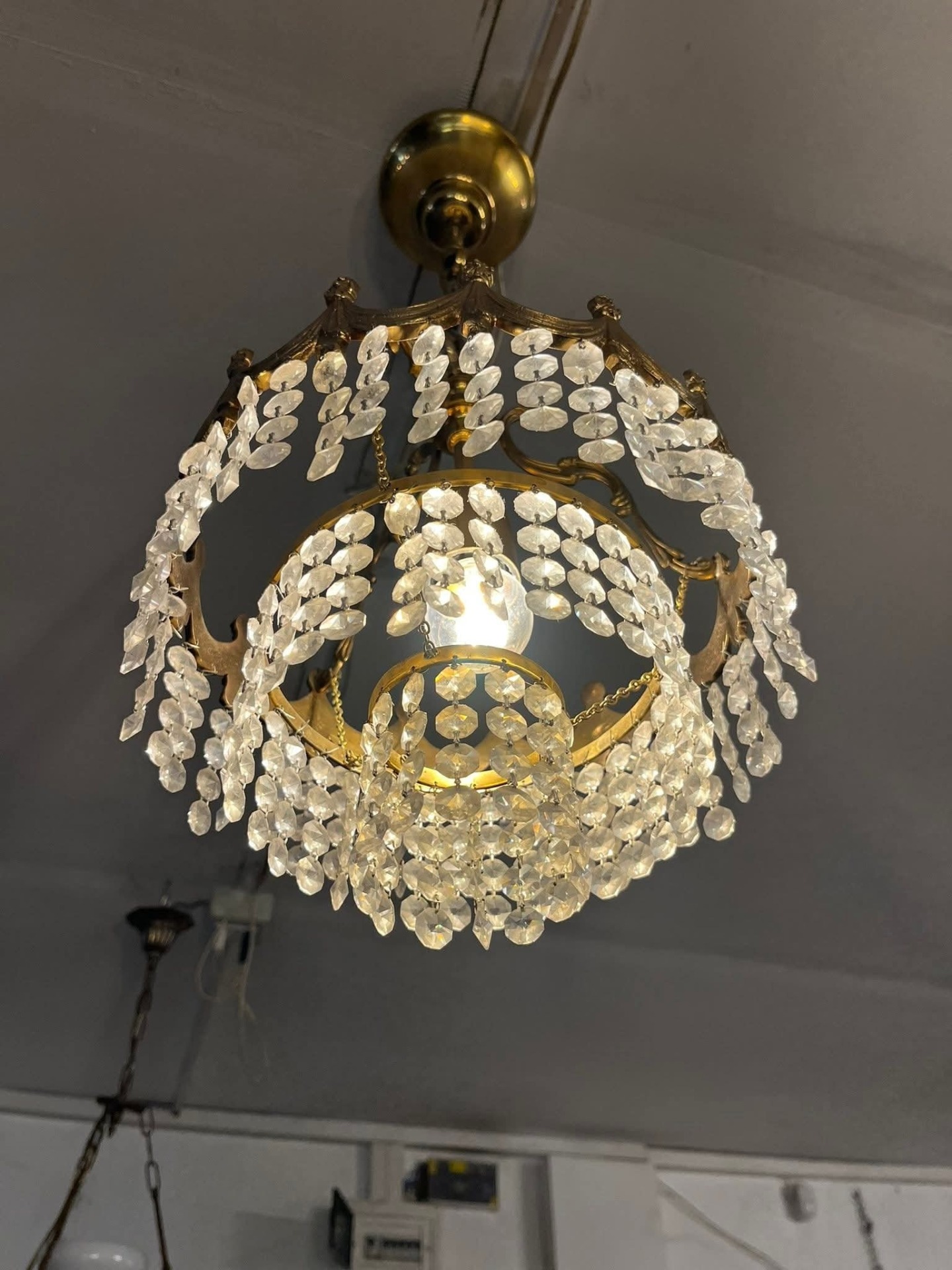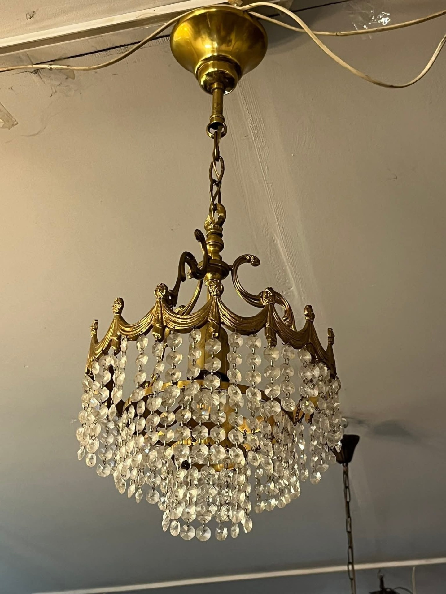Candelabru vintage din alamă masivă, model elegant, cu detalii decorative și șiruri de cristale fațetate care oferă un efect spectaculos de lumină. Piesa este