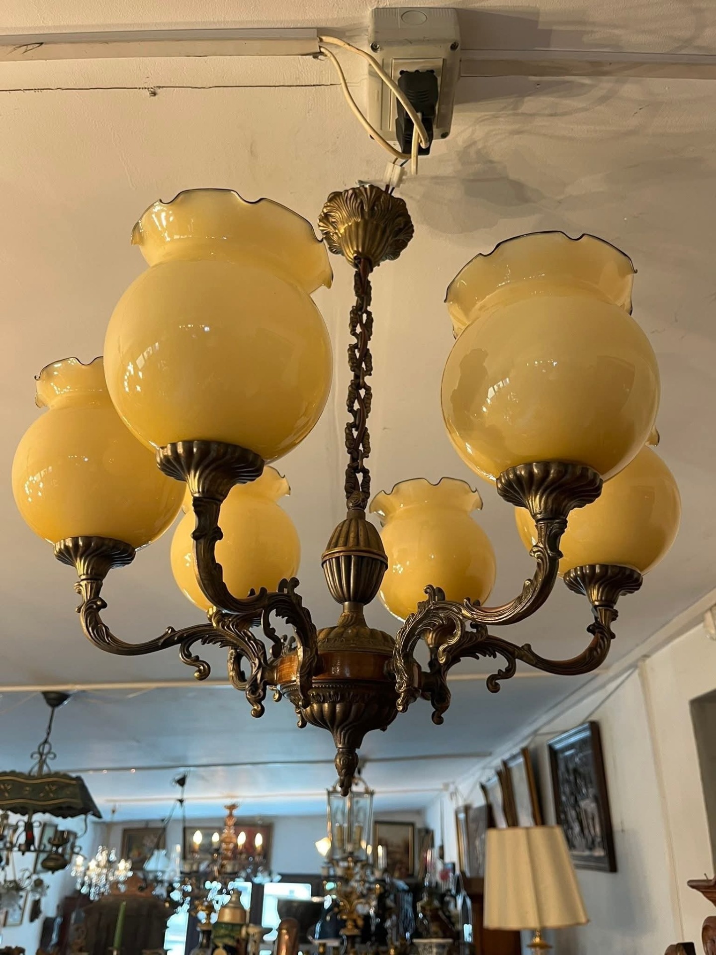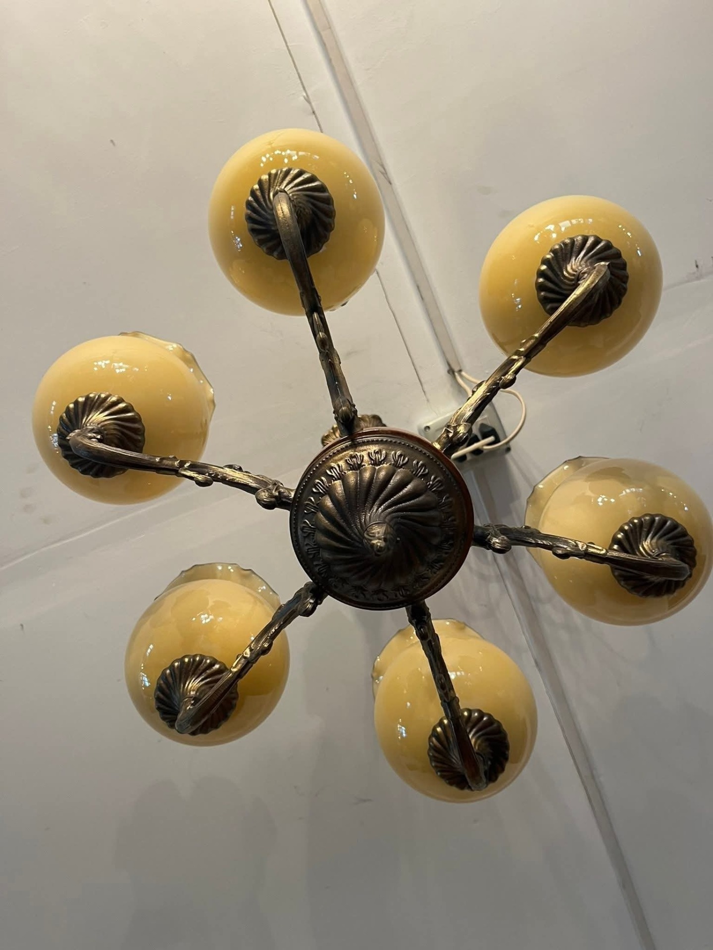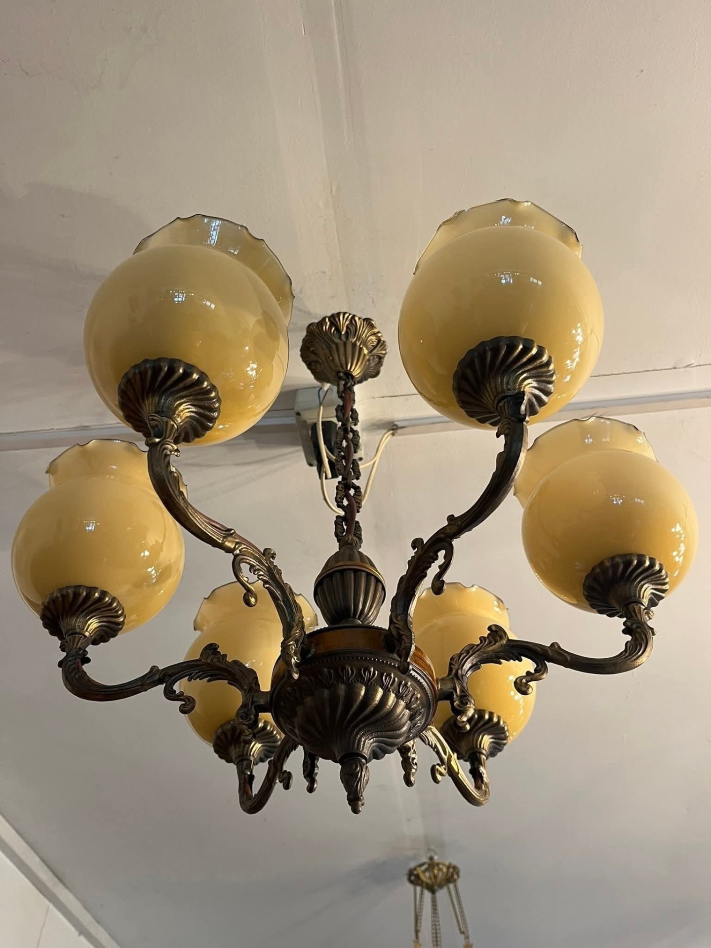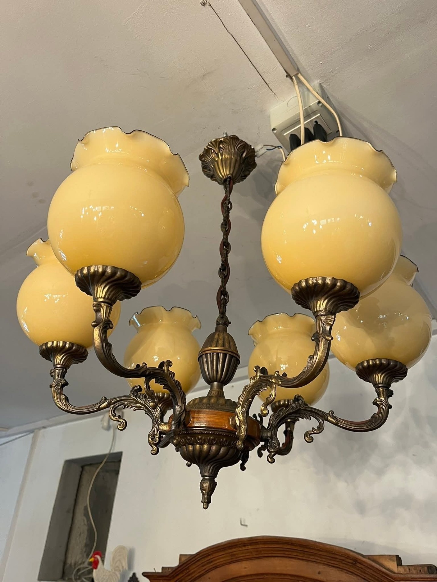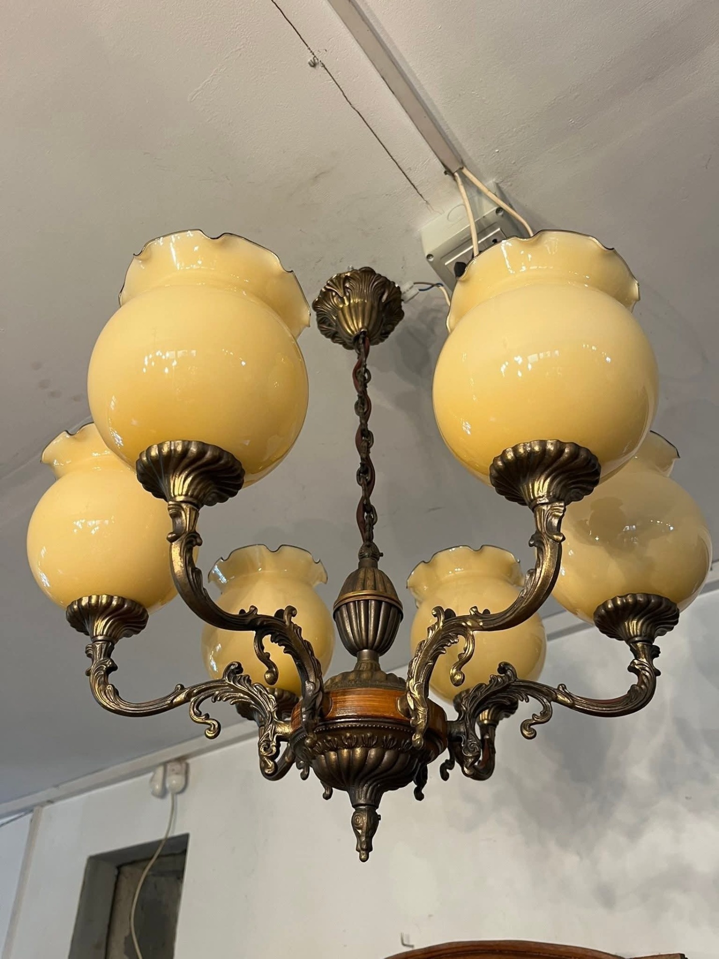 Piesă elegantă, cu design clasic, perfectă pentru un interior rafinat sau o casă decorată în stil vintage sau retro. Candelabrul este realizat din bronz masiv cu detalii decorative bogate și element central din lemn. Cele 6 abajururi sunt din sticlă opalină galben-aurie, cu margine ondulată, oferind o lumină caldă și plăcută
