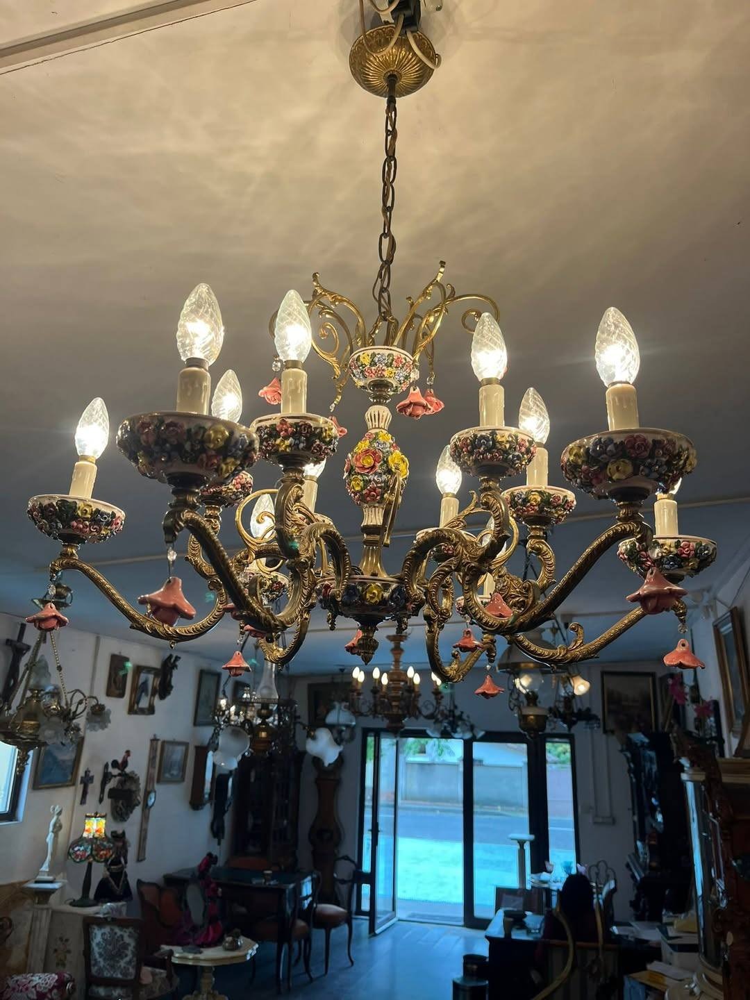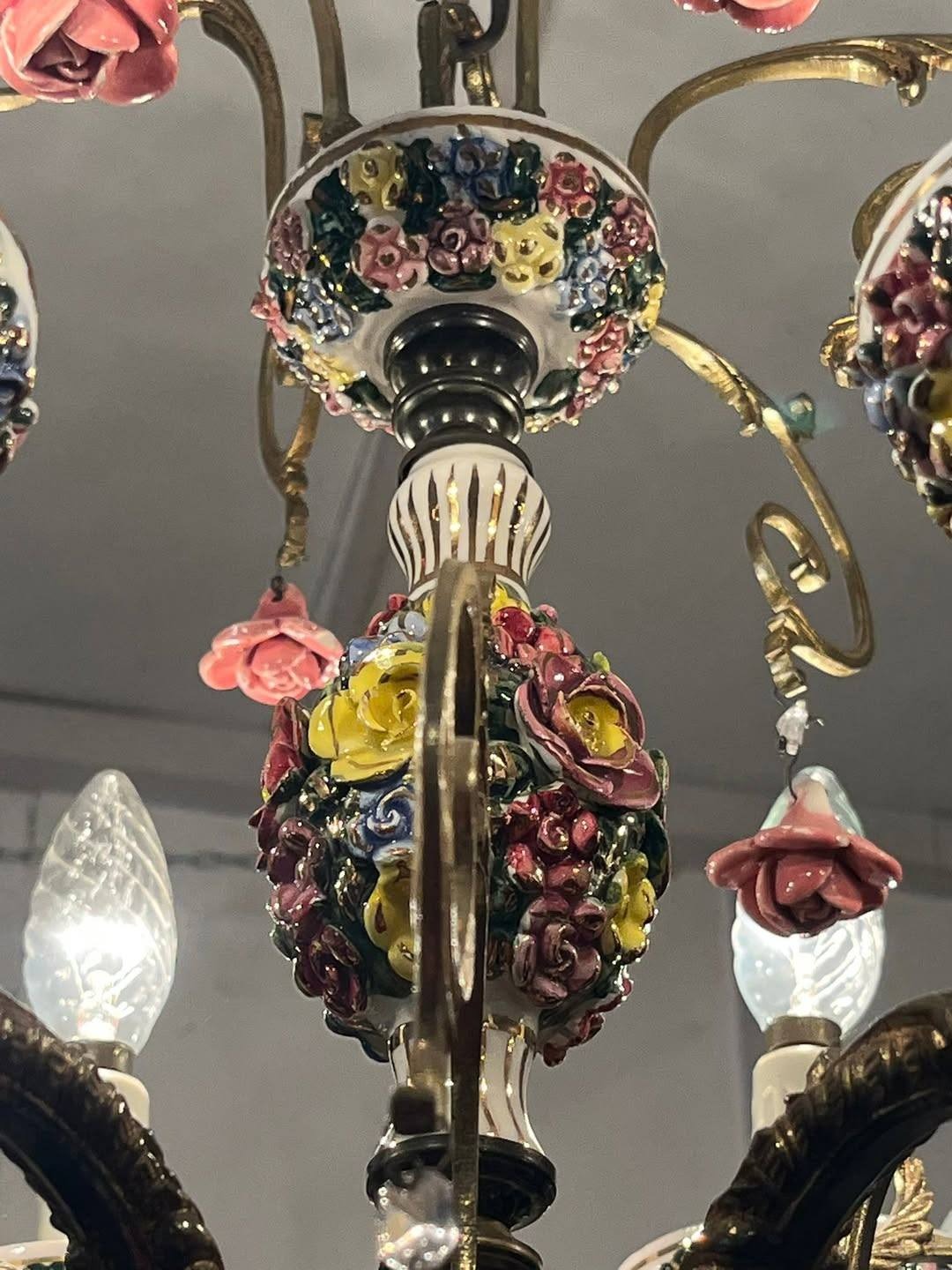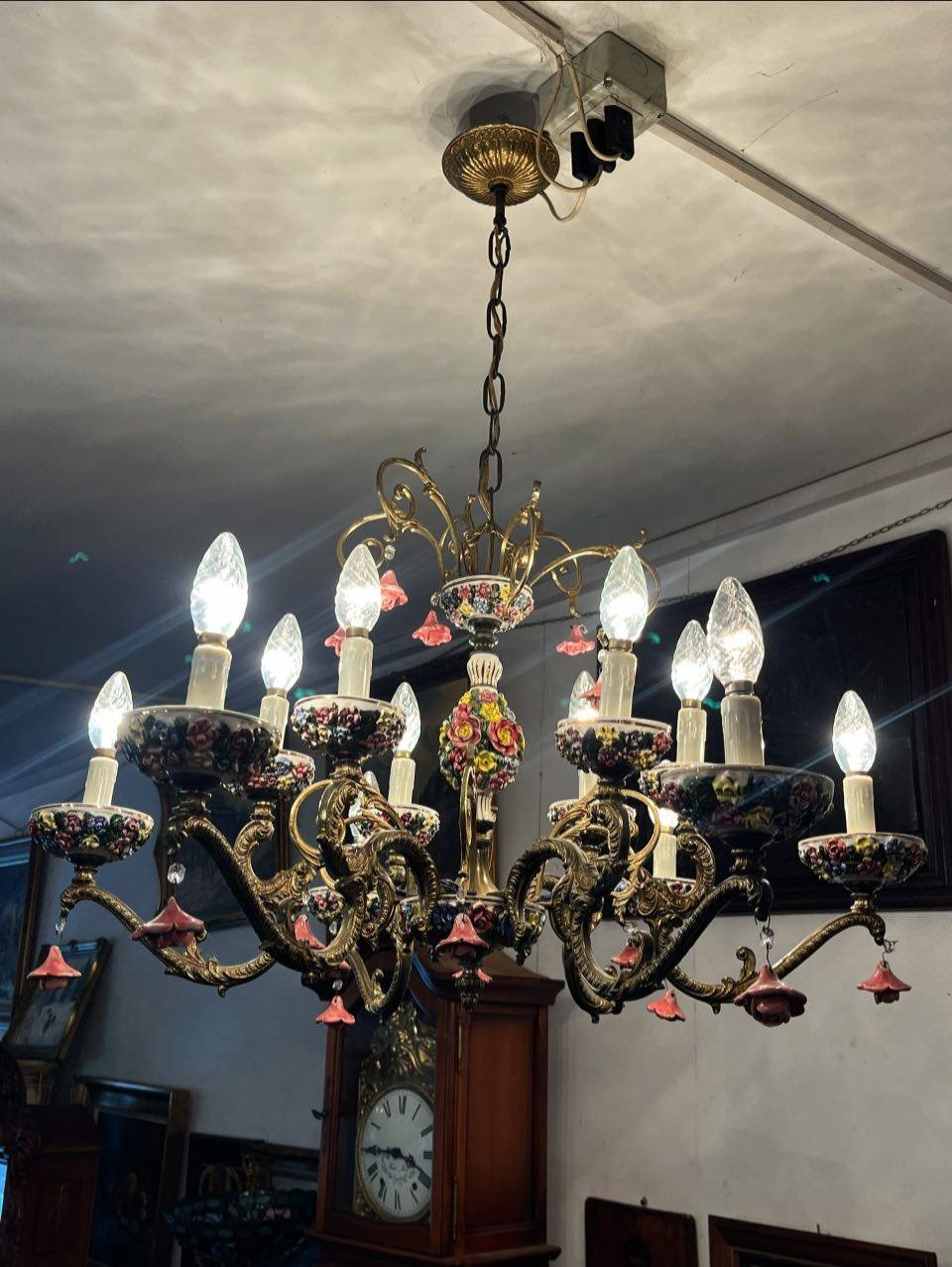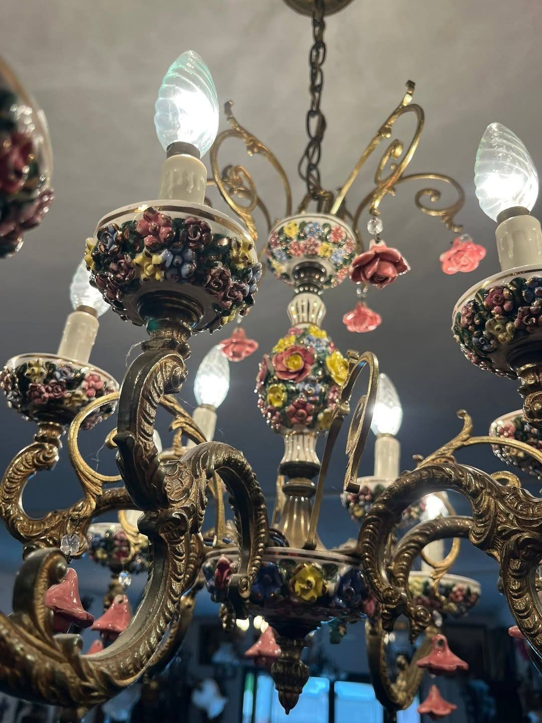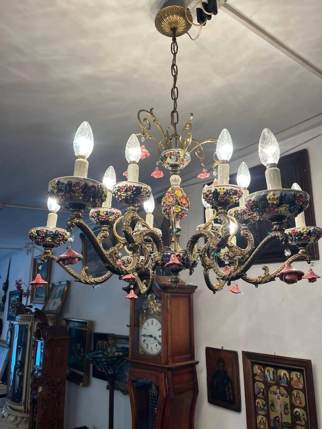 Dispune de 12brațe bogat ornamentate, fiecare cu soclu în formă de floare, completat de abajururi ceramice pictate și mici pendule florale din porțelan.