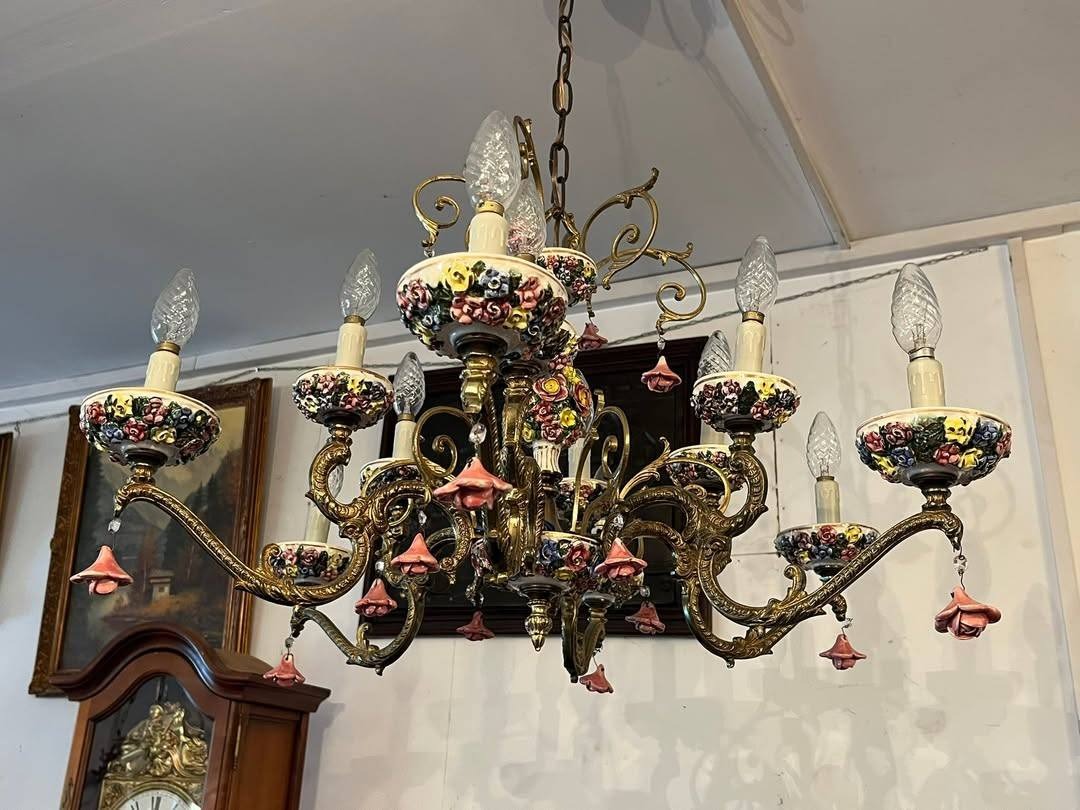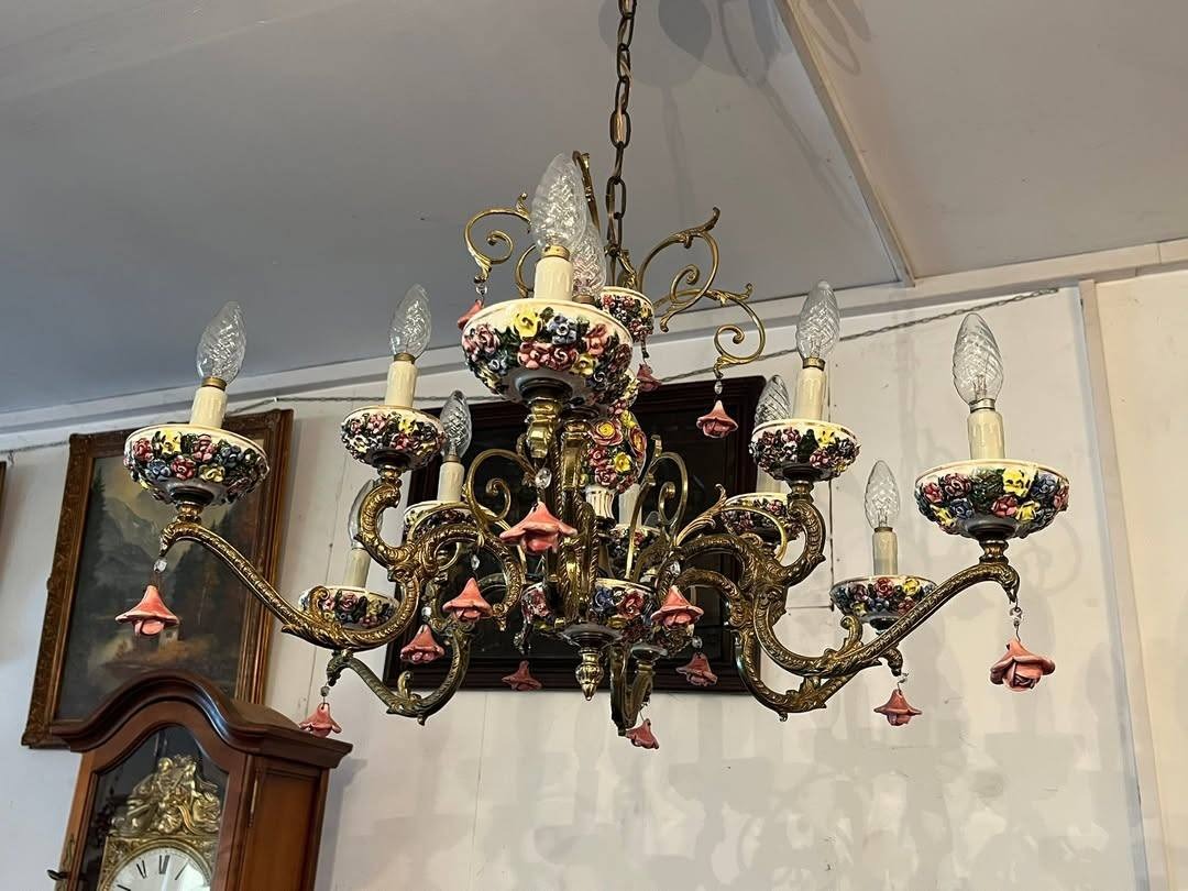 Candelabru vintage din bronz și porțelan, model floral – 12 brațe