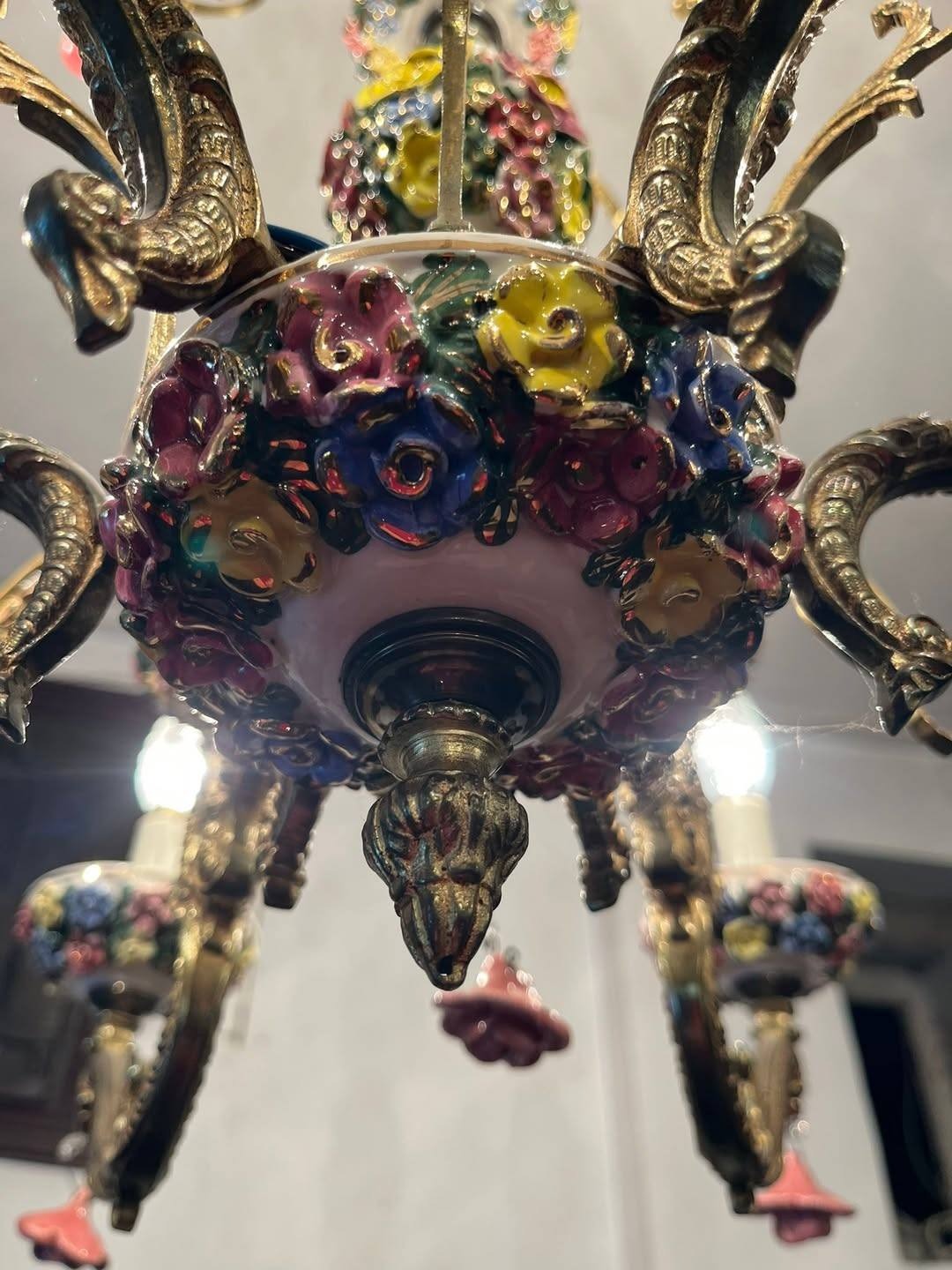 Candelabrul este realizat din bronz masiv cu elemente din porțelan decorat manual, în nuanțe vii de roz, galben, albastru și verde, reprezentând buchete de flori.