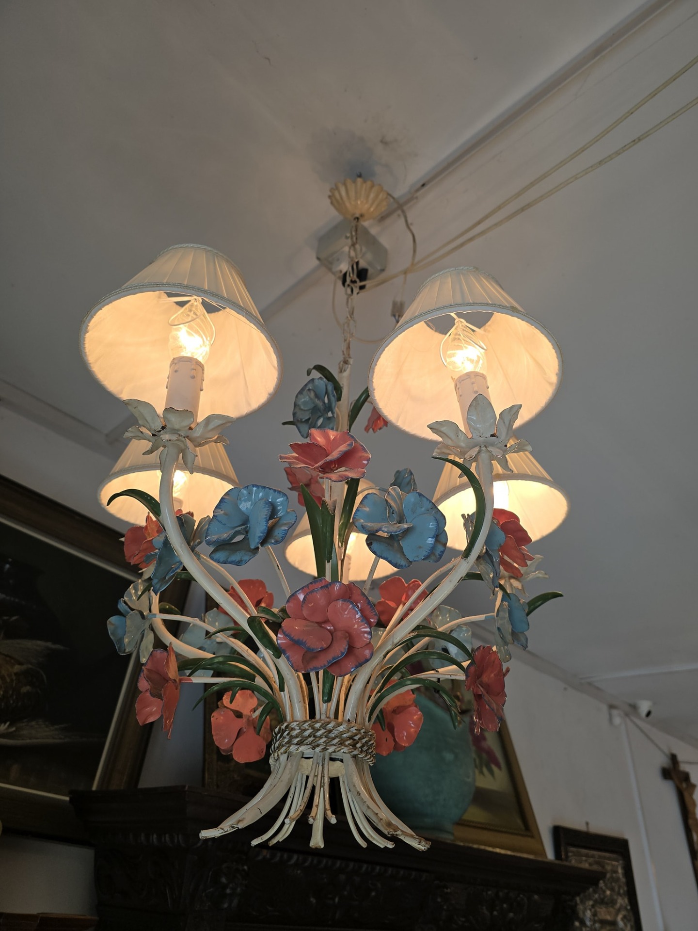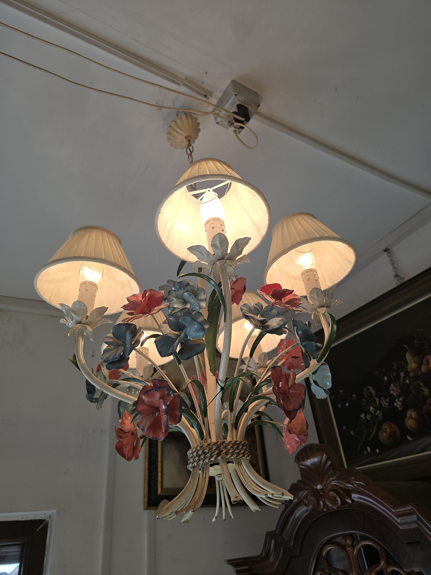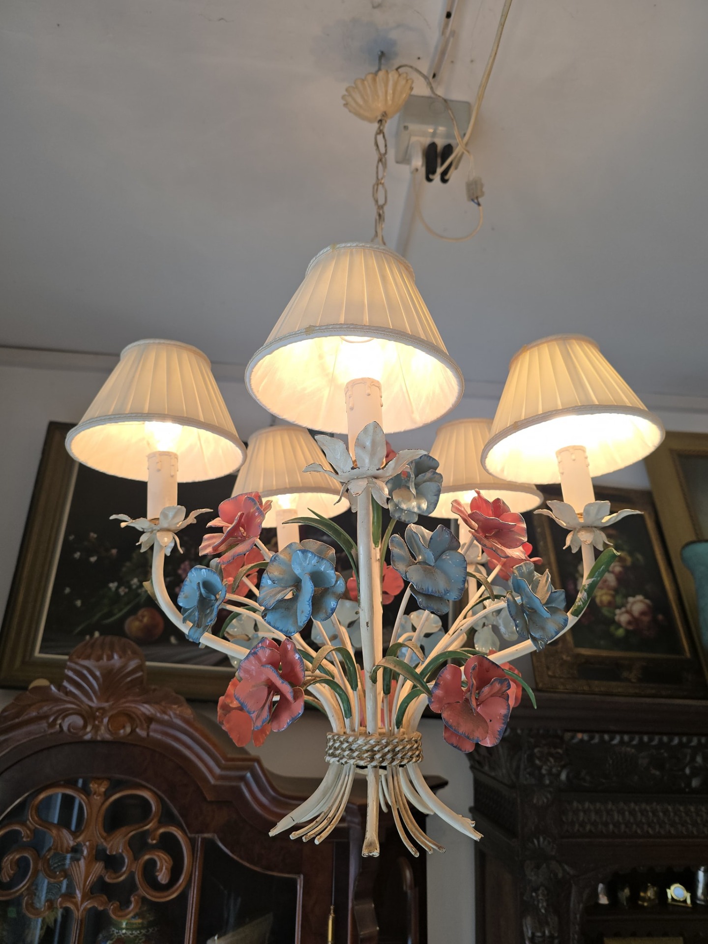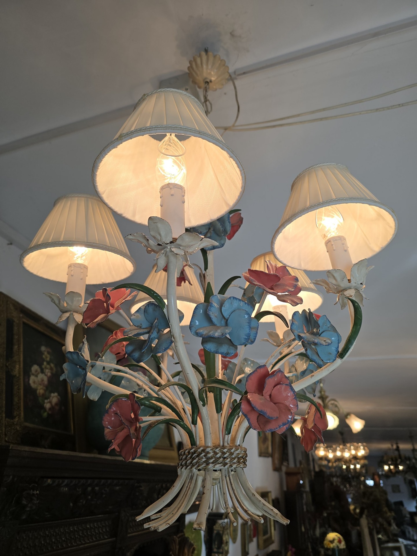Candelabru vintage din metal,in forma de cosulet de flori cu abajururi din material textil ce se așează pe cele 5 becuri tip lumânare cu fasung mic.