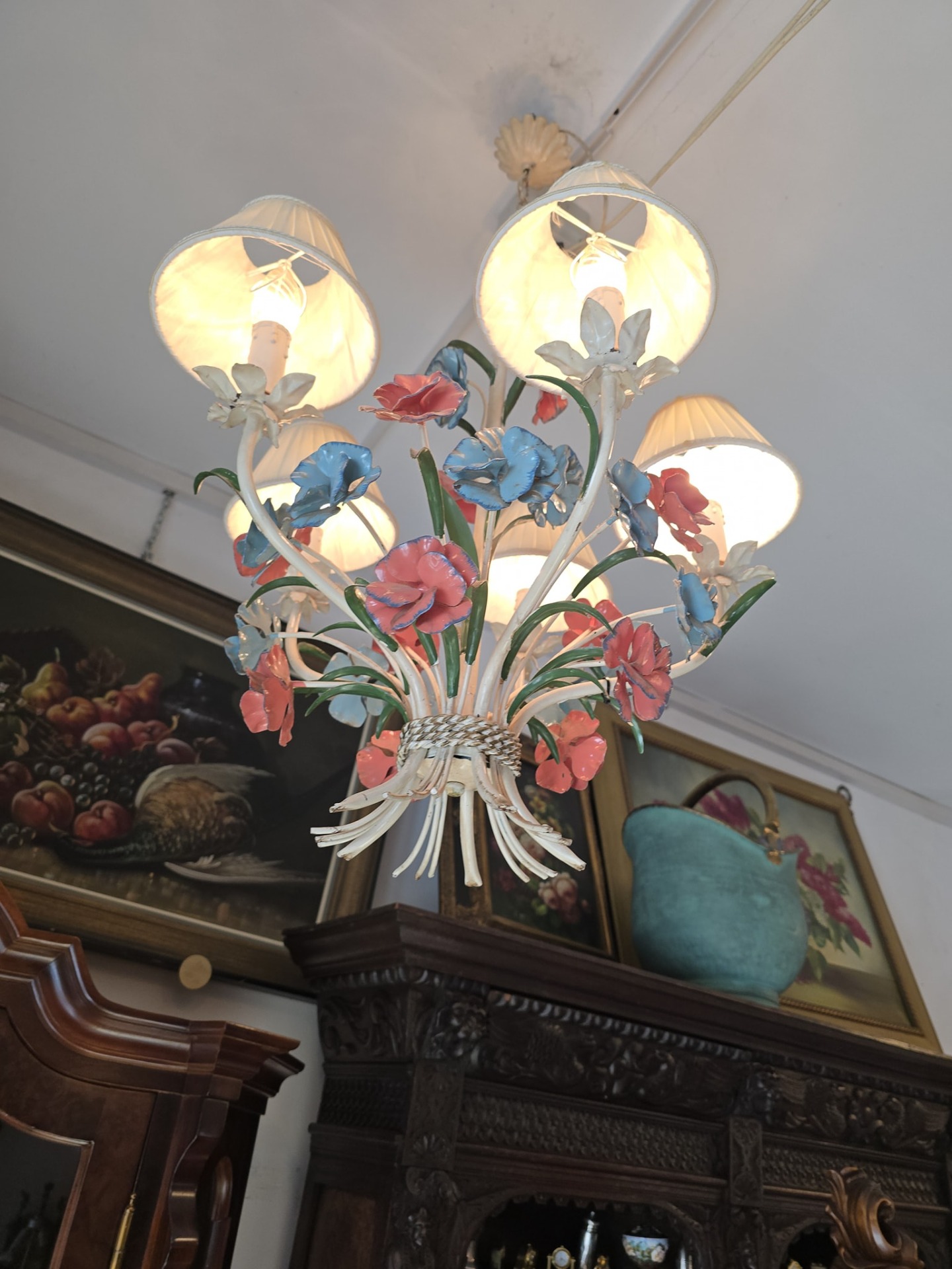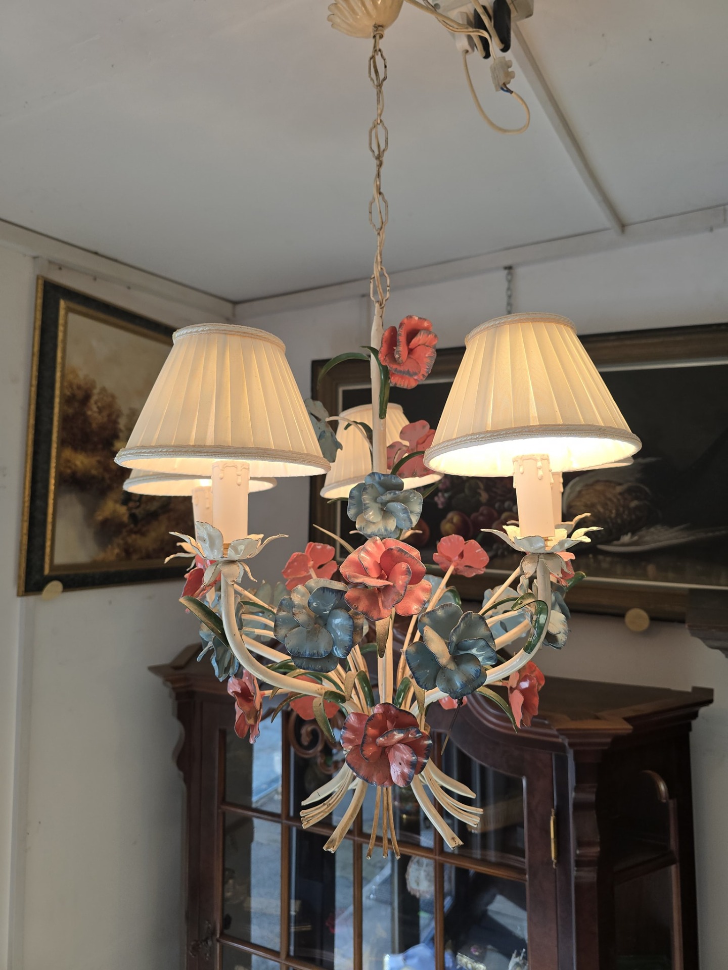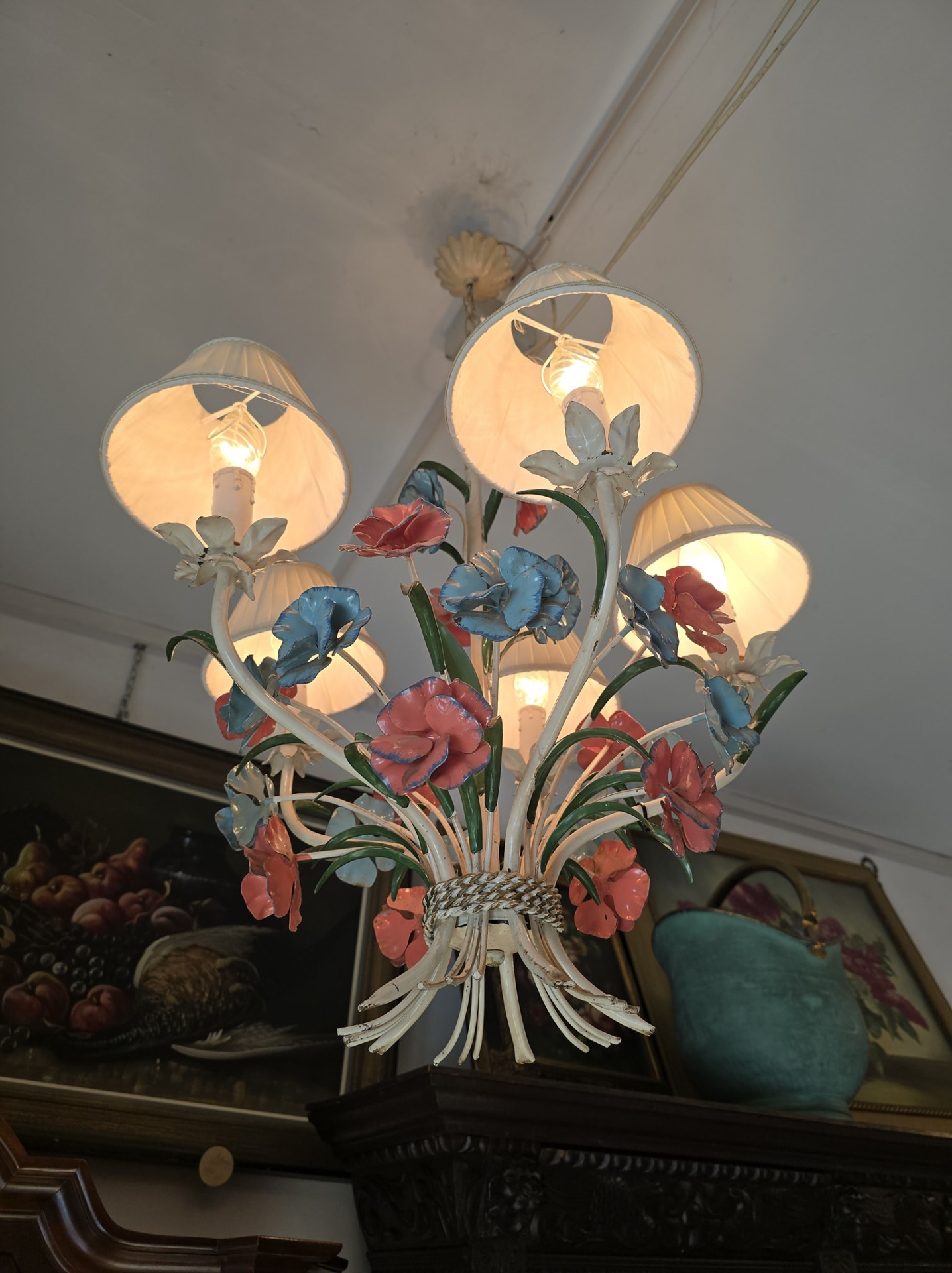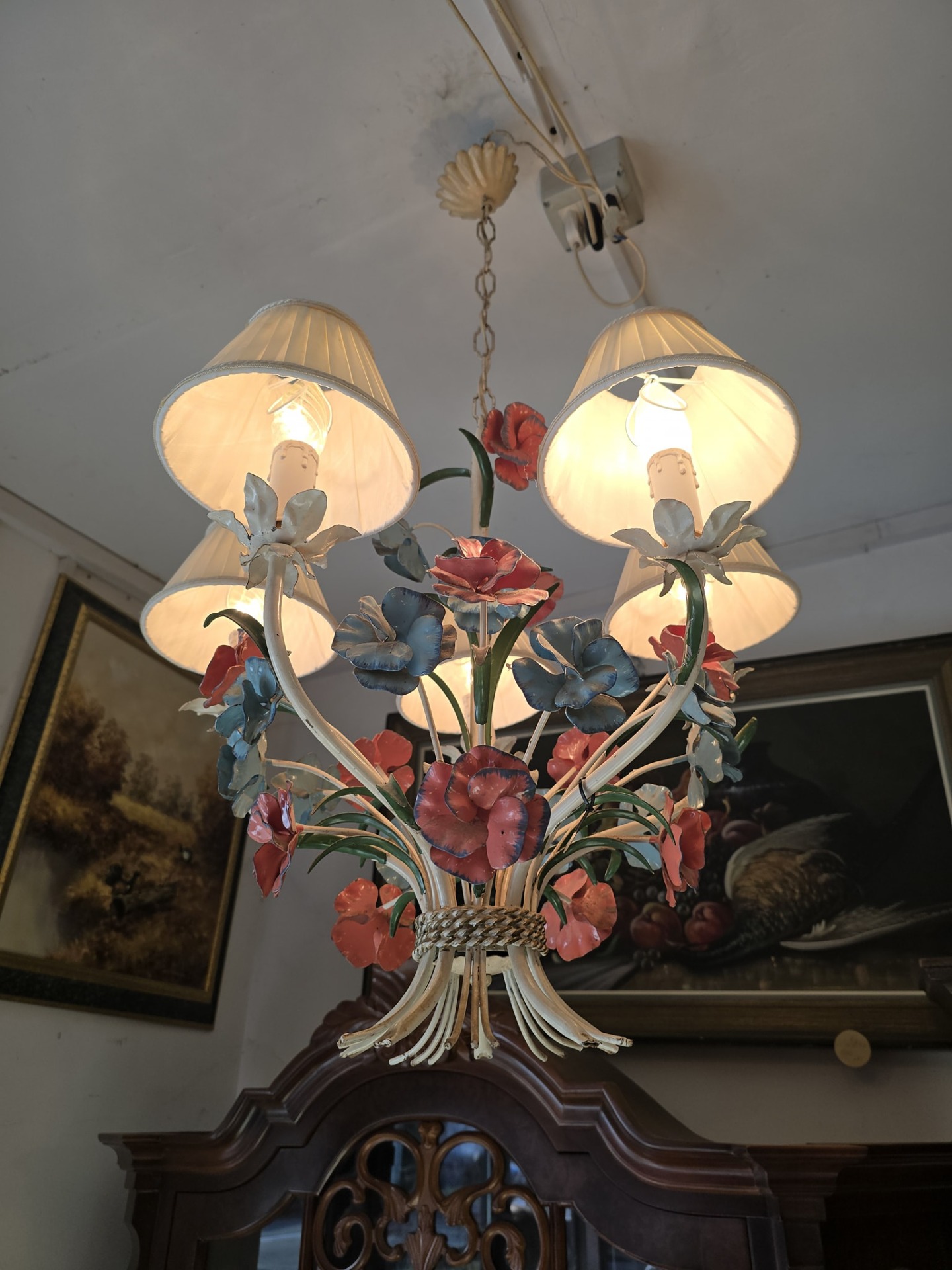 Candelabru vintage din metal,in forma de cosulet de flori cu abajururi din material textil ce se așează pe cele 5 becuri tip lumânare cu fasung mic.