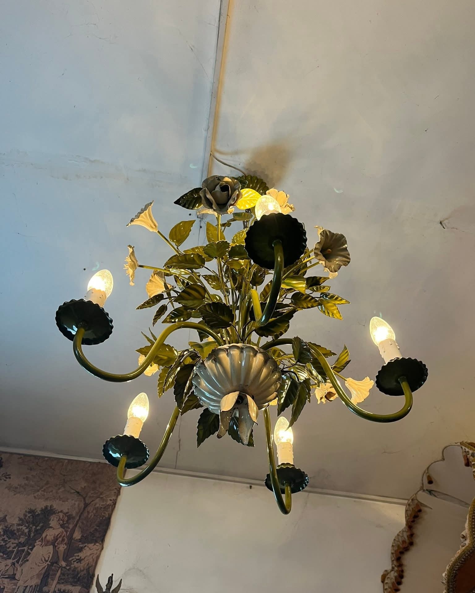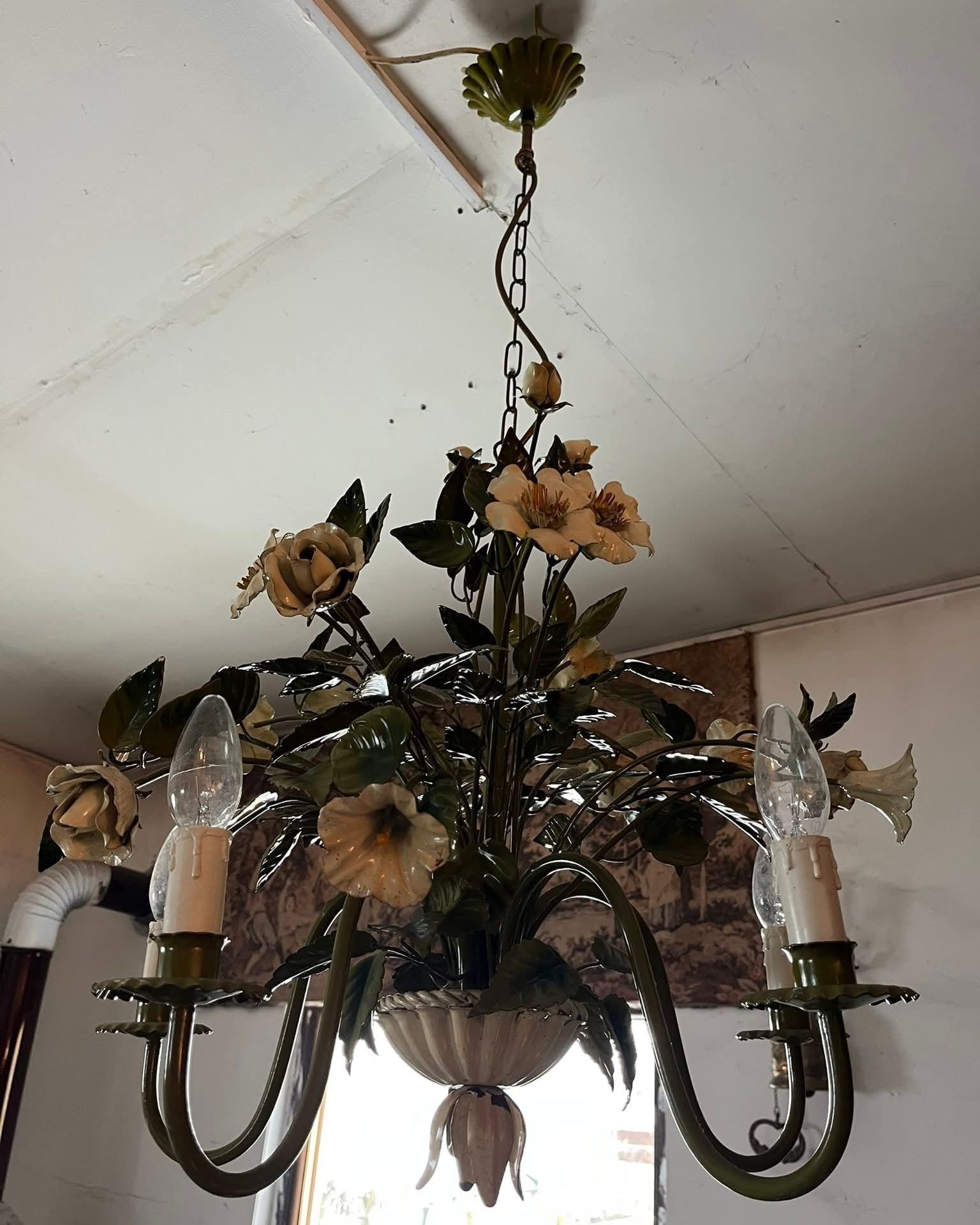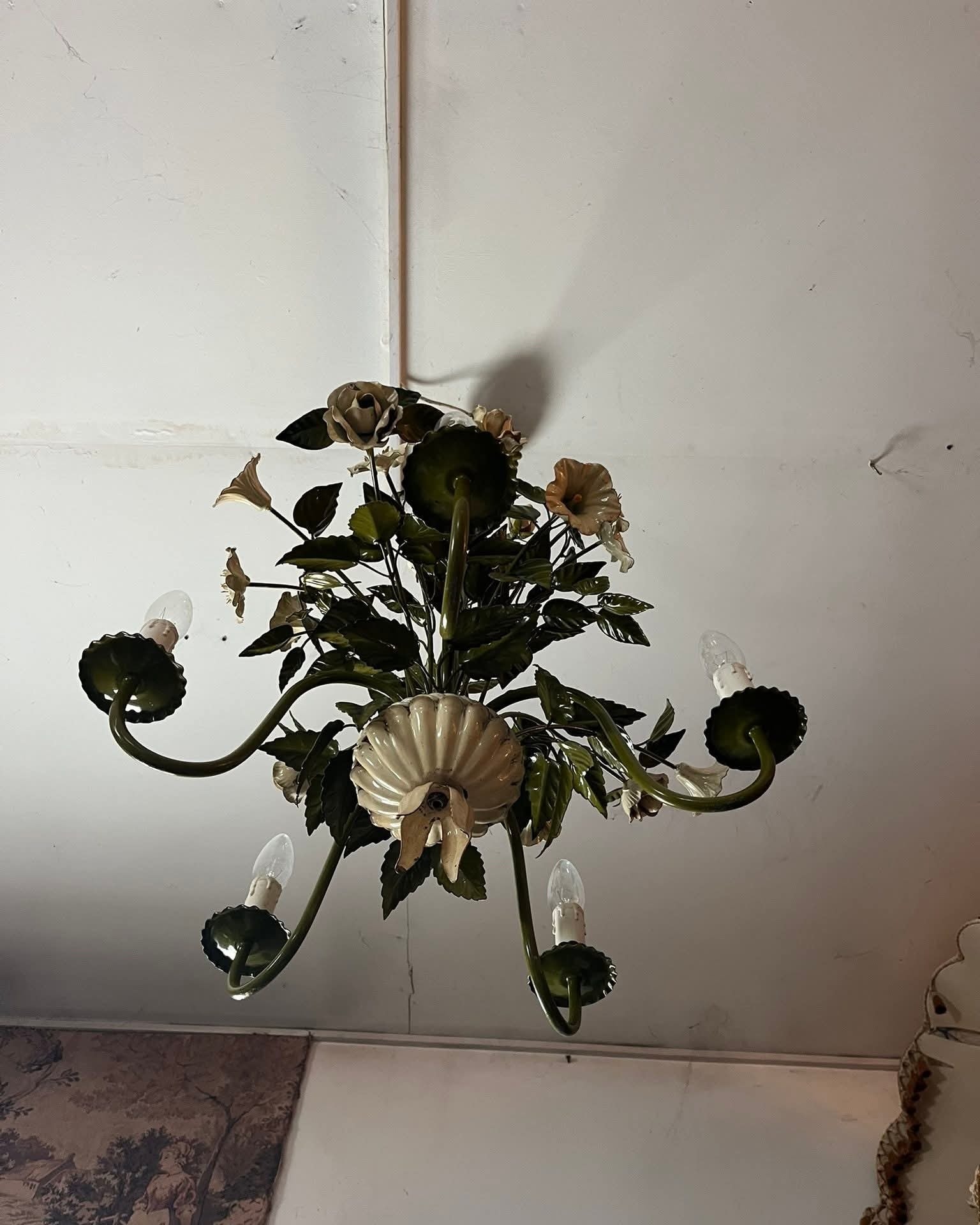 Candelabru vintage deosebit, realizat din metal, cu design floral bogat decorat cu flori și frunze stilizate, finisaj în nuanțe de verde și crem. Piesă spectaculoasă, cu aspect romantic, inspirat de stilul clasic / shabby chic / provensal.