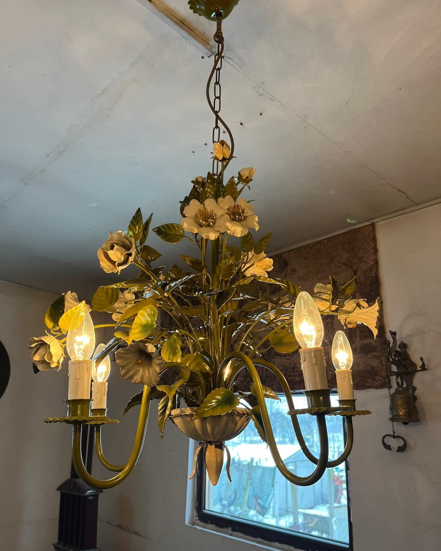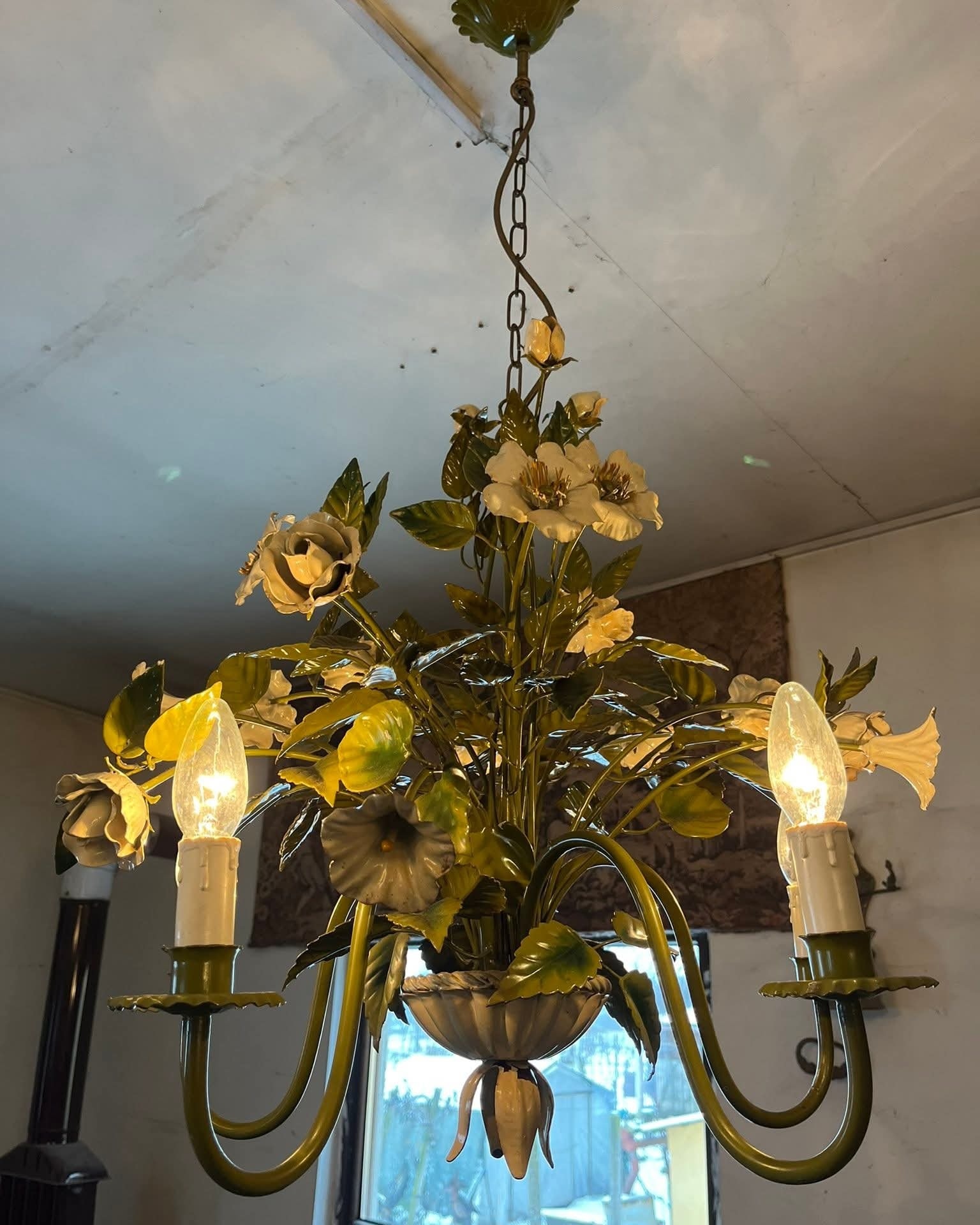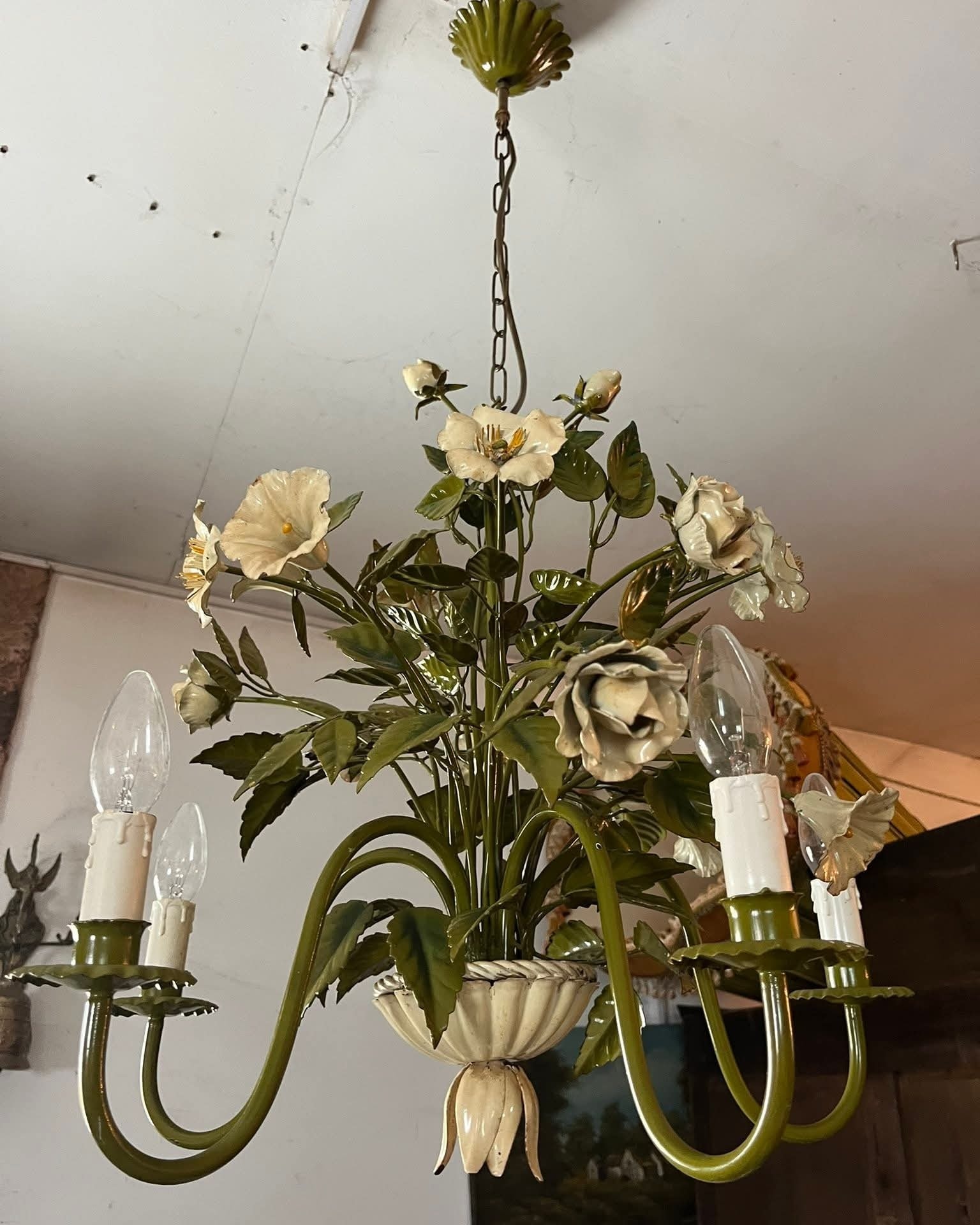 Candelabru vintage deosebit, realizat din metal, cu design floral bogat decorat cu flori și frunze stilizate, finisaj în nuanțe de verde și crem. Piesă spectaculoasă, cu aspect romantic, inspirat de stilul clasic / shabby chic / provensal.