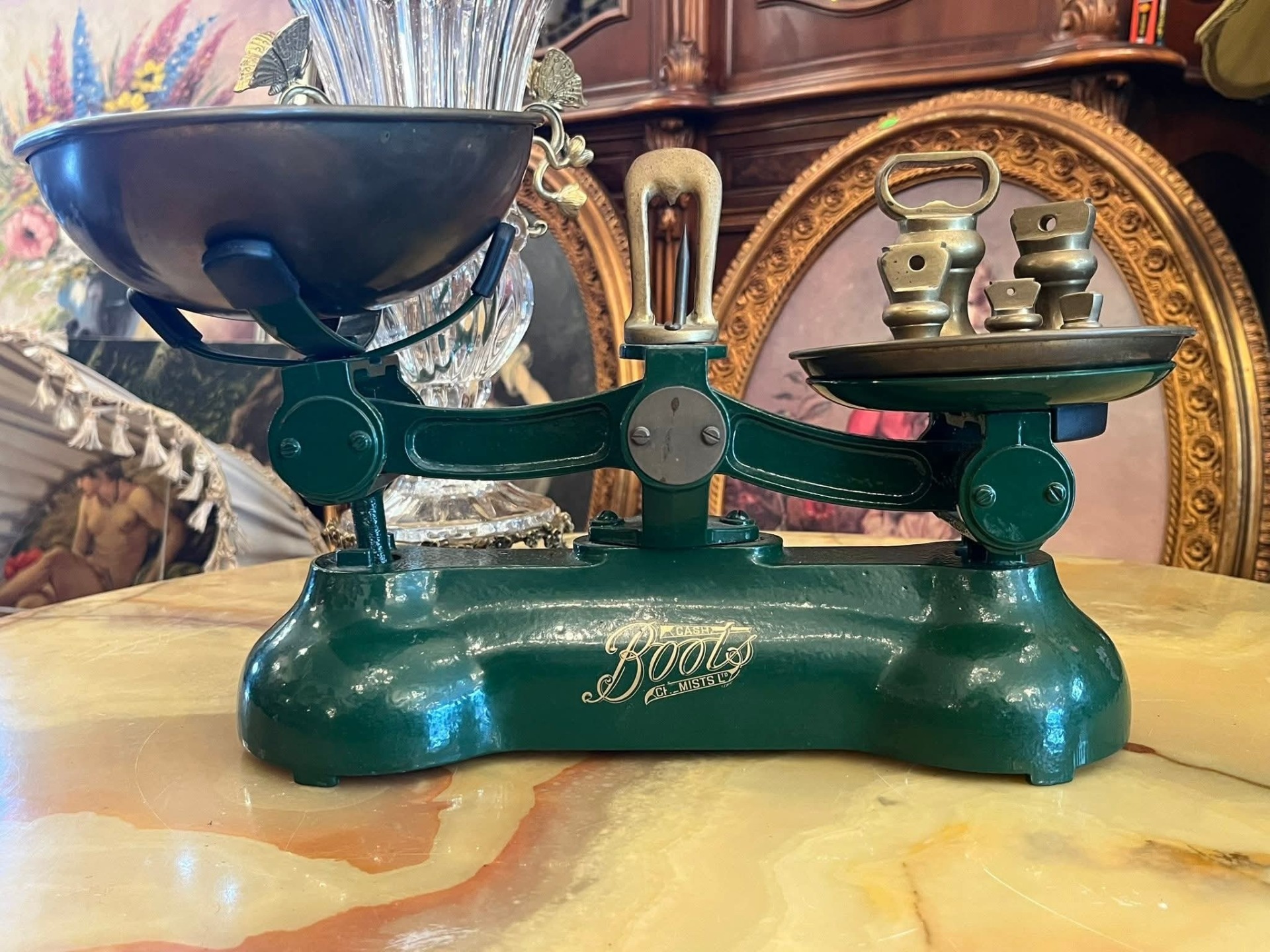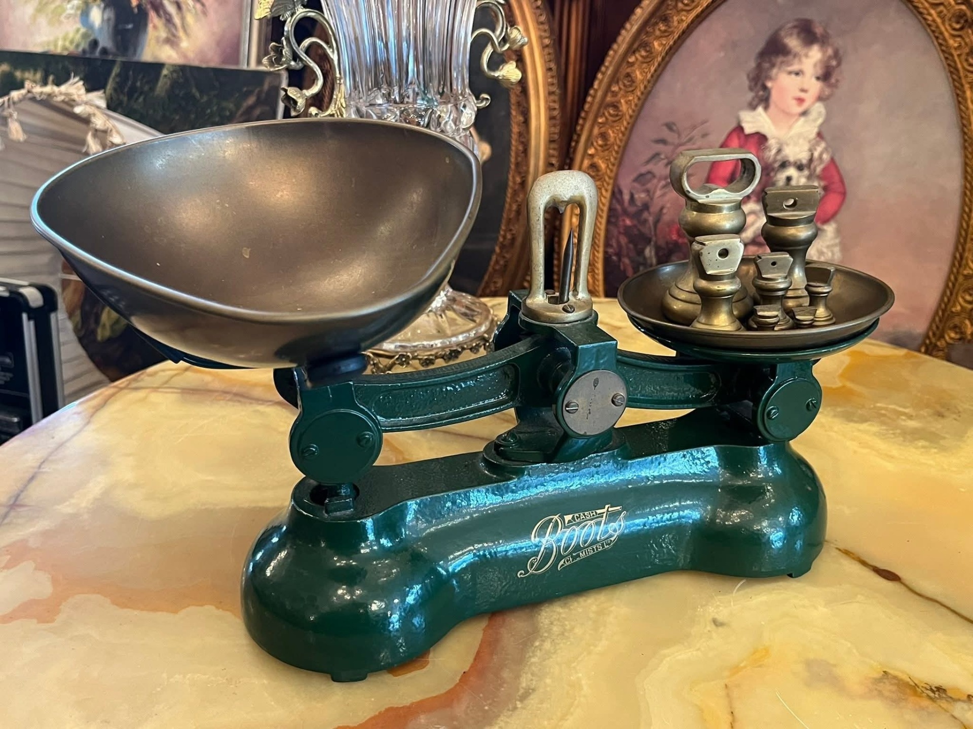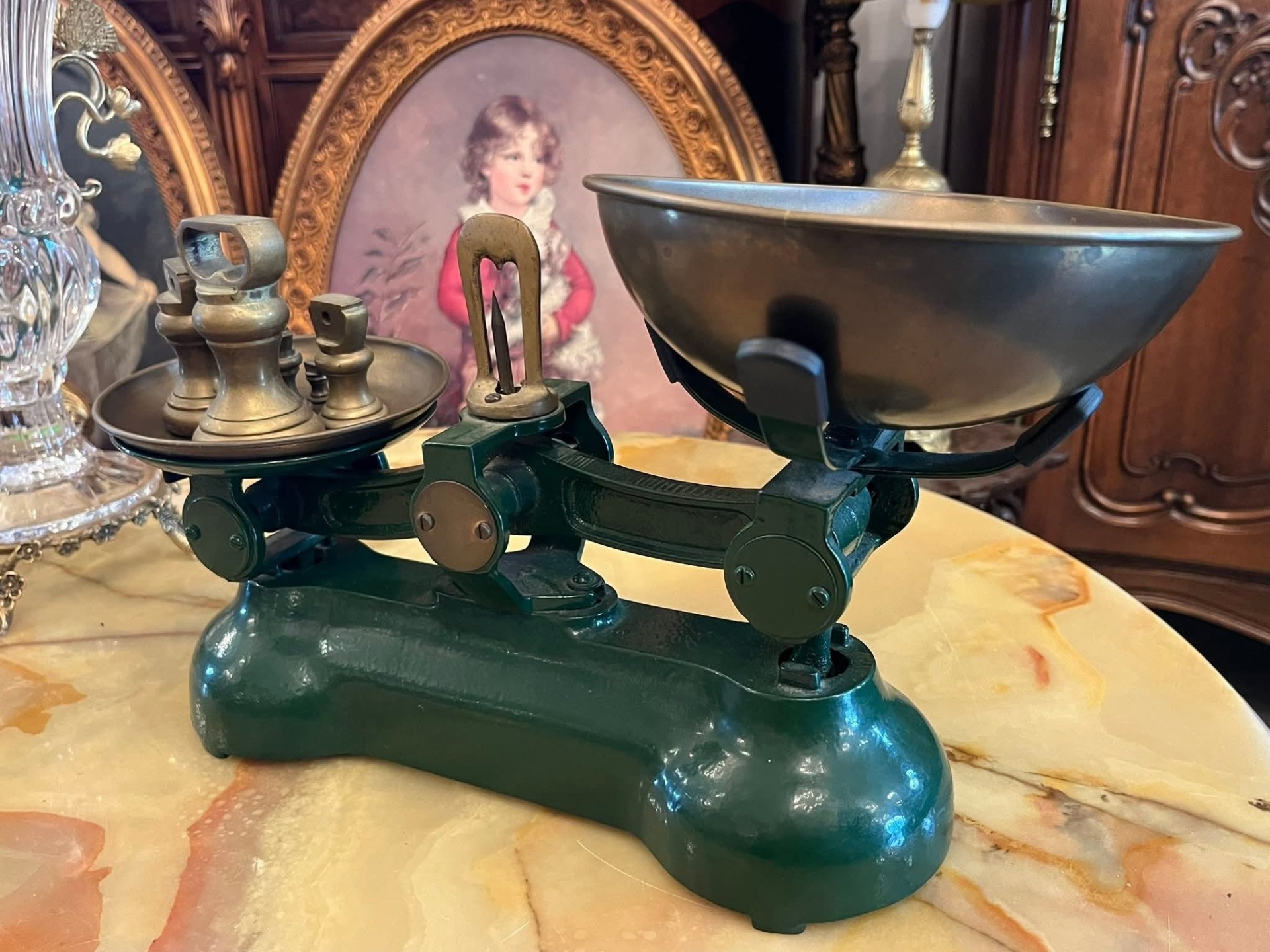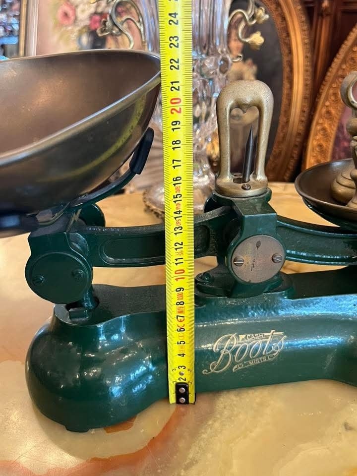 Cântar vechi tip balanță, cu două talere metalice și set complet de greutăți originale. Piesa are bază solidă din metal vopsit verde și inscripție decorativă pe partea frontală. Greutățile sunt din metal masiv, marcate în grame, și includ mai multe valori.