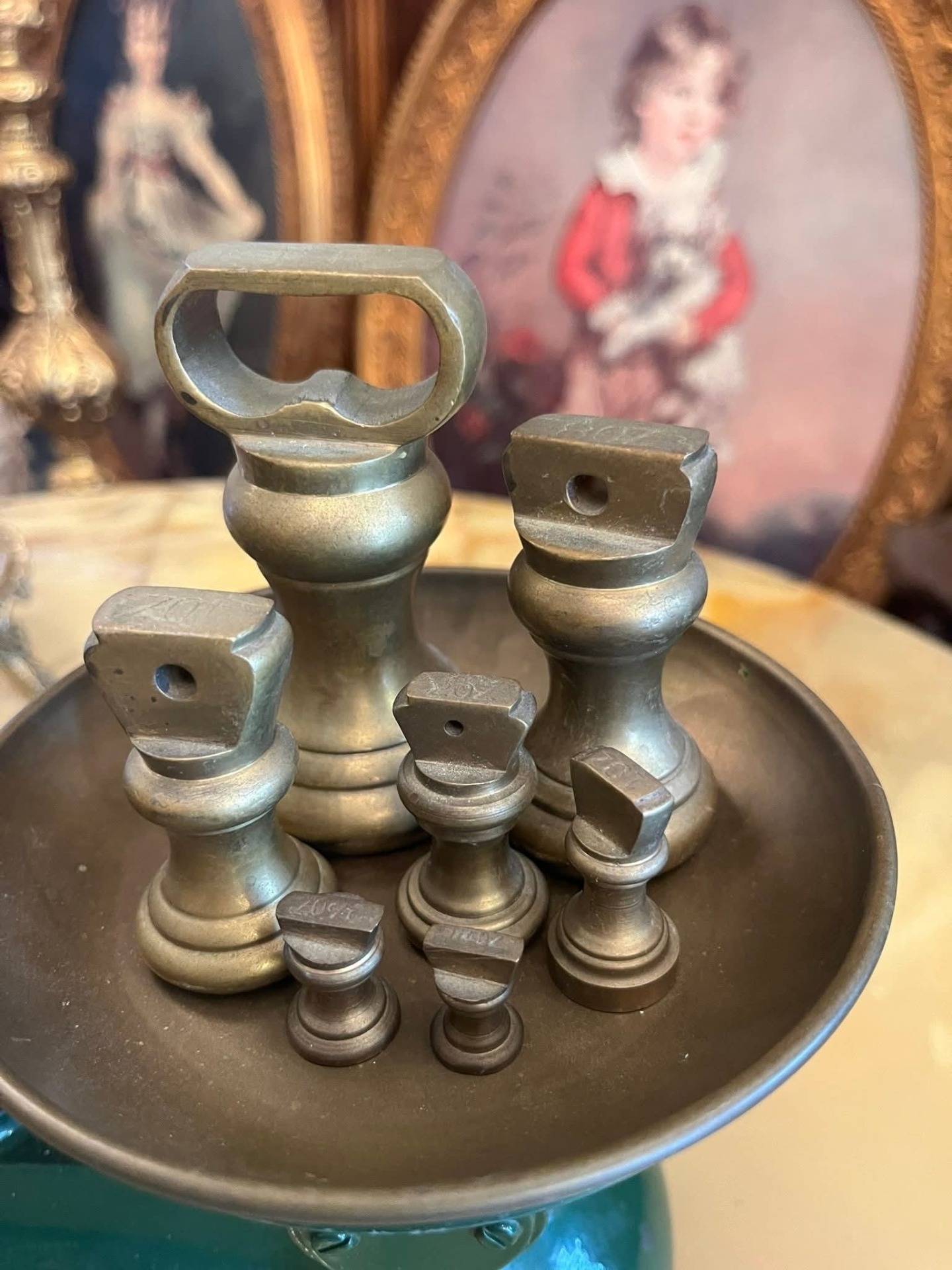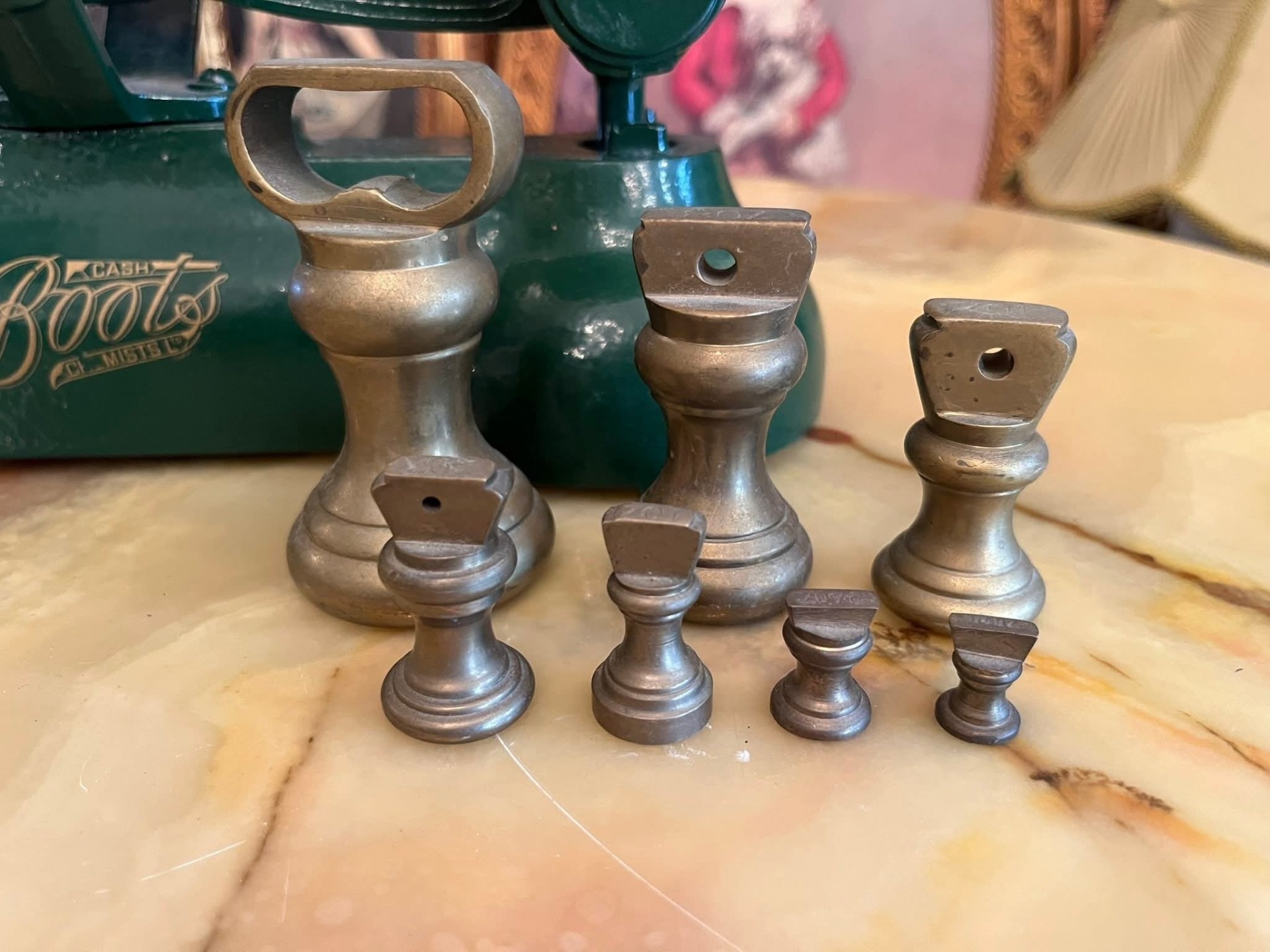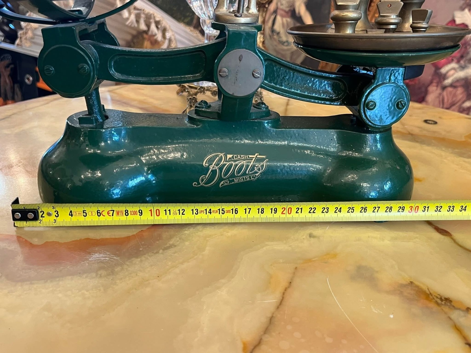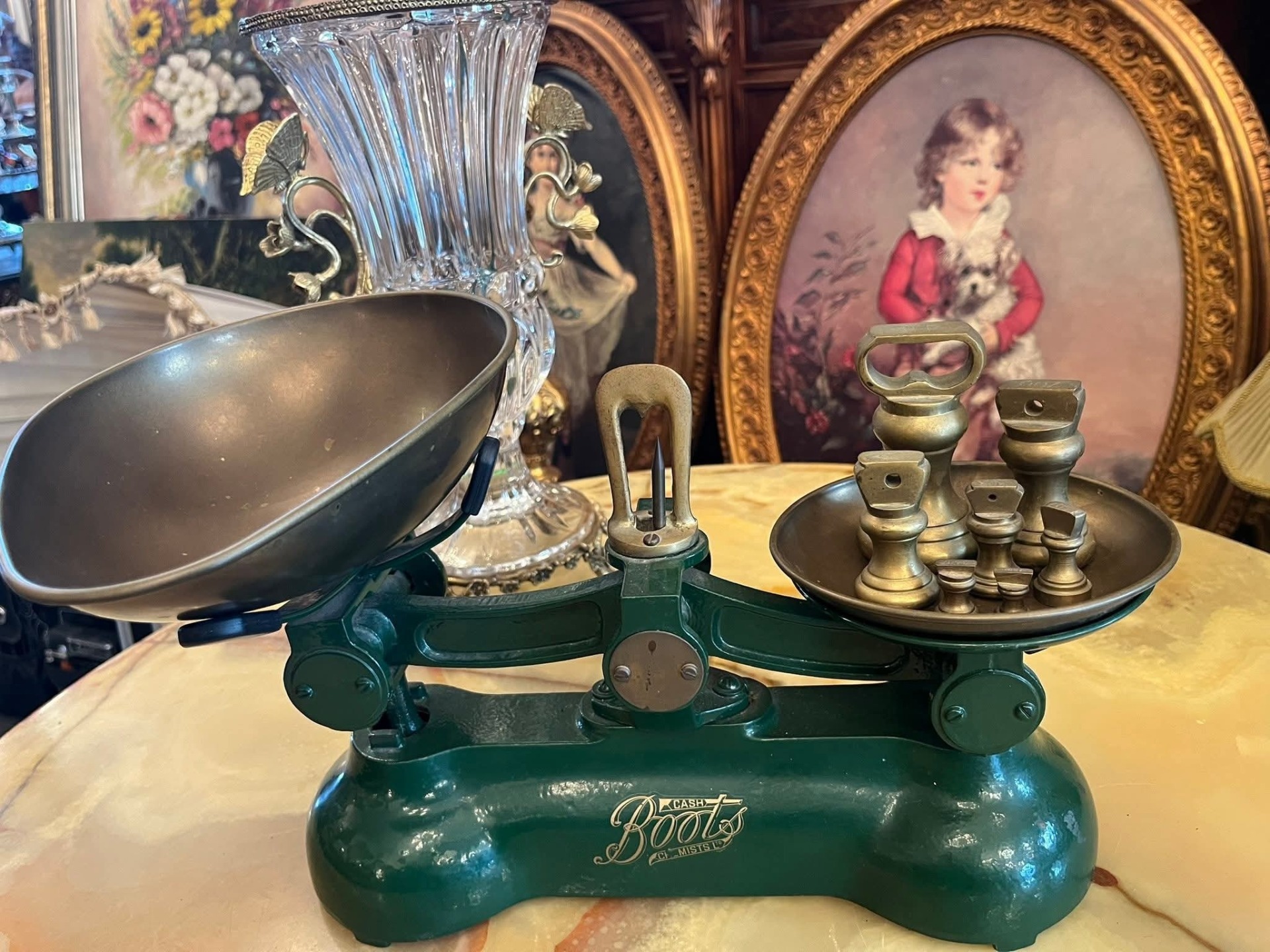 Cântar vechi tip balanță, cu două talere metalice și set complet de greutăți originale. Piesa are bază solidă din metal vopsit verde și inscripție decorativă pe partea frontală. Greutățile sunt din metal masiv, marcate în grame, și includ mai multe valori.