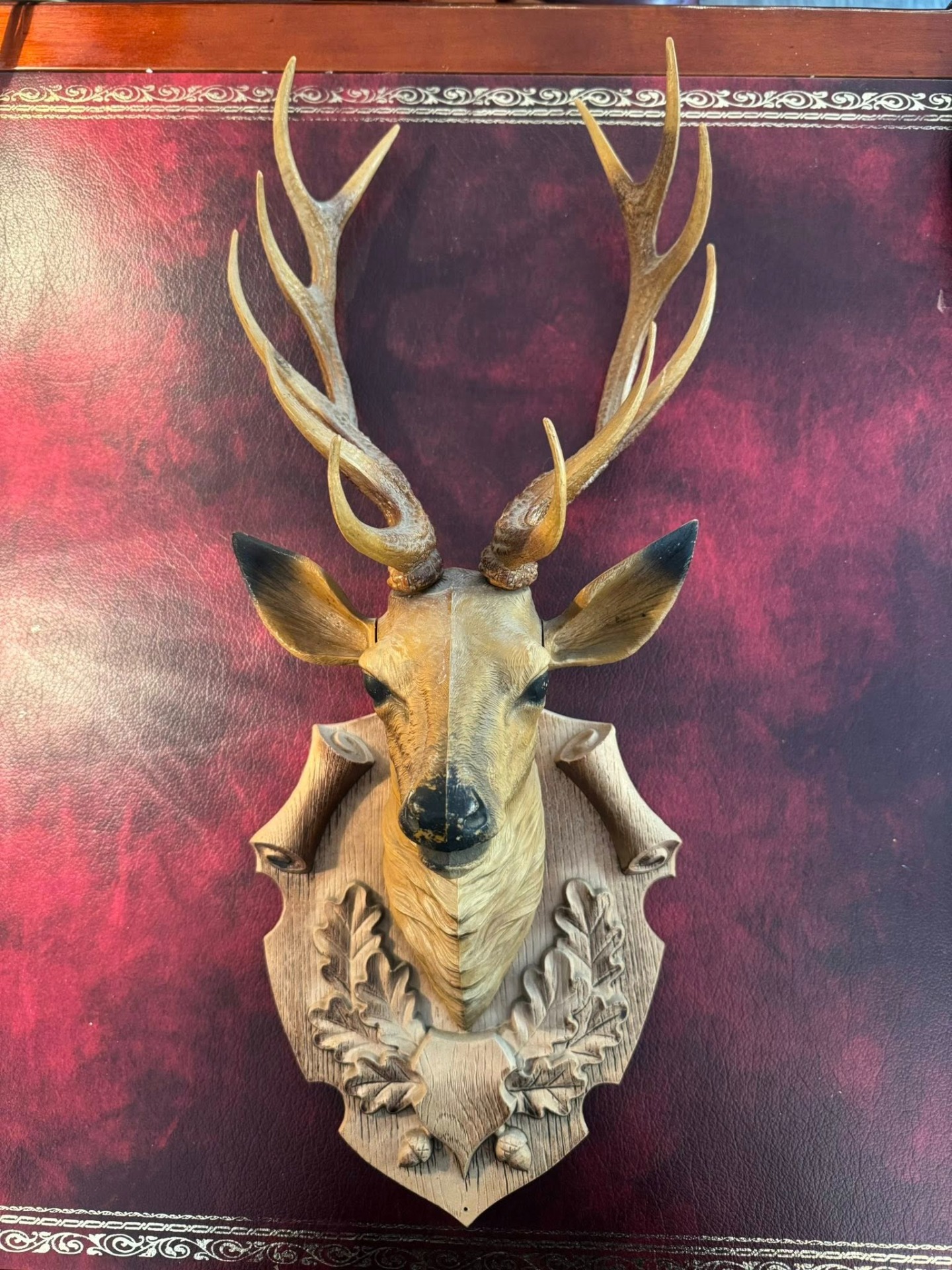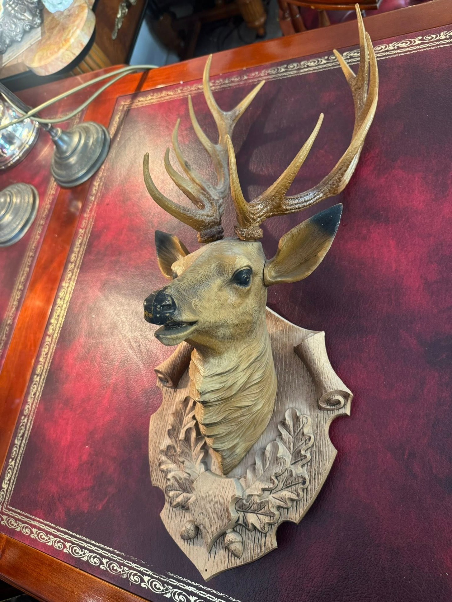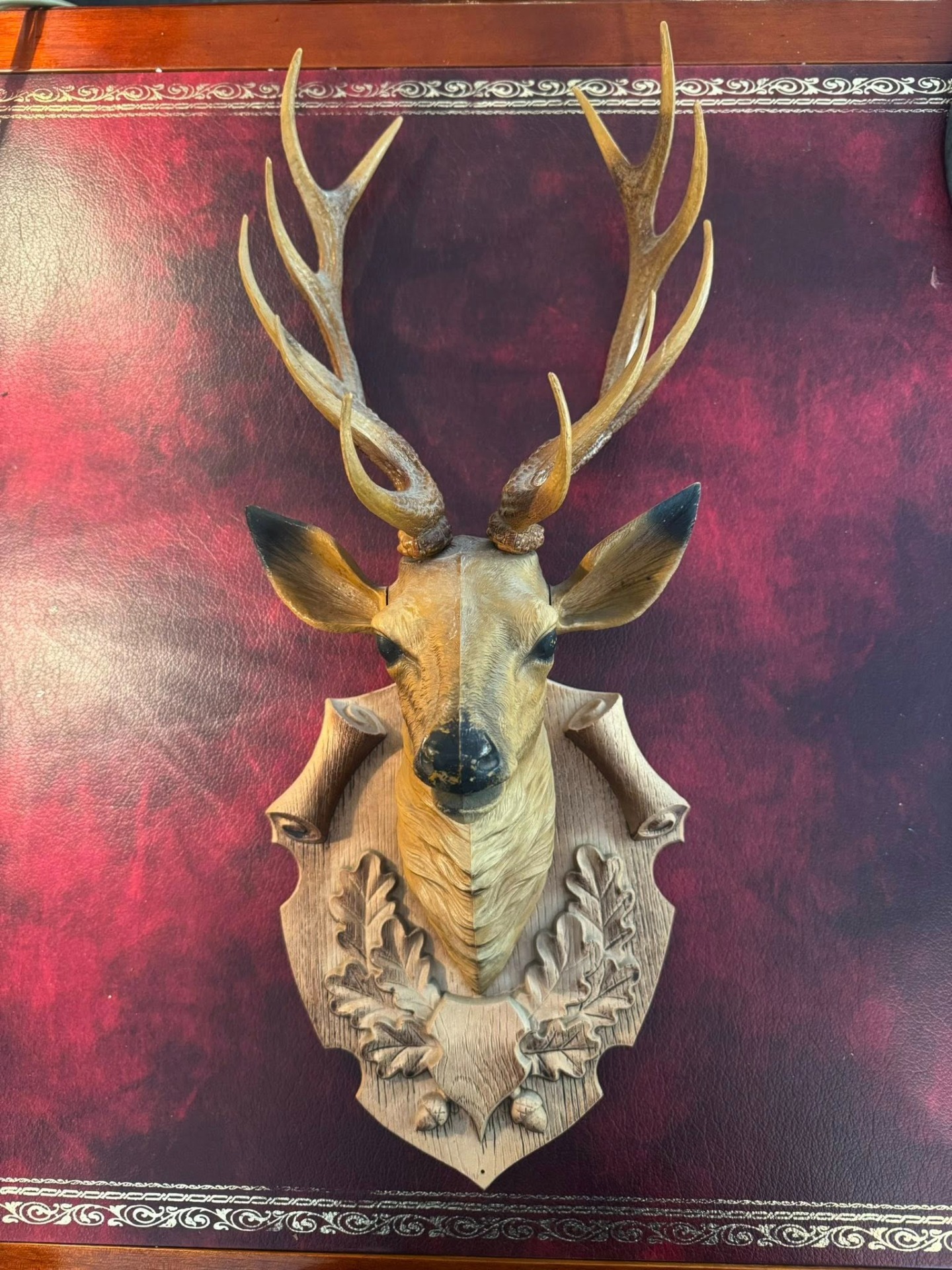 Cap de cerb lopătar sau carpatin montat pe un scut decorativ, realizat din plastic. (cca 1910)