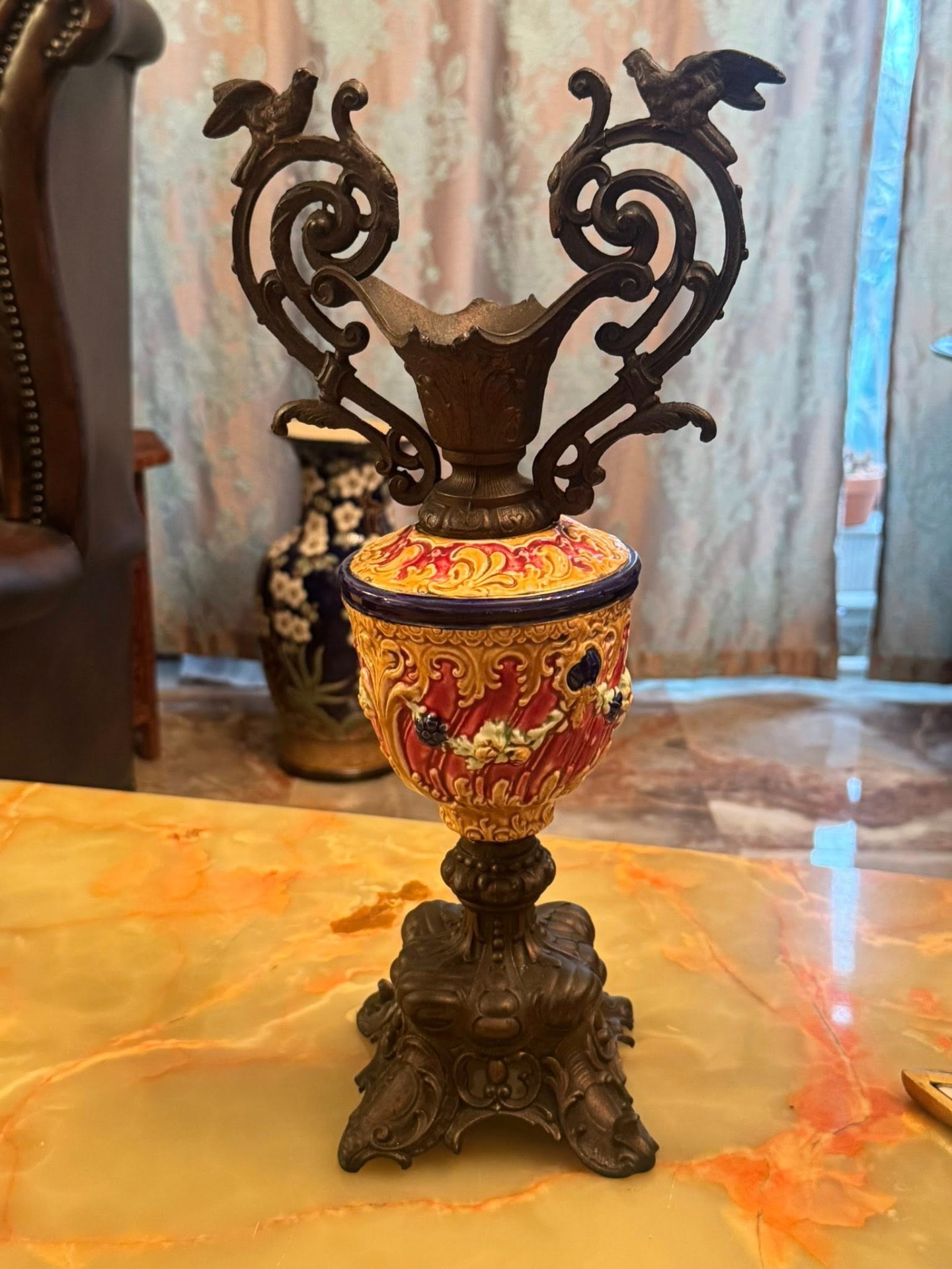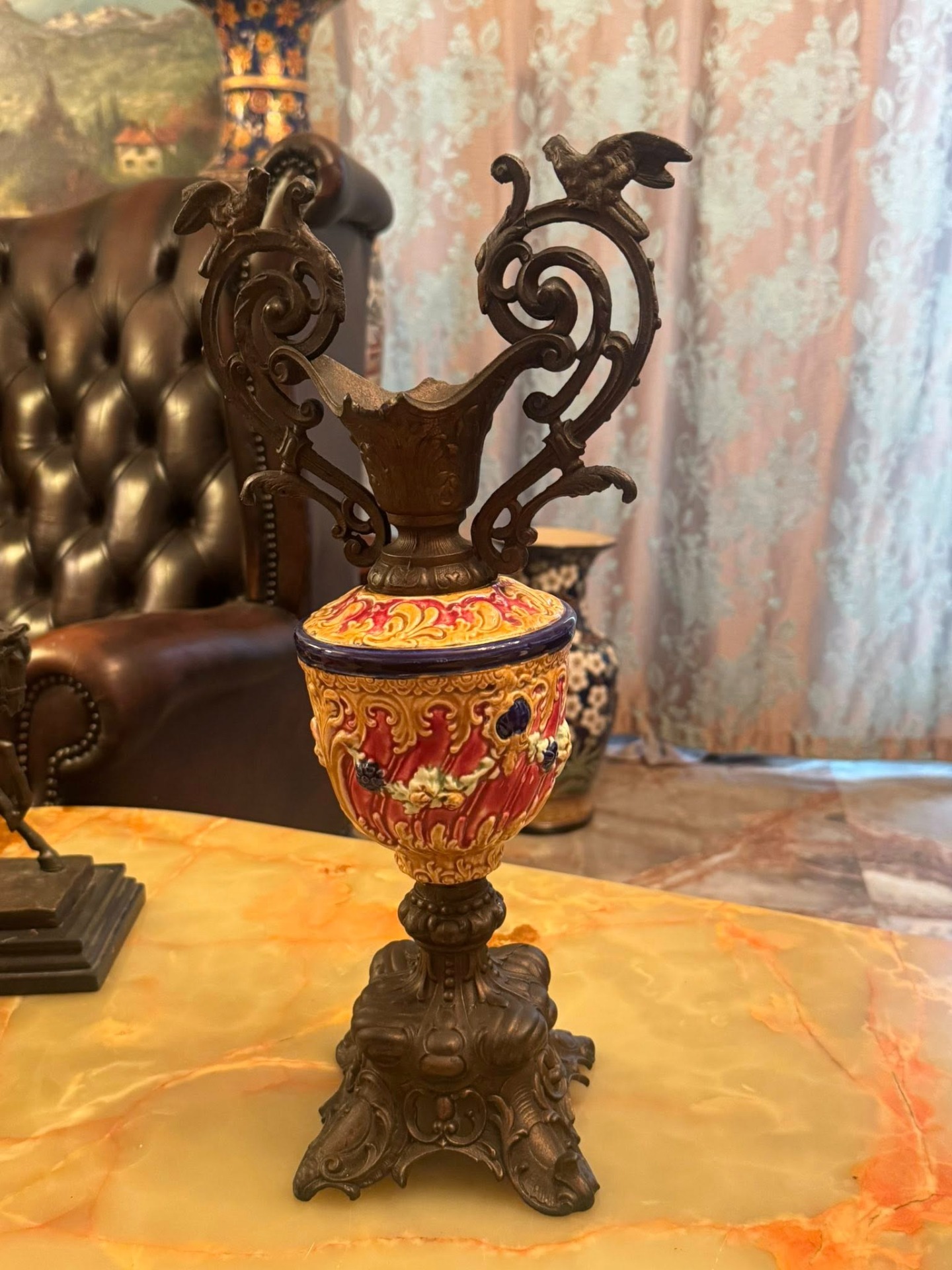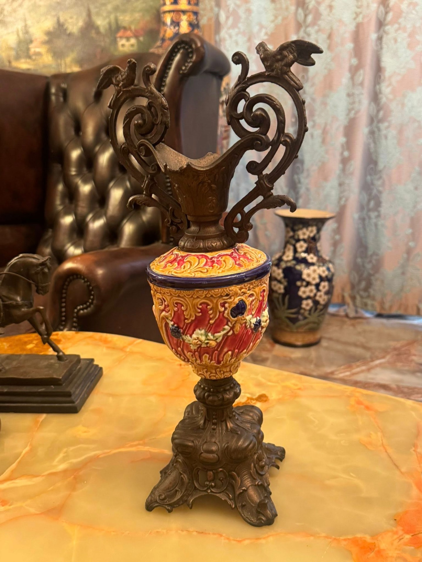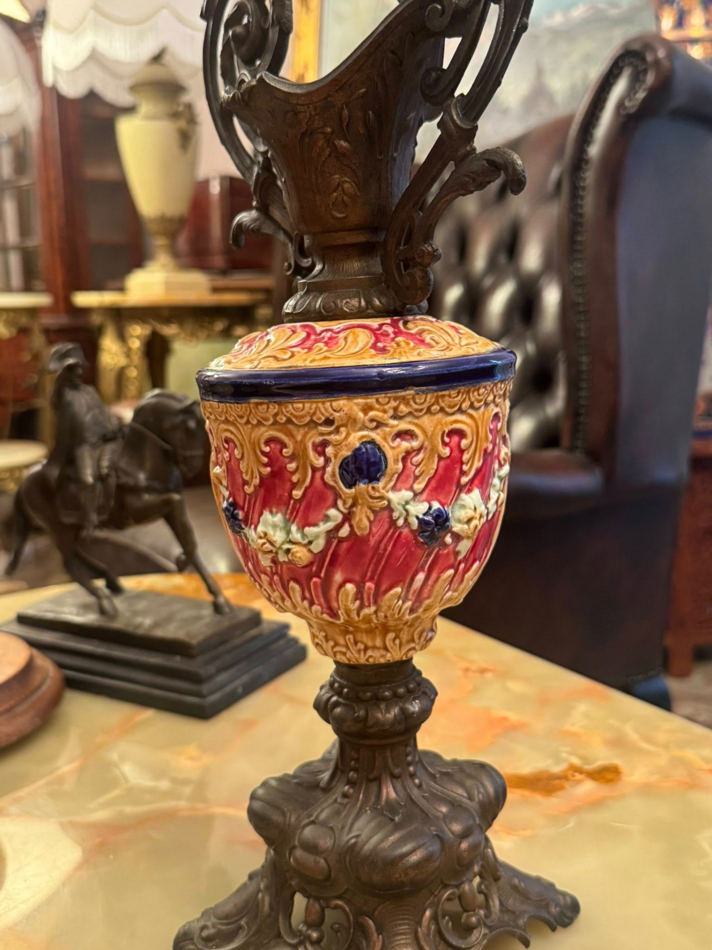 Carafă din bronz și majolica cu motiv floral,pictat în culori vii