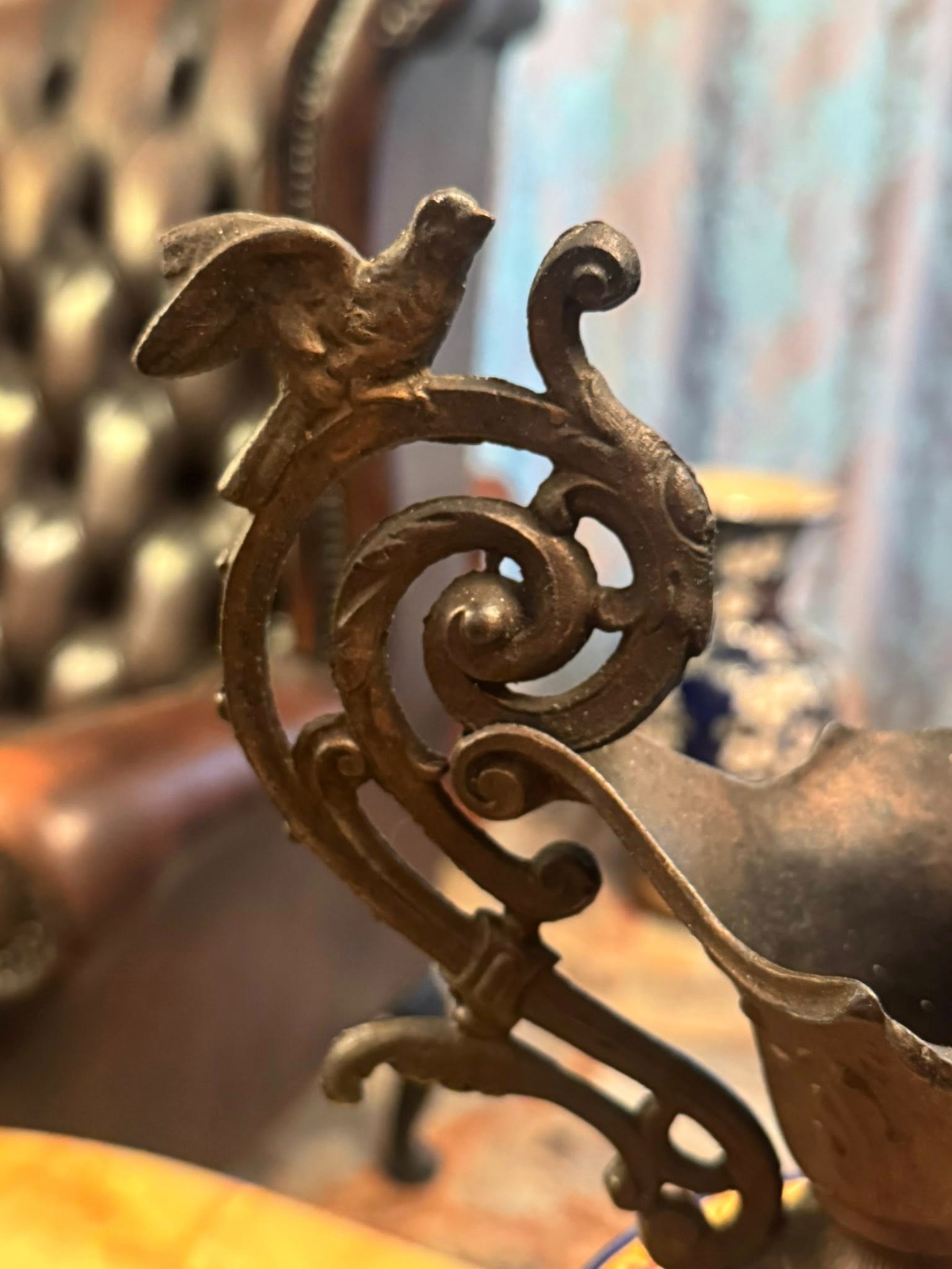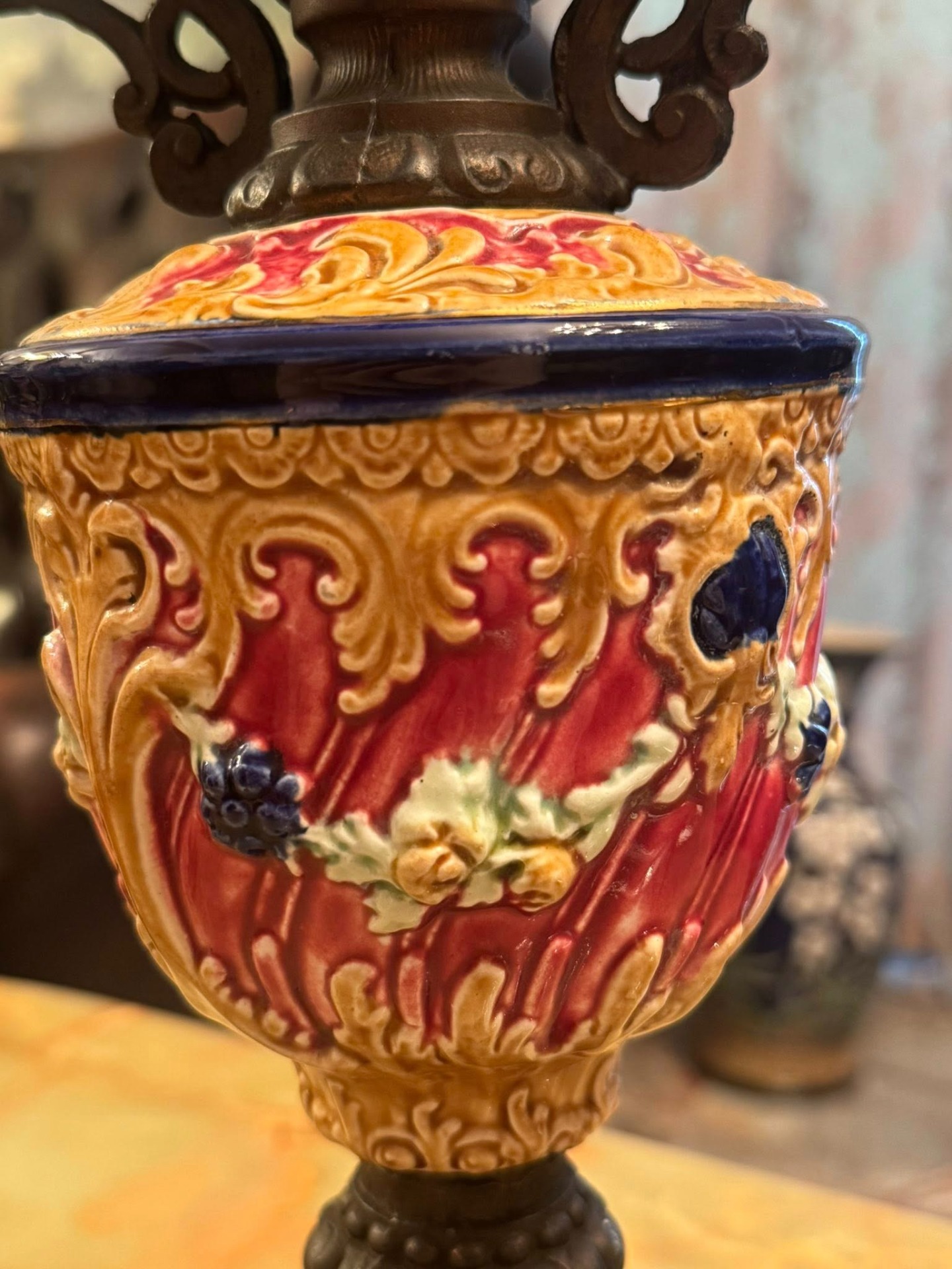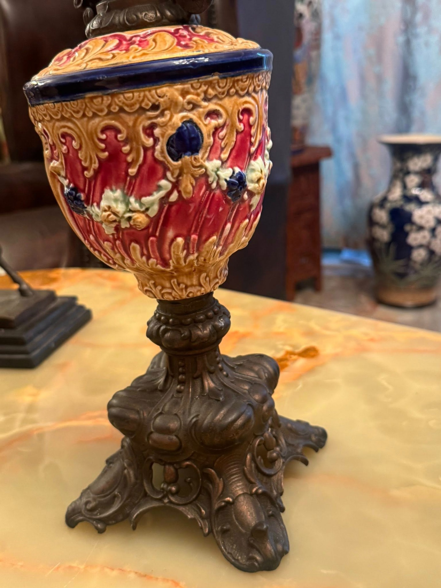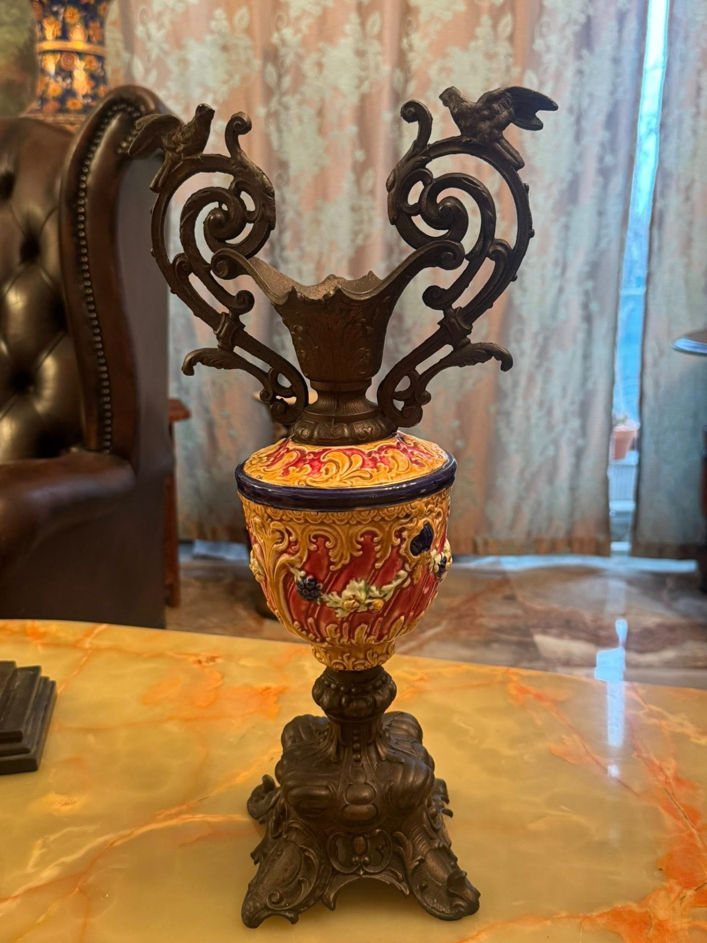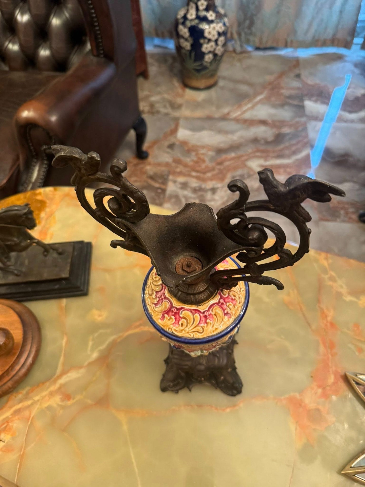 Carafă din bronz și majolica cu motiv floral,pictat în culori vii
