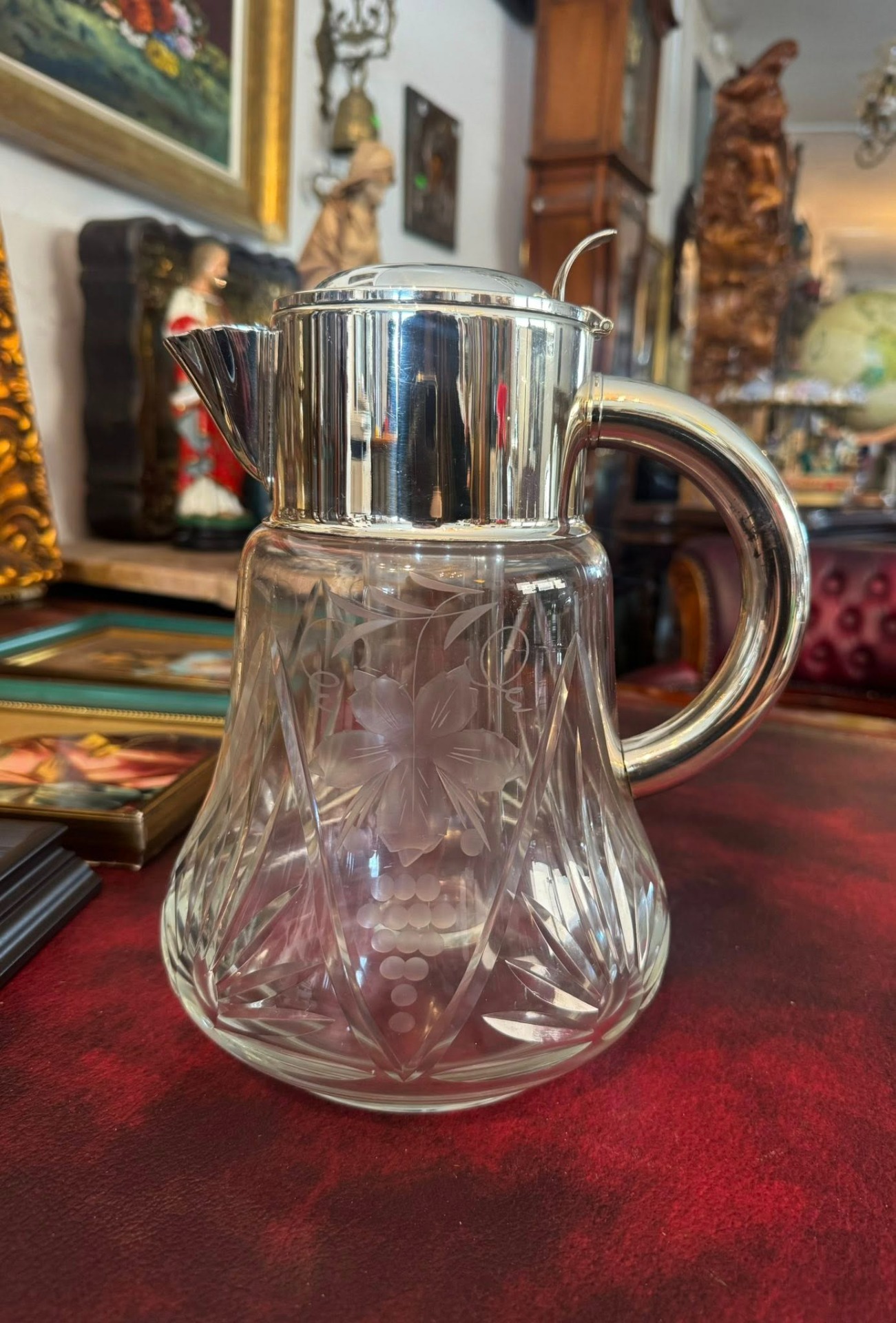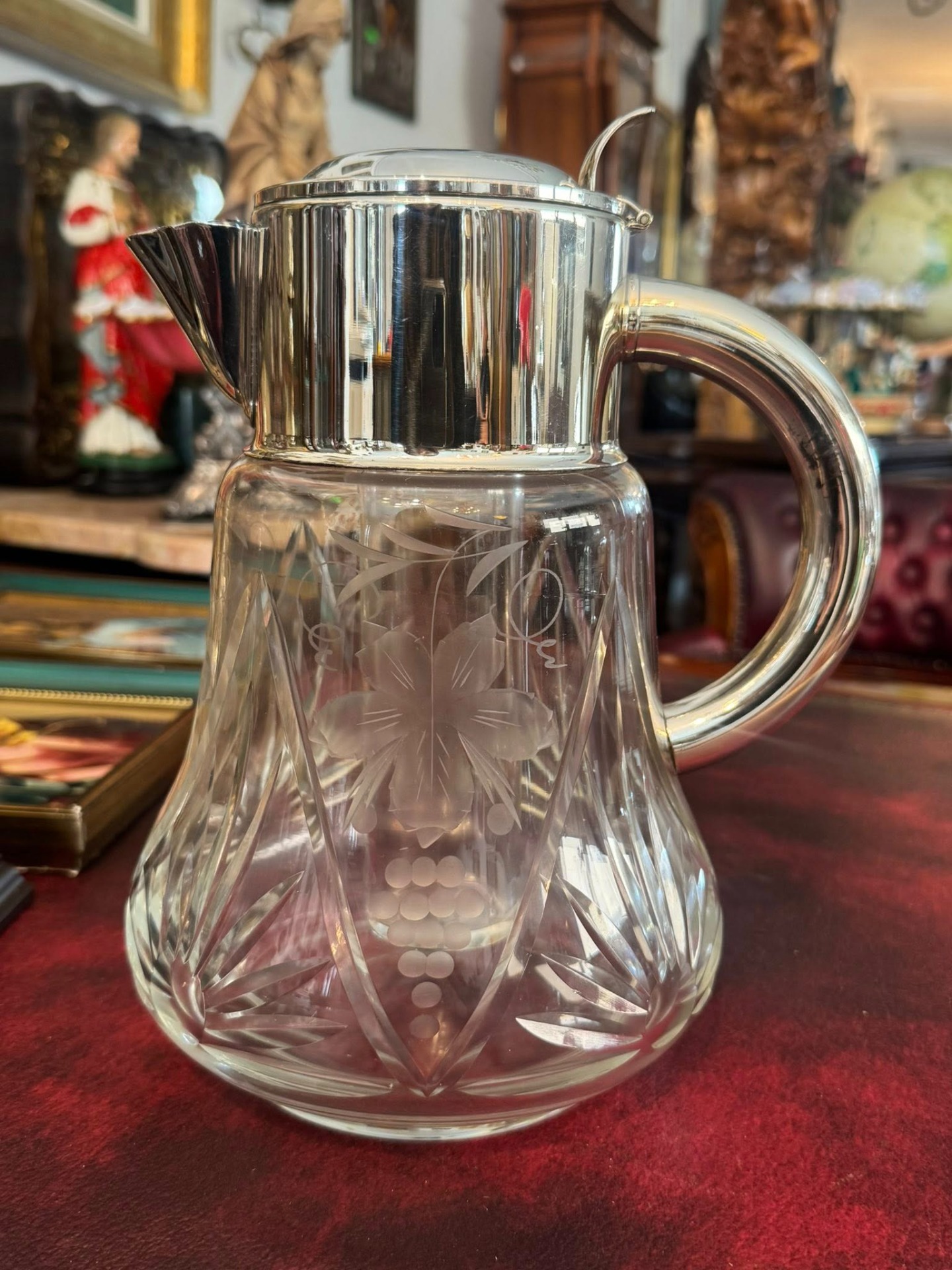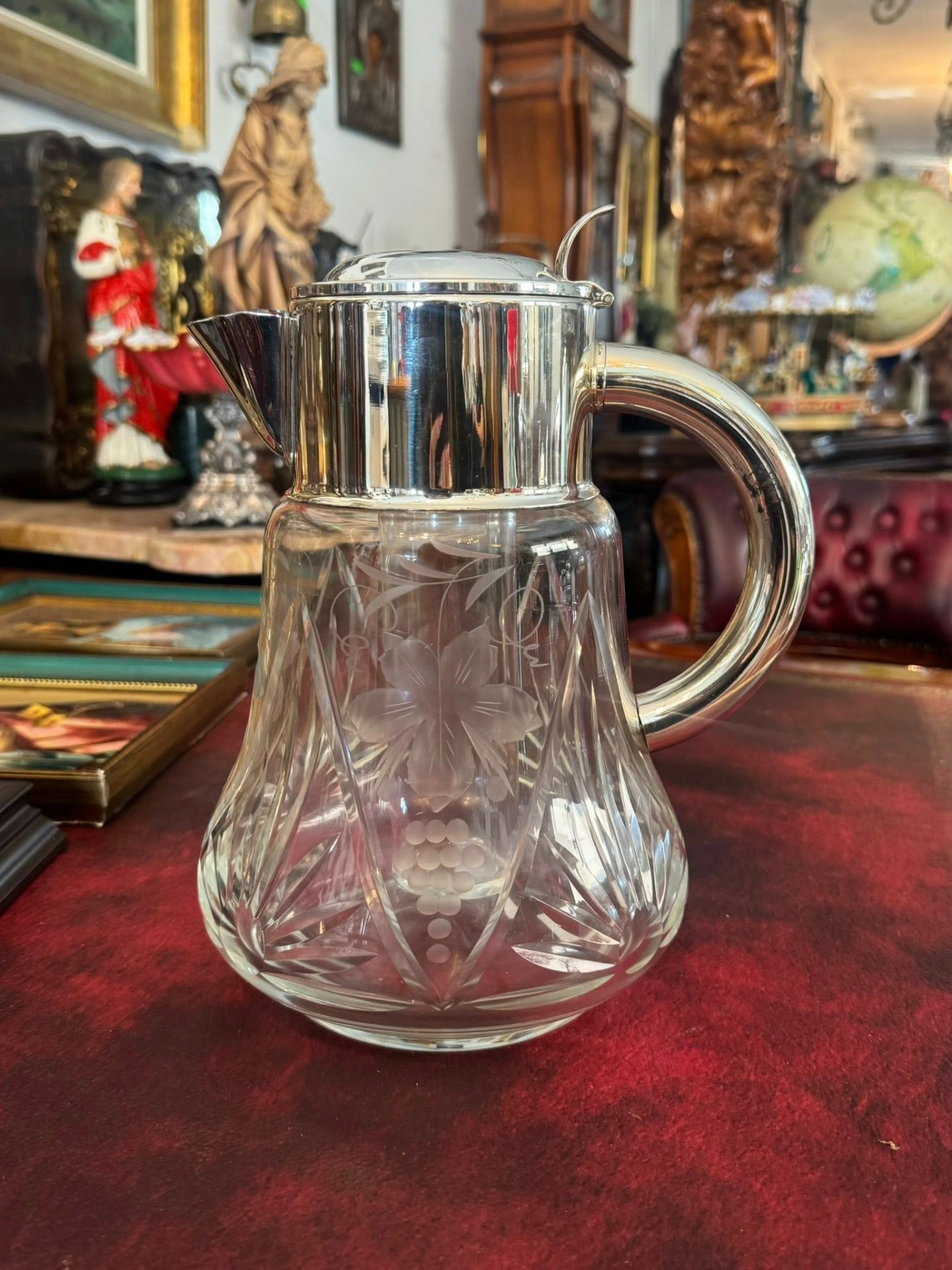 Carafă din cristal gravat cu cilindru pentru gheață și montură argintată,
