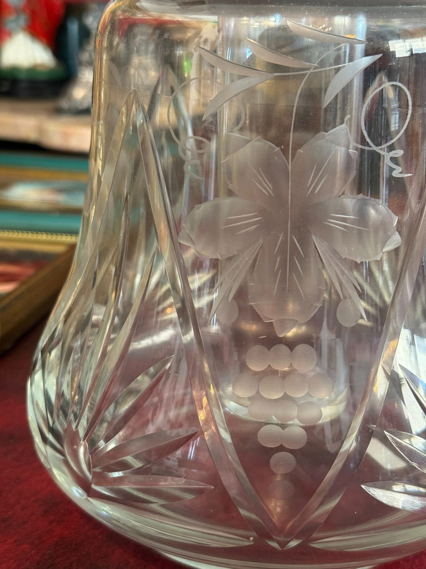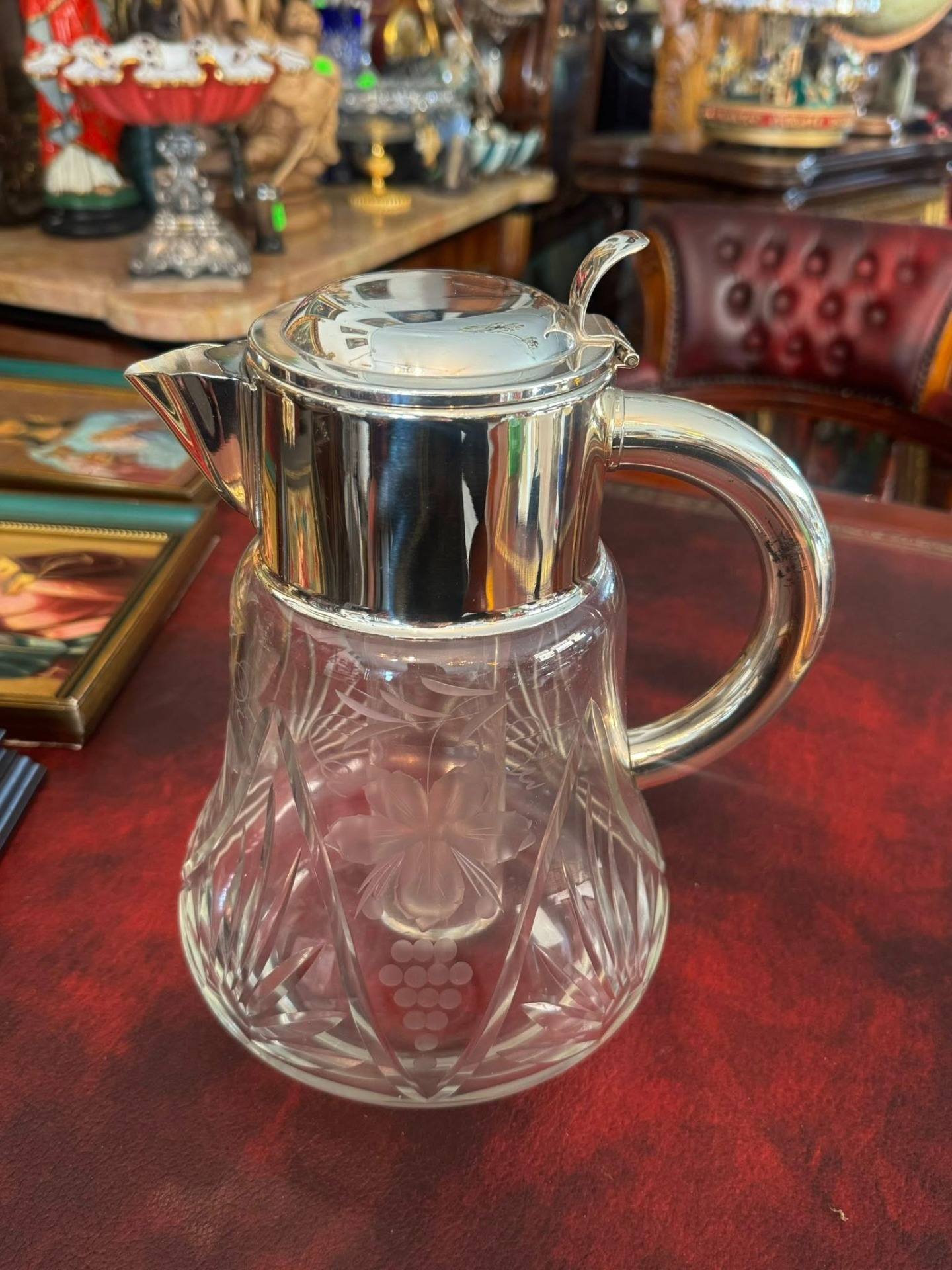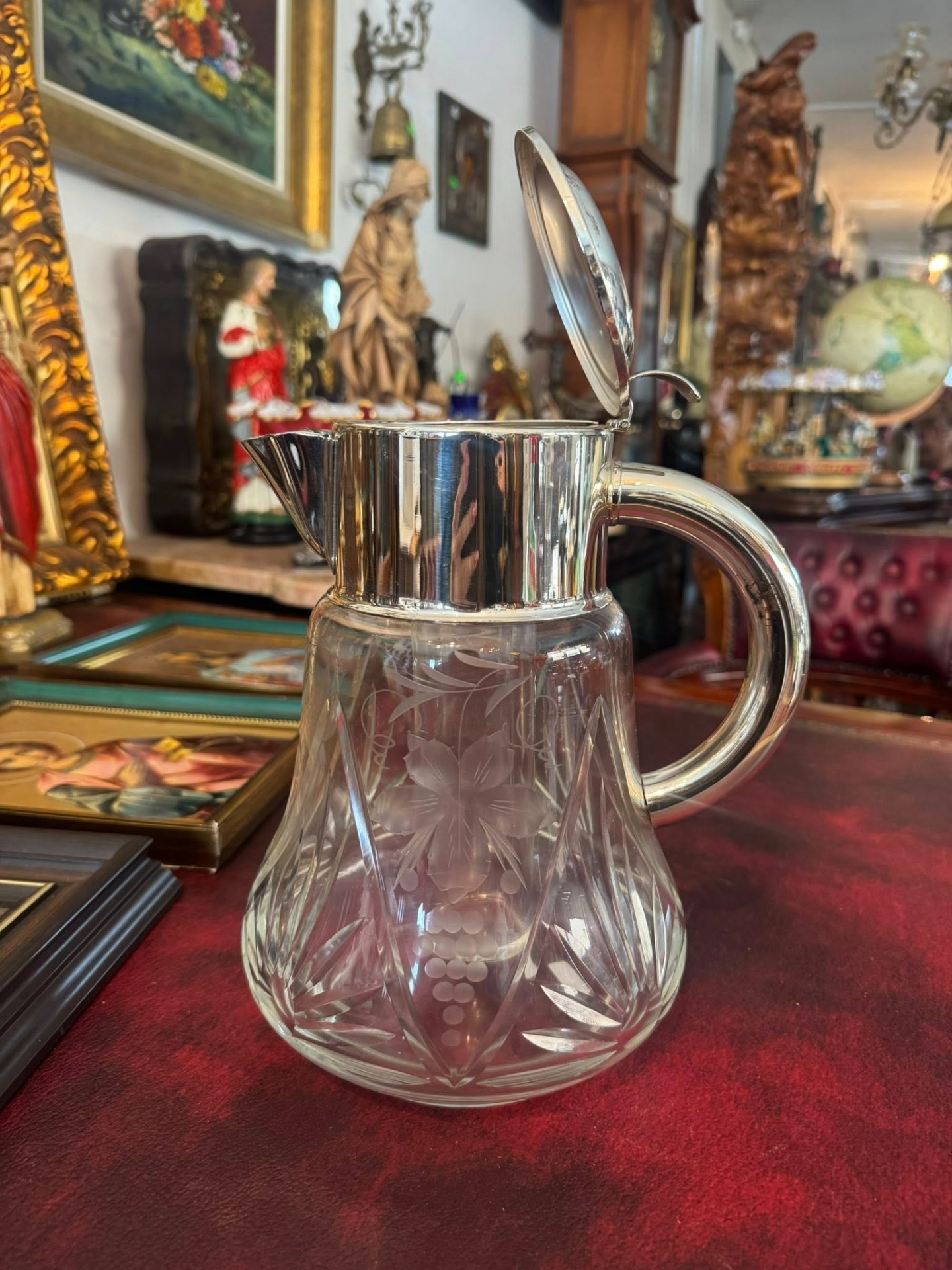 Carafă din cristal gravat cu cilindru pentru gheață și montură argintată,
