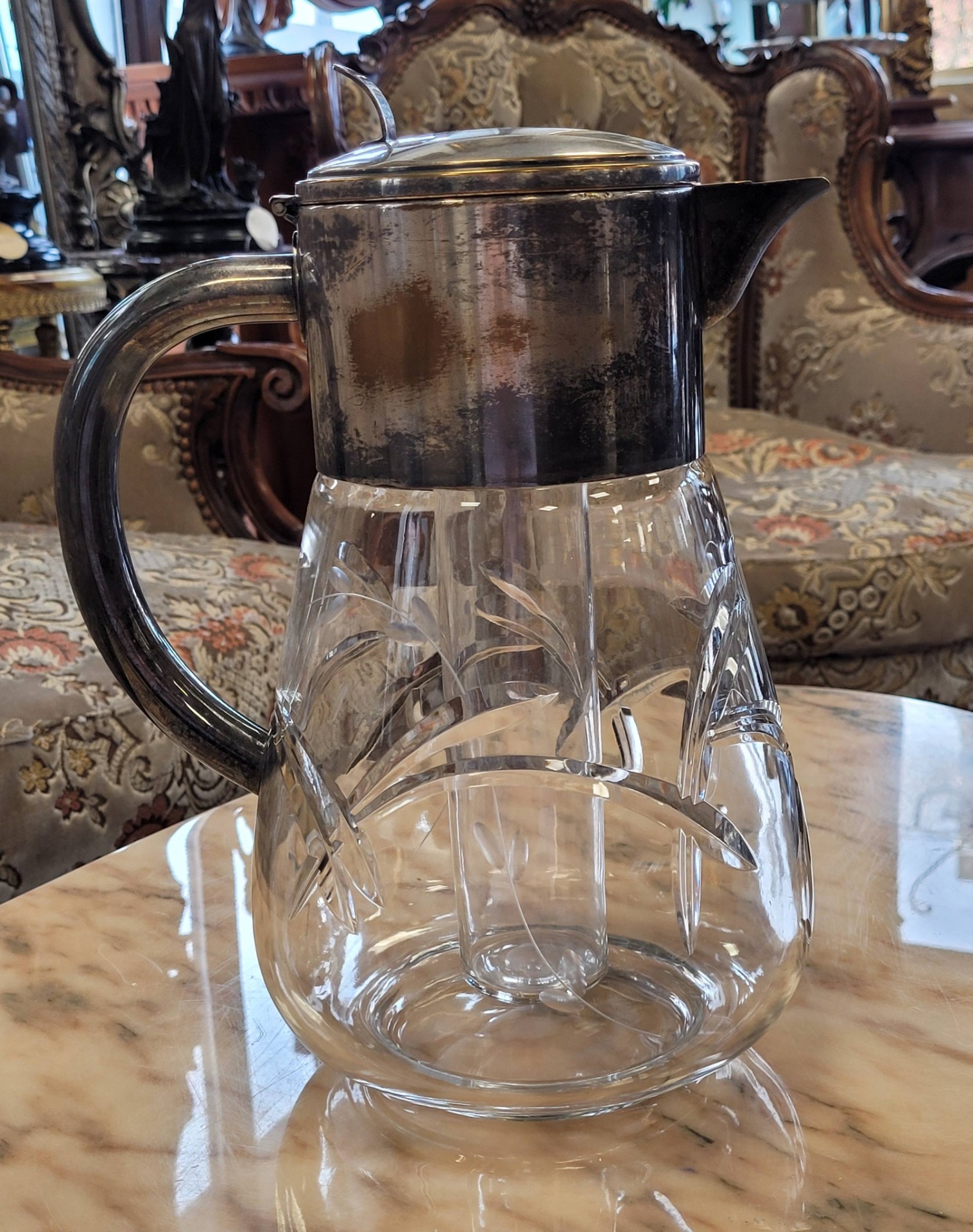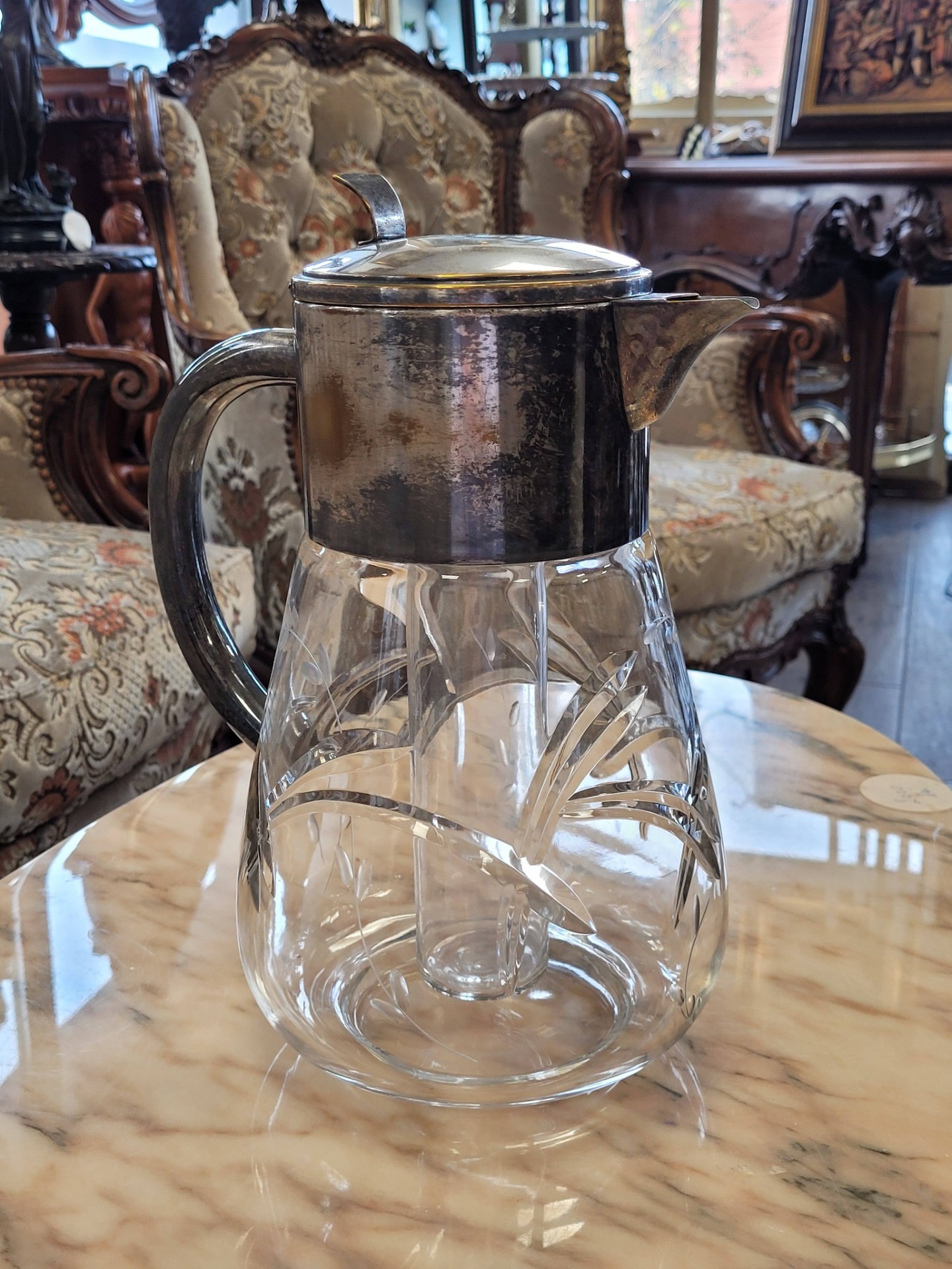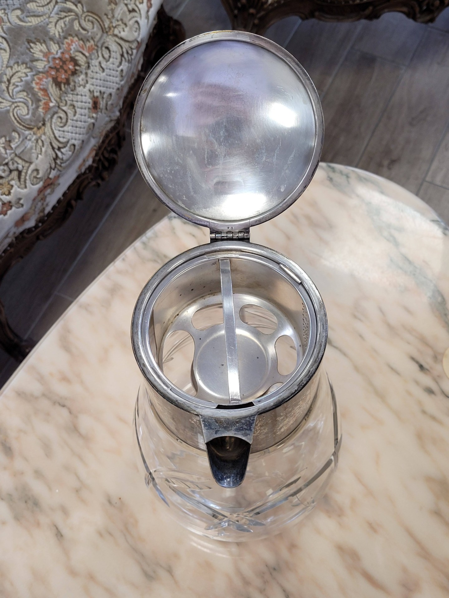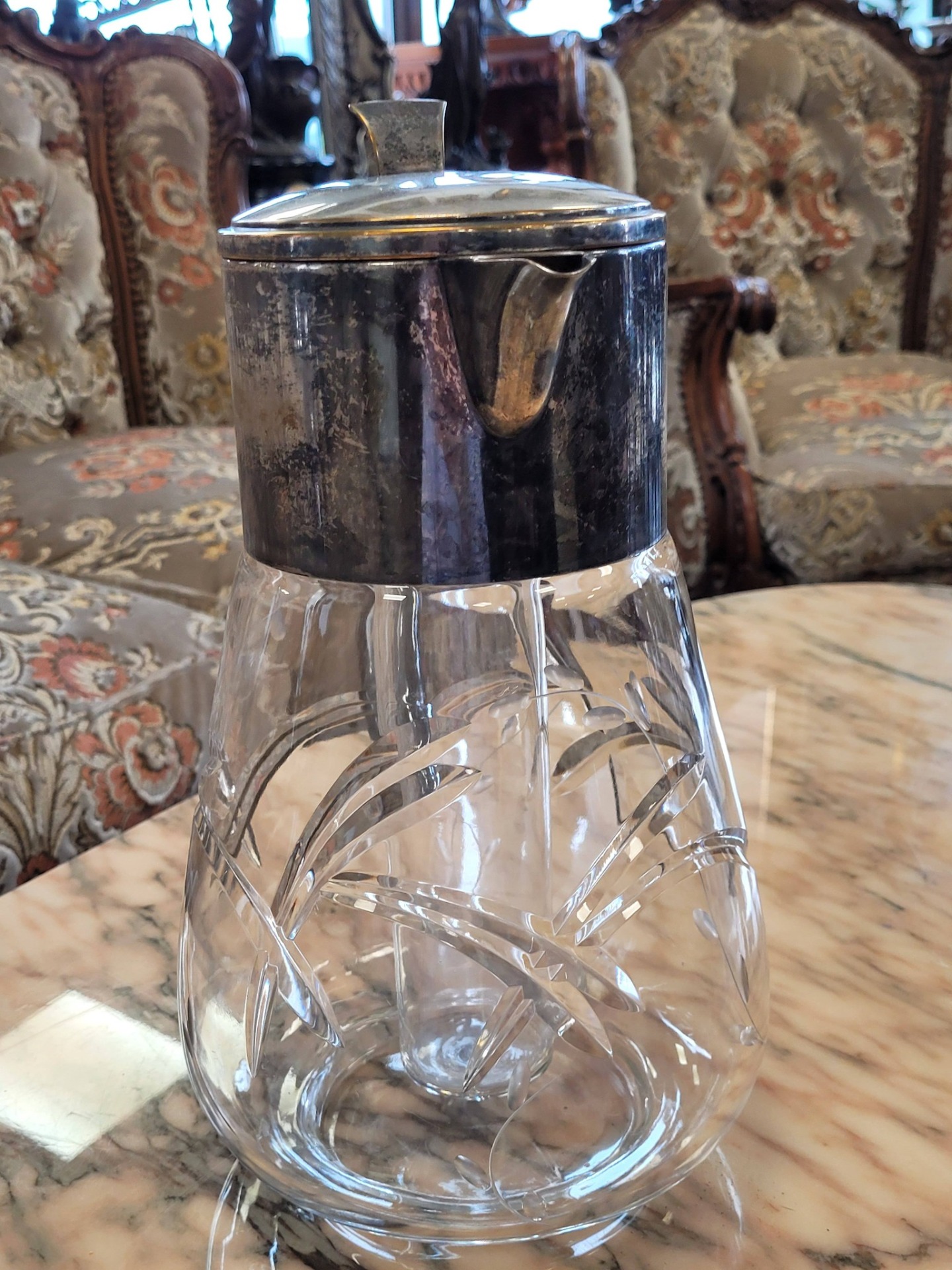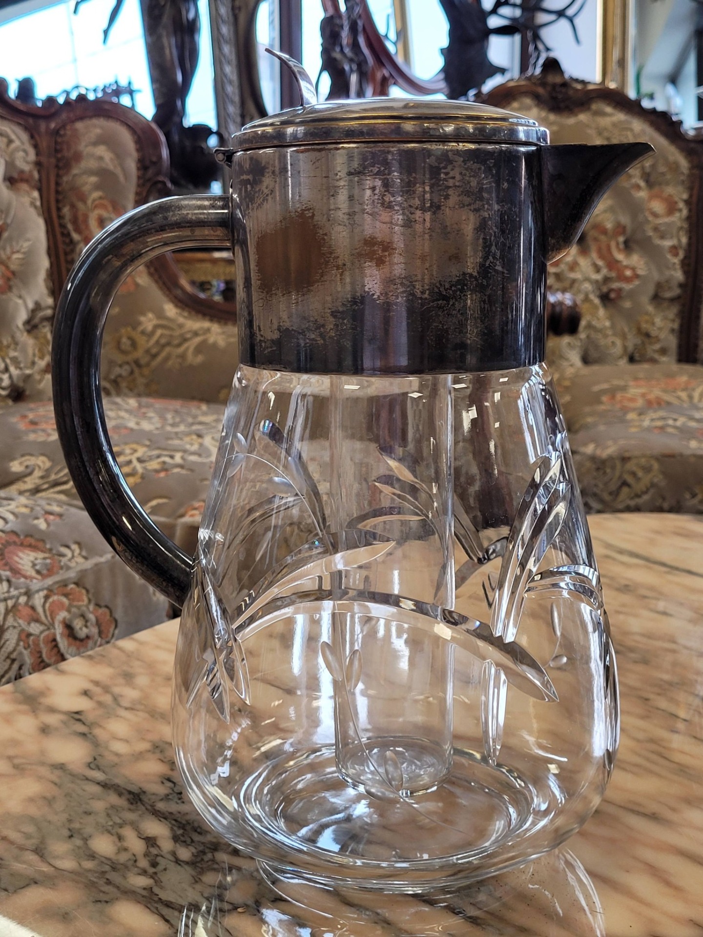 Carafă veche din cristal tăiat în montură din metal placat cu argint, cu formă elegantă, bombată. Cristalul prezintă tăieturi decorative cu motive vegetale
