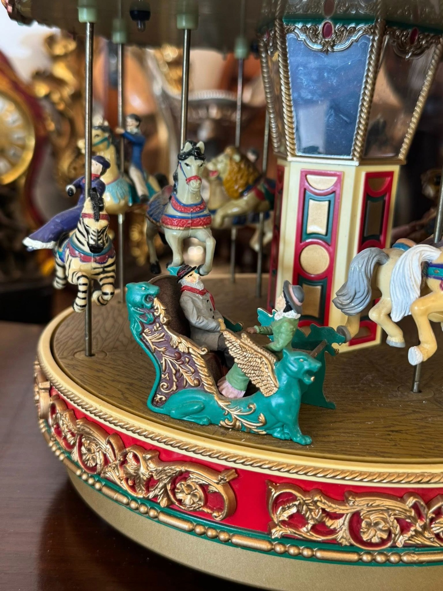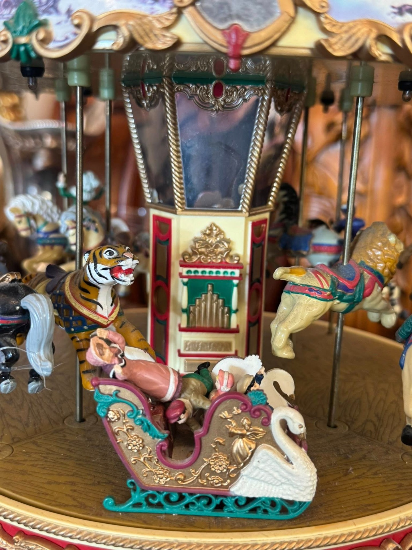 • Mecanism: Caruselul se rotește, iar figurinele (animalele) se mișcă sus-jos pe tije, imitând perfect mișcarea unui carusel real.