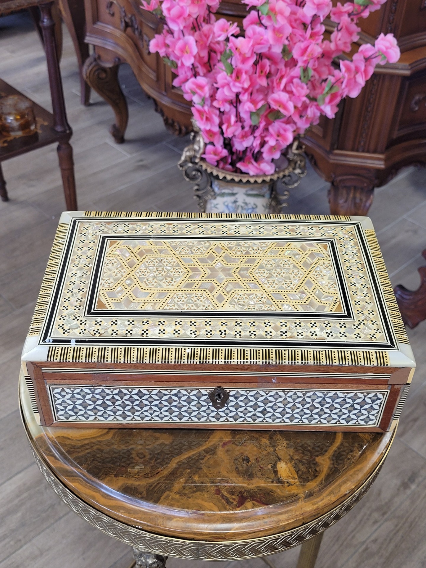 Această piesă este un exemplu superb de artă orientală, decorată prin tehnici tradiționale de micro-marchetărie.