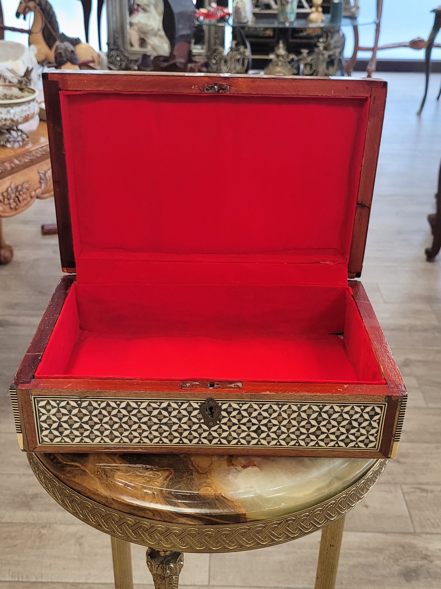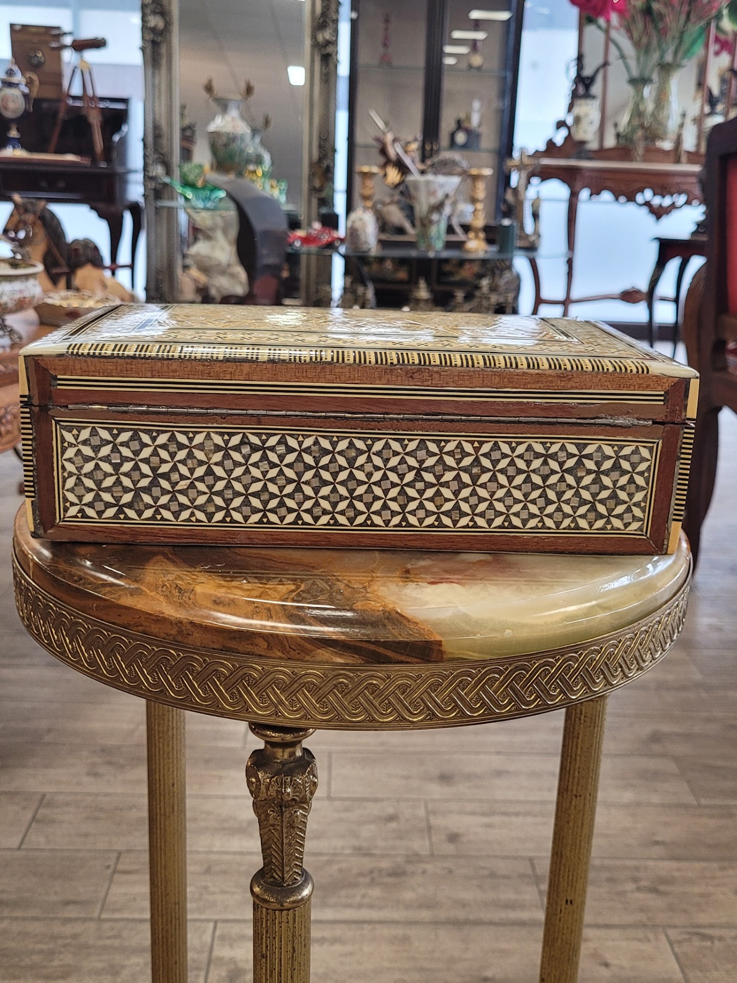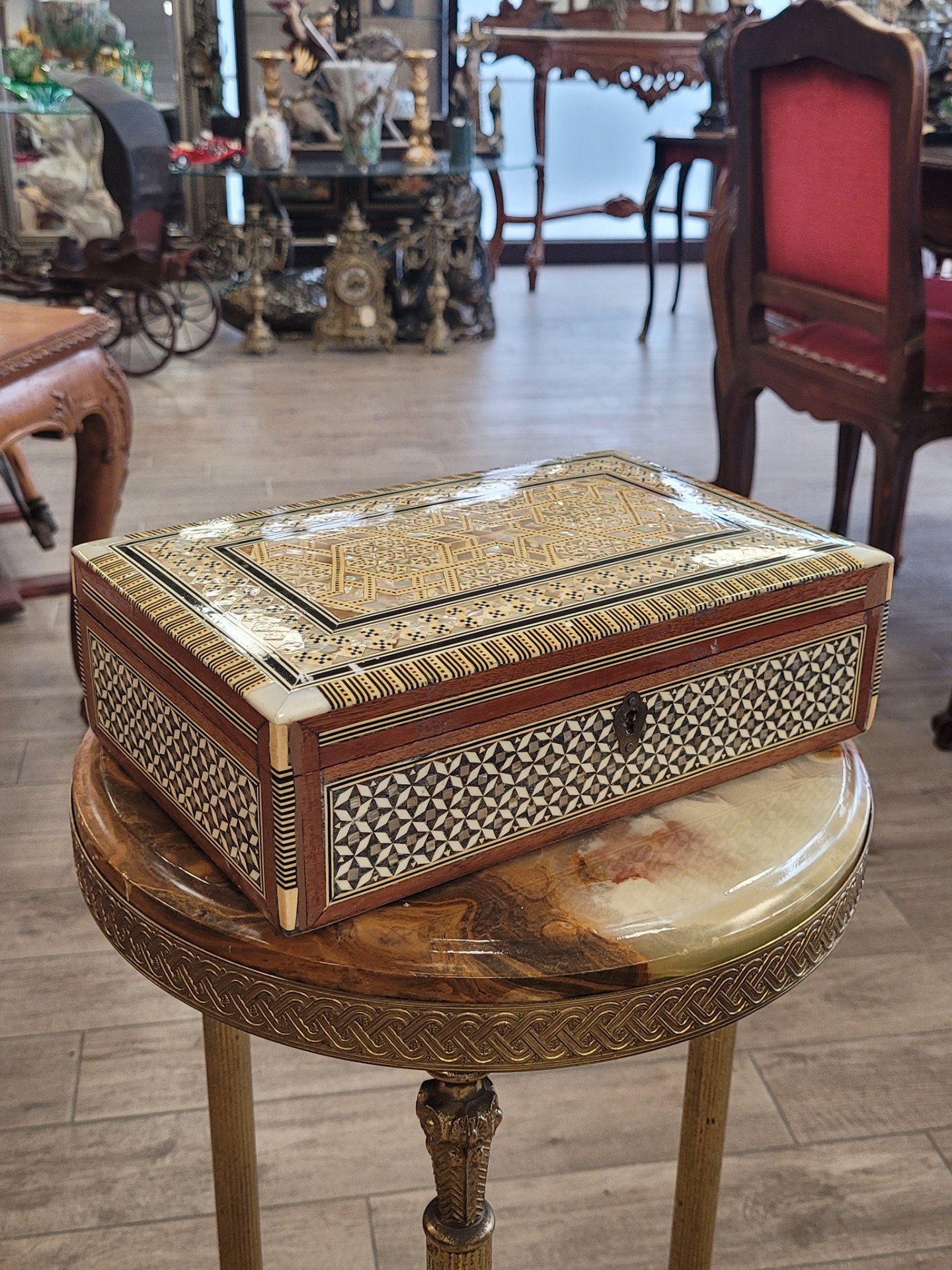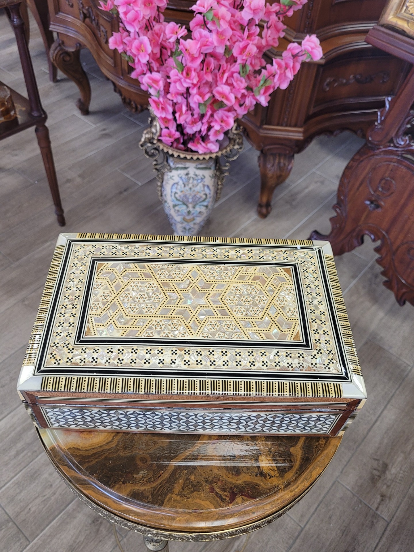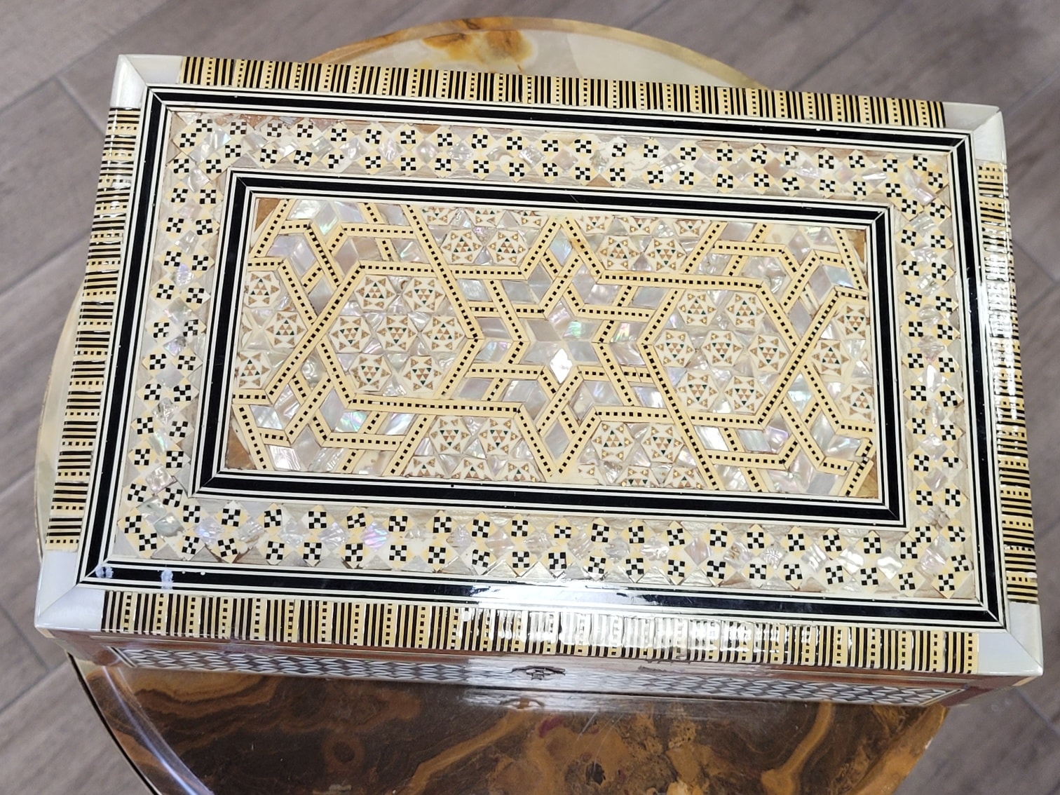lemn nobil îmbogățit cu intarsii minuțioase din sidef autentic (cu reflexii irizante), os și inserții metalice fine, cu decor geometric complex, cu motive stelate și borduri repetitive, specifice stilului Khatam sau marchetăriei siriene de Damasc.