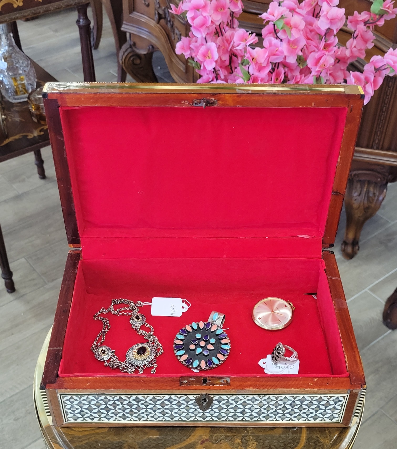 Casetă de bijuterii veche, de colecție, realizată manual cu sidef și os, din