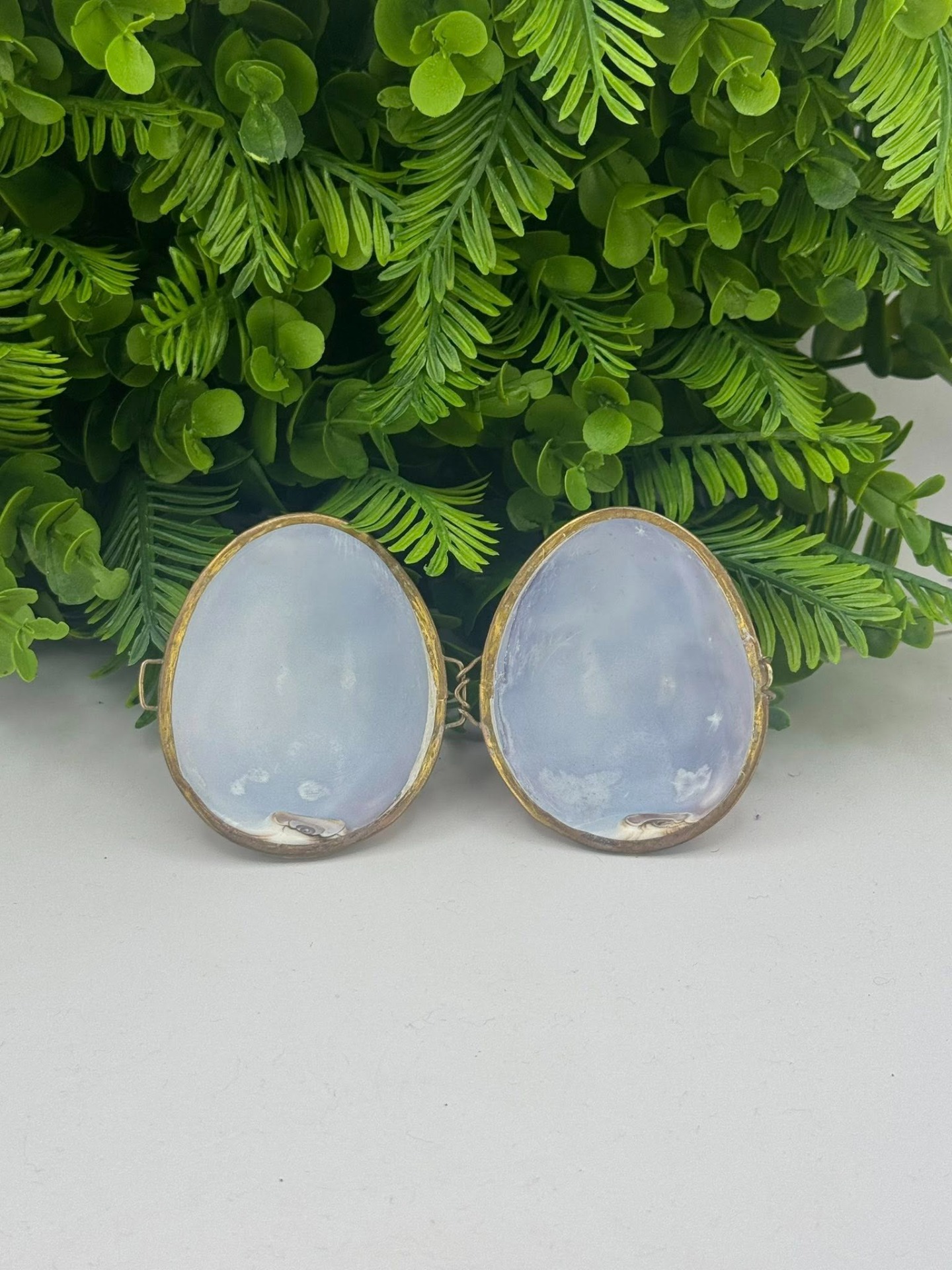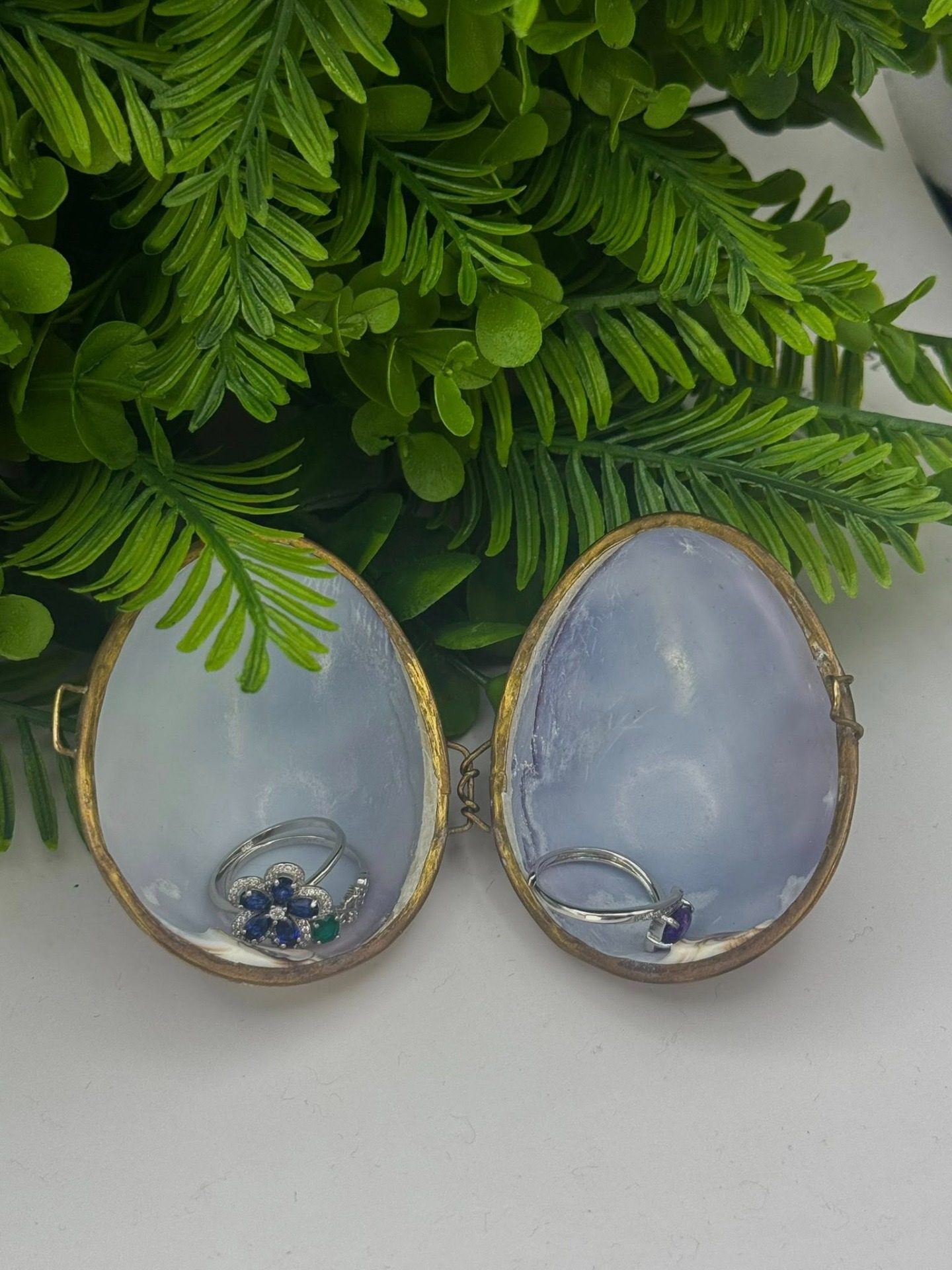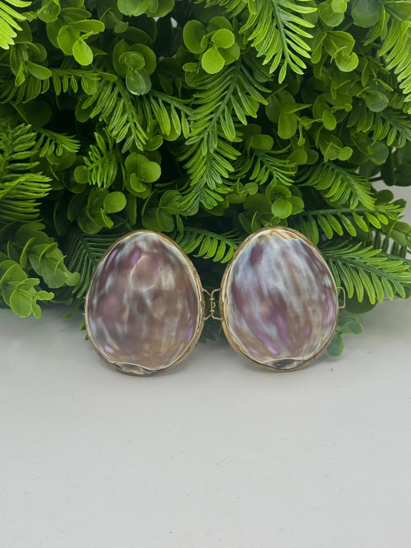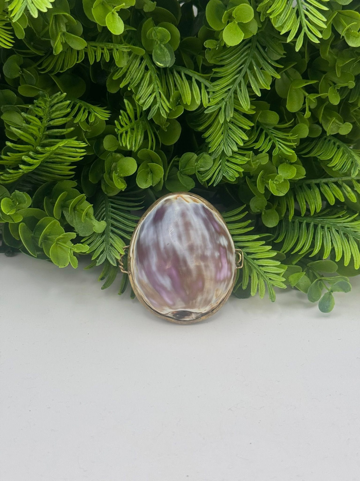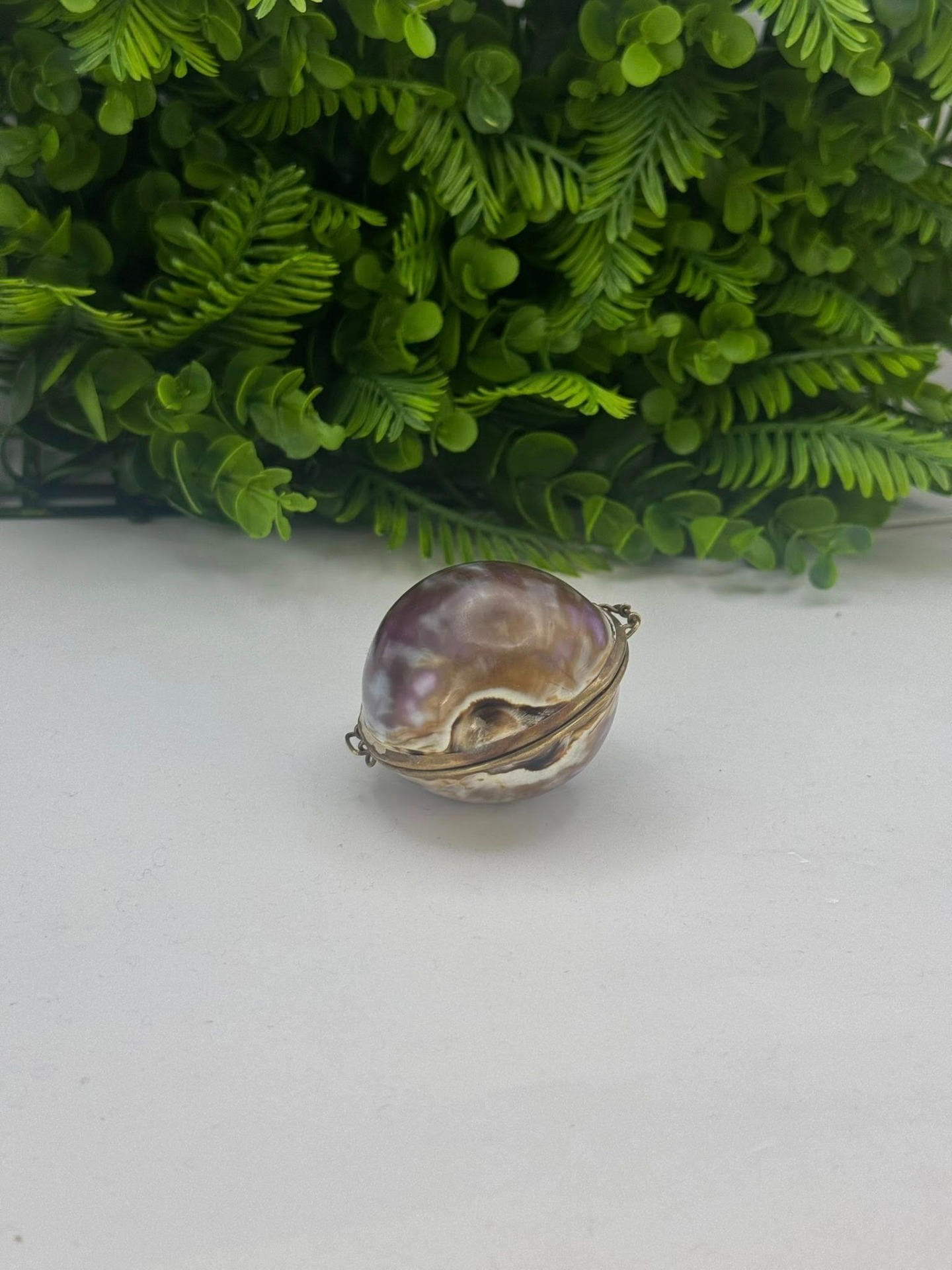 Casetă de bijuterii vintage din scoică naturală „Cypraea” cu montură în alamă -anii 1960