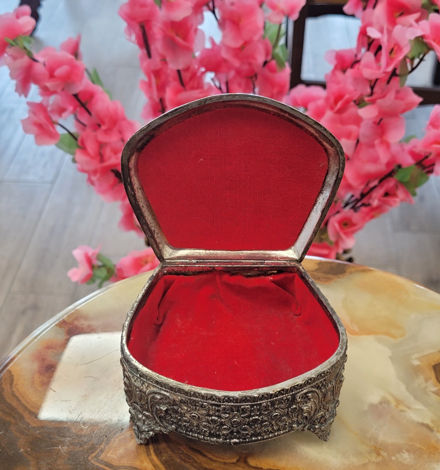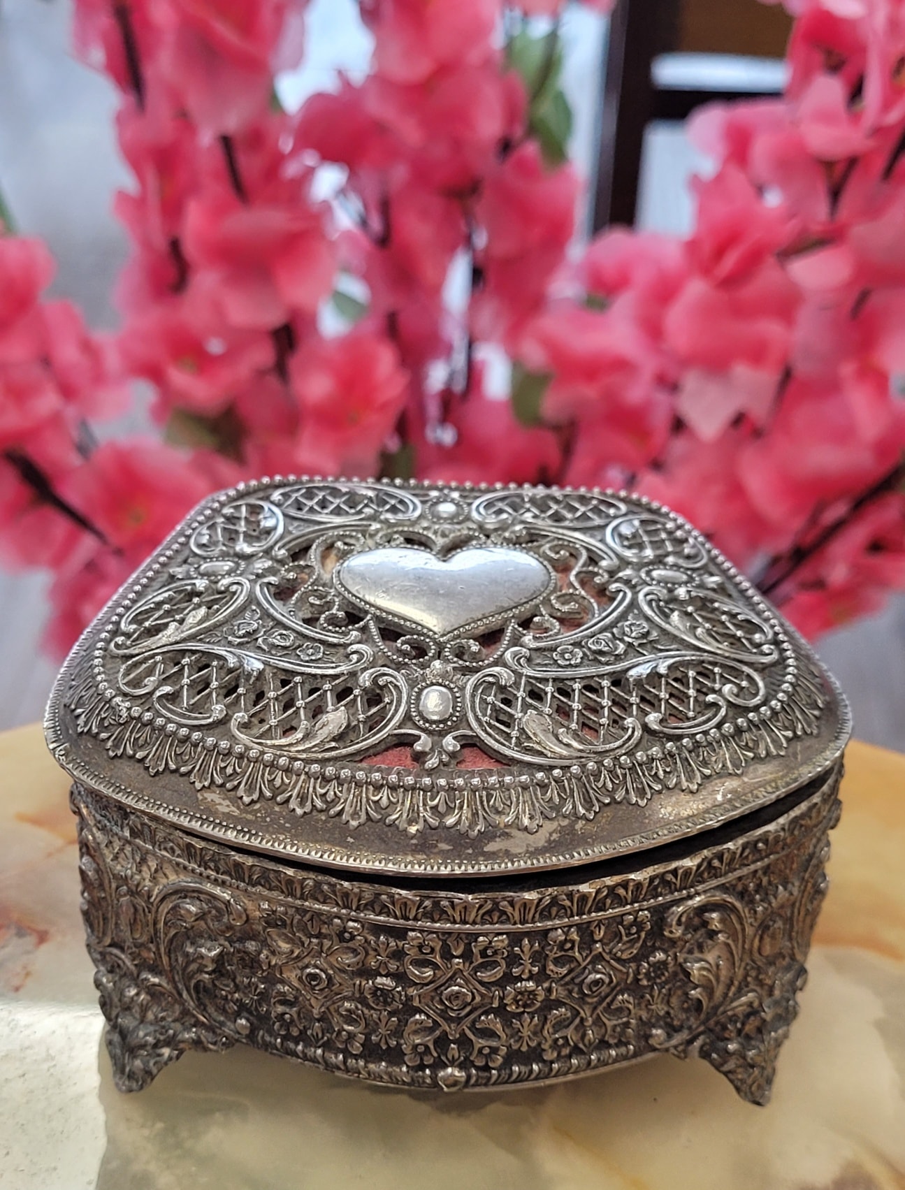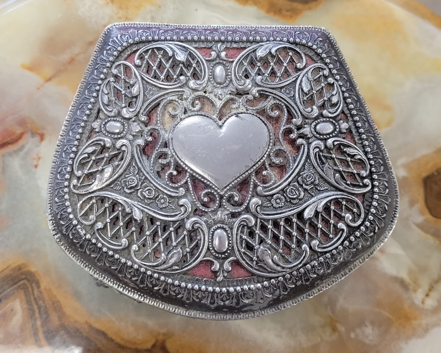 Casetă de bijuterii vintage "Romantic Heart", din metal argintat, cu interior din catifea roșie, capac decorat cu un medalion în formă de inimă netedă, înconjurat de o dantelărie metalică fină (filigranată).