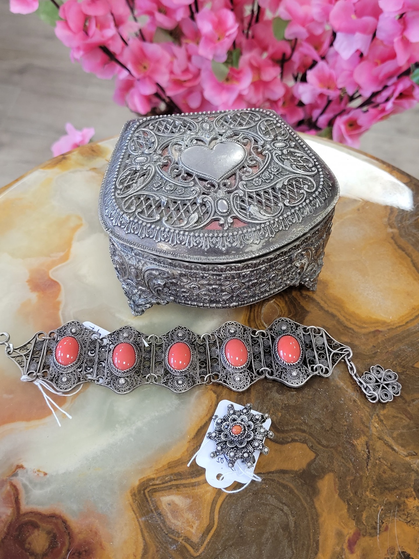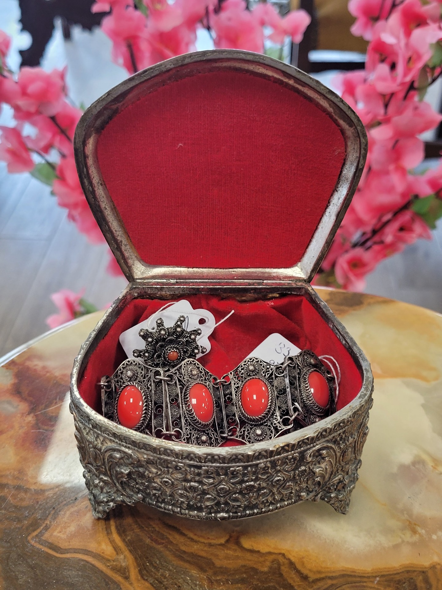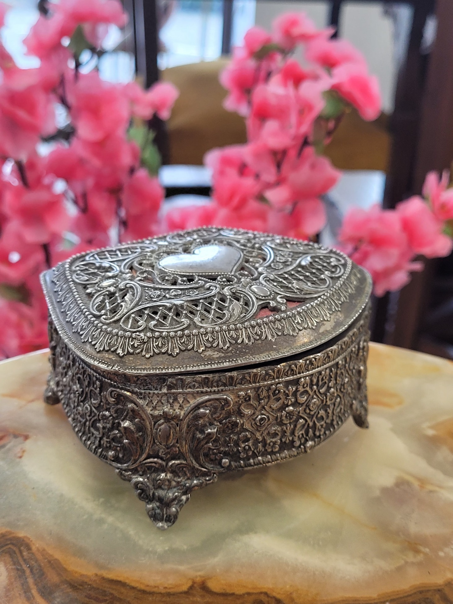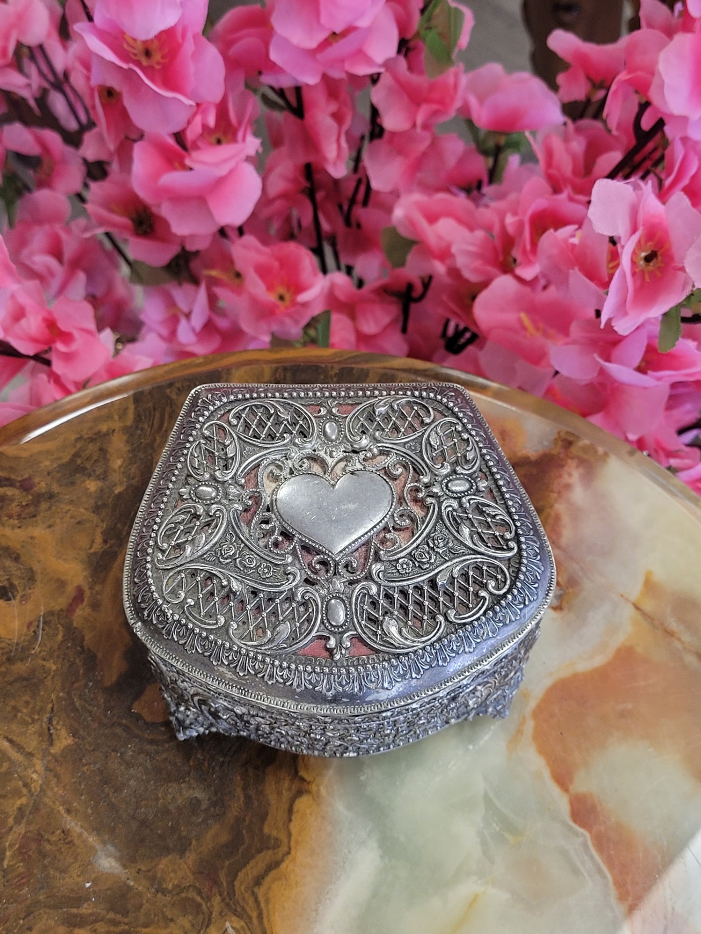 Casetă de bijuterii vintage "Romantic Heart", din metal argintat, cu interior din catifea roșie, capac decorat cu un medalion în formă de inimă netedă, înconjurat de o dantelărie metalică fină (filigranată).