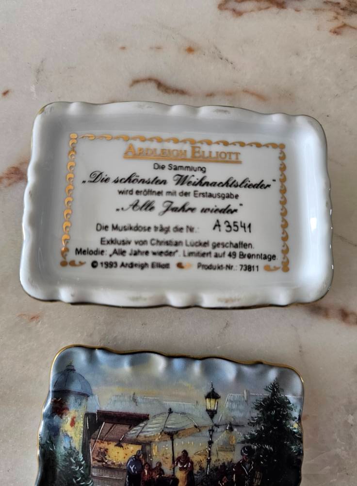 Casetă muzicală Ardleigh Elliott din colecția de Crăciun 1993, din porțelan cu pictură semnată Christian Lückel, melodie "Every year again".
