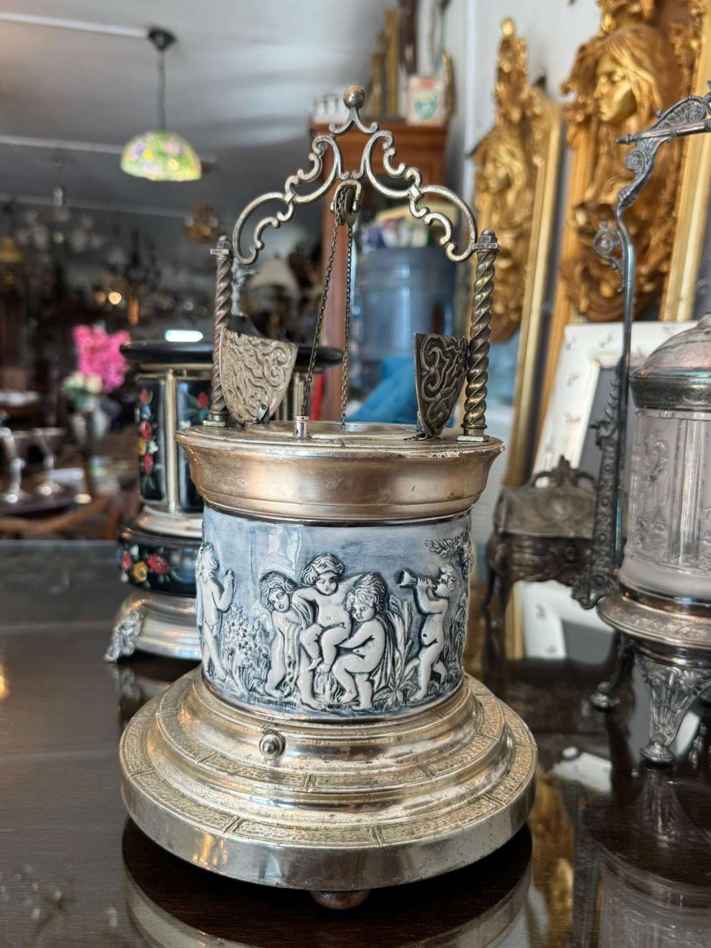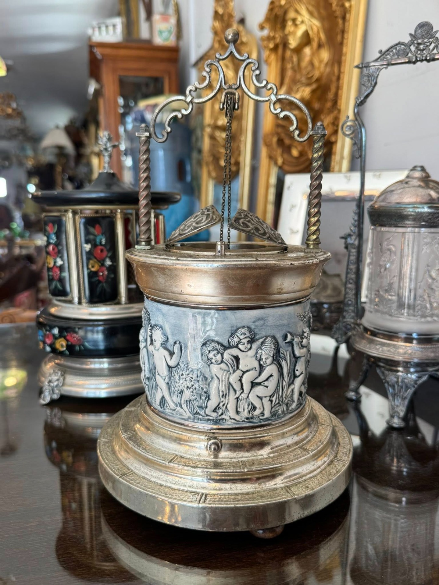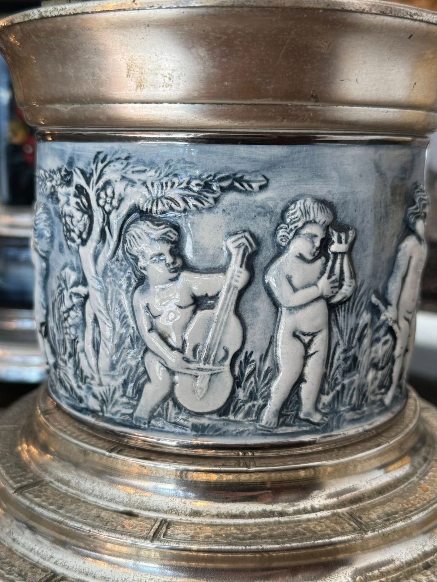 Casetă muzicală, cu suport pentru țigări. Corpul central este decorat cu un basorelief circular ce înfățișează putti (copii nudați/îngerași) în scene pastorale, cântând la instrumente (liră). Stilul este clar Neo-Clasic.