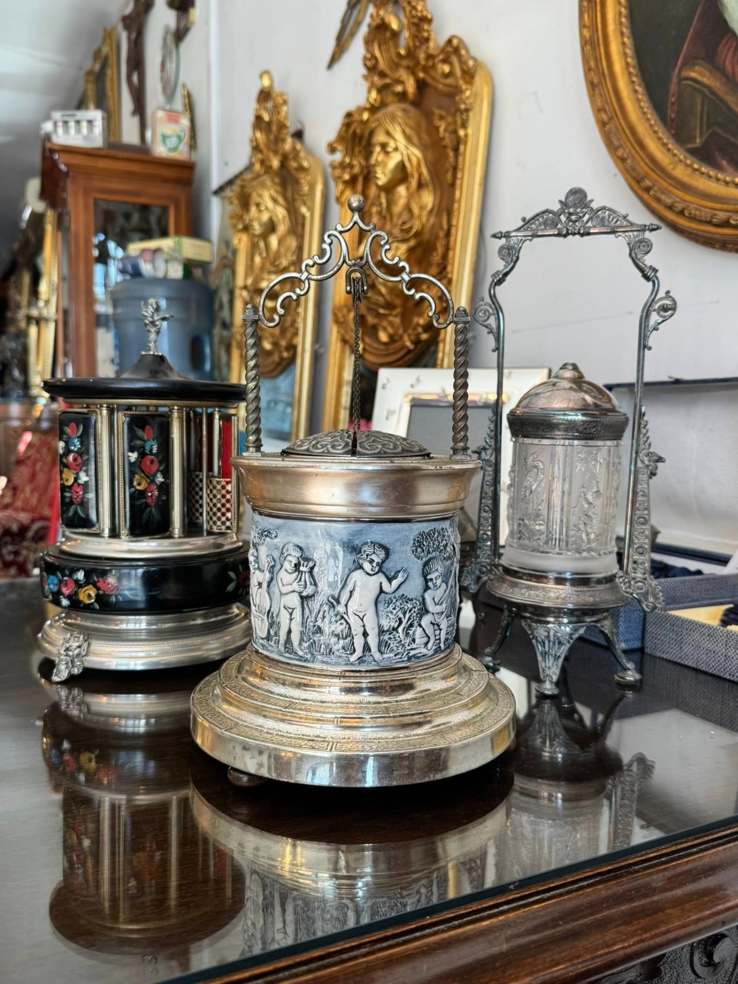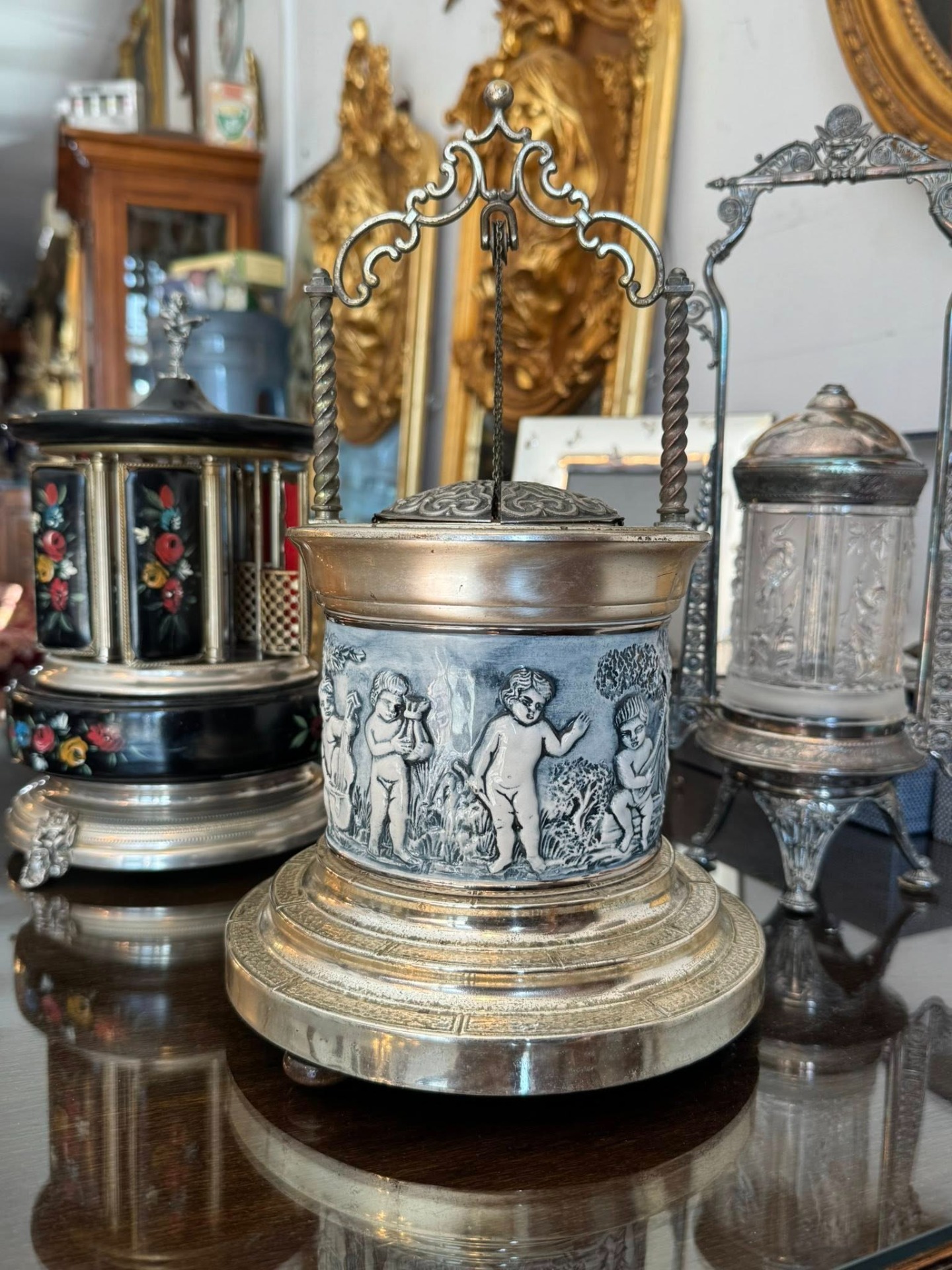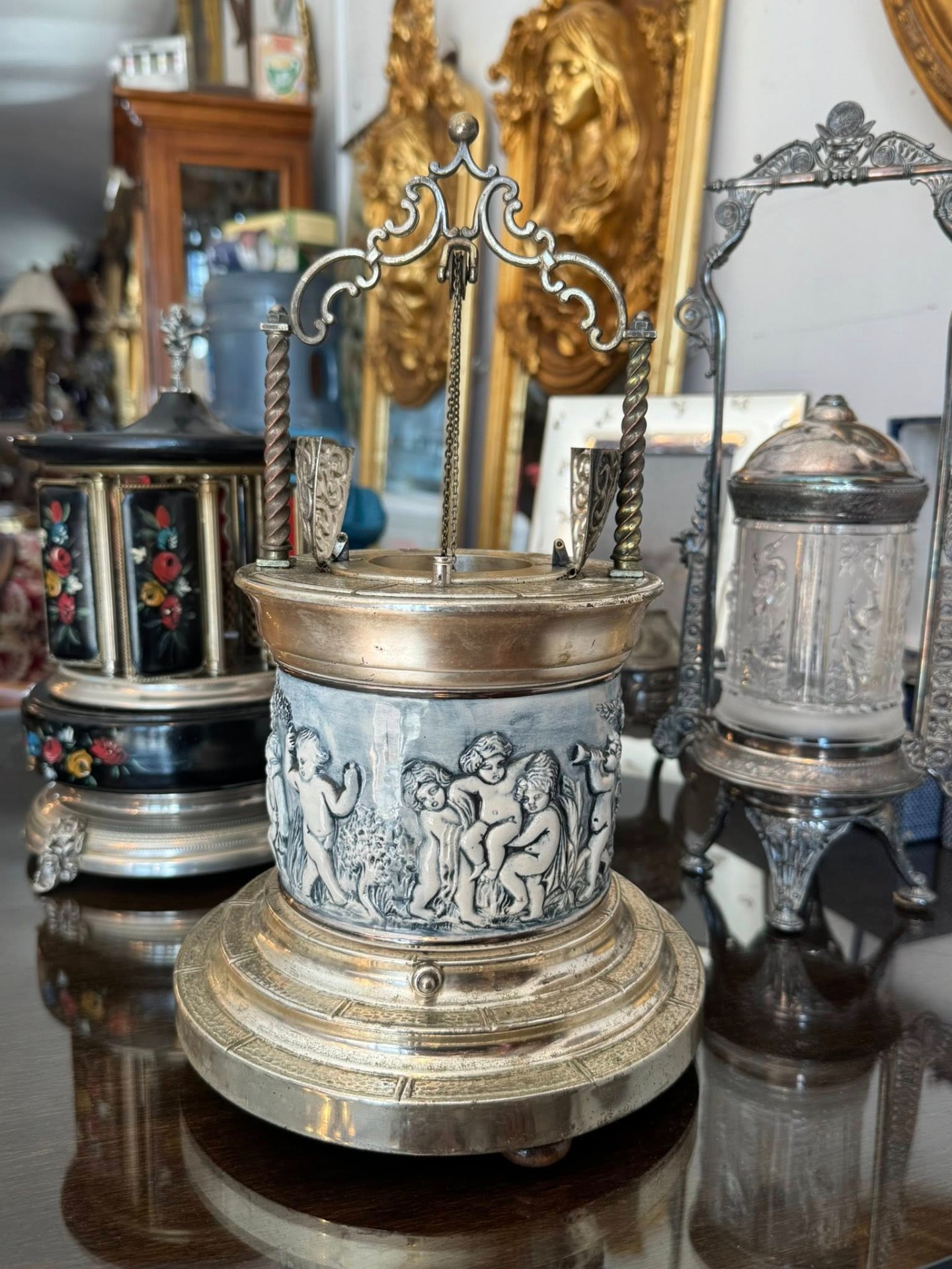 Casetă muzicală, cu suport pentru țigări. Corpul central este decorat cu un basorelief circular ce înfățișează putti (copii nudați/îngerași) în scene pastorale, cântând la instrumente (liră). Stilul este clar Neo-Clasic.